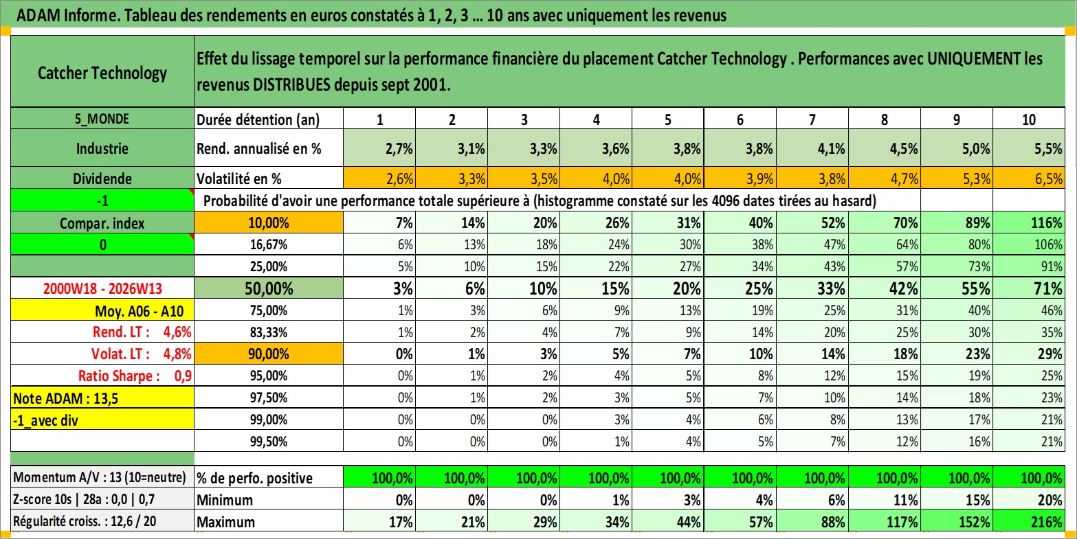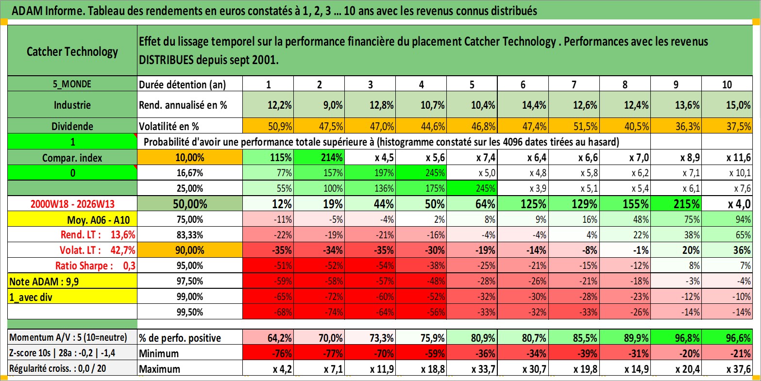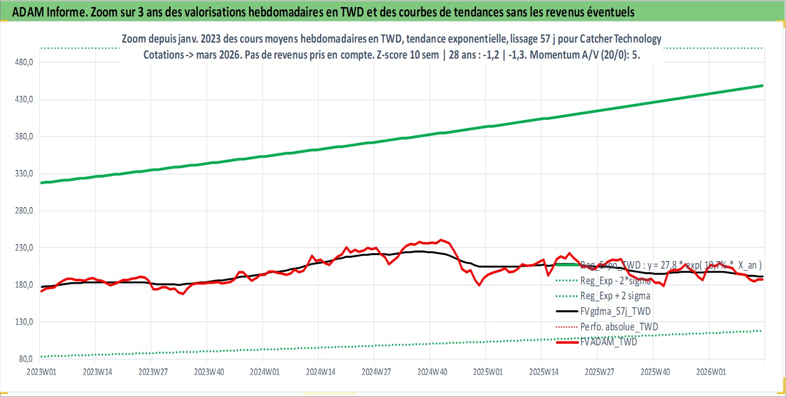 Site dédié aux investisseursPage dédiée sur site financeAnalyse des valorisations hebdomadaires de l'action Catcher Technology . Cet actif est cote en TWD. Les valorisations sont en contrevaleur EURO et couvrent les semaines 2000W18 a 2026W13. Les revenus de cet actif financier sont pris en compte depuis la semaine 2001W36. La note globale ESG de cet actif est estimee a 12.0 (apres rebasage entre 0 et 20).