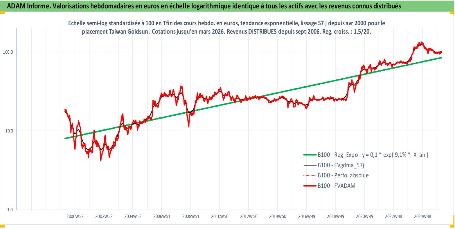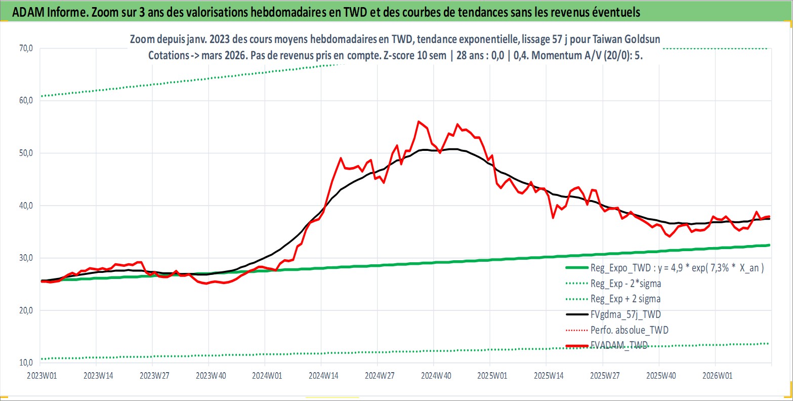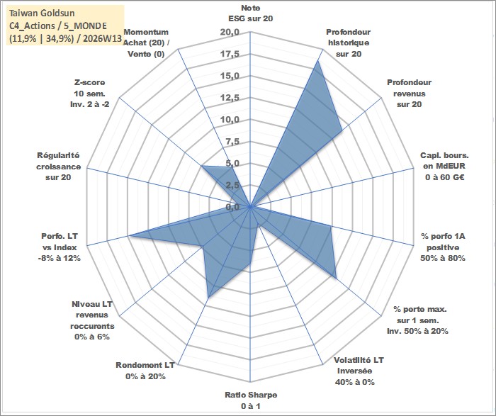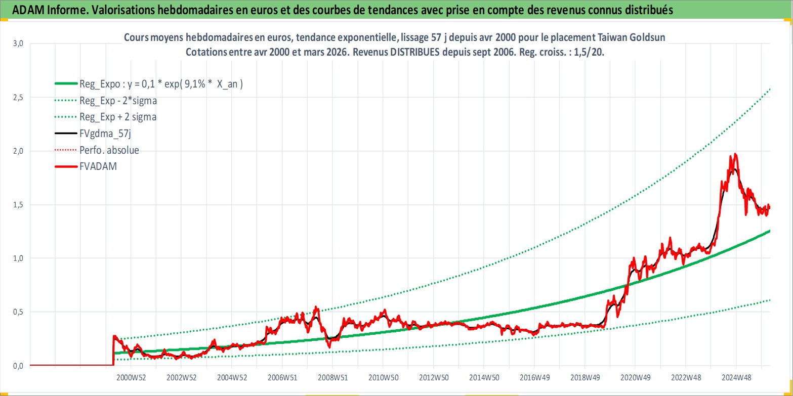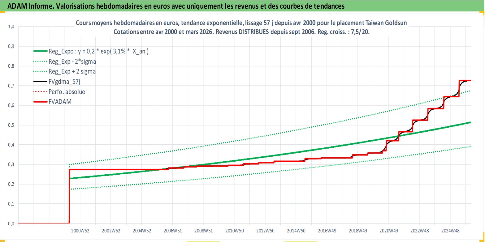 Site dédié aux investisseursPage dédiée sur site financeAnalyse des valorisations hebdomadaires de l'action Taiwan Goldsun . Cet actif est cote en TWD. Les valorisations sont en contrevaleur EURO et couvrent les semaines 2000W16 a 2026W13. Les revenus de cet actif financier sont pris en compte depuis la semaine 2006W37. La note ESG de cet actif n'est pas connue.