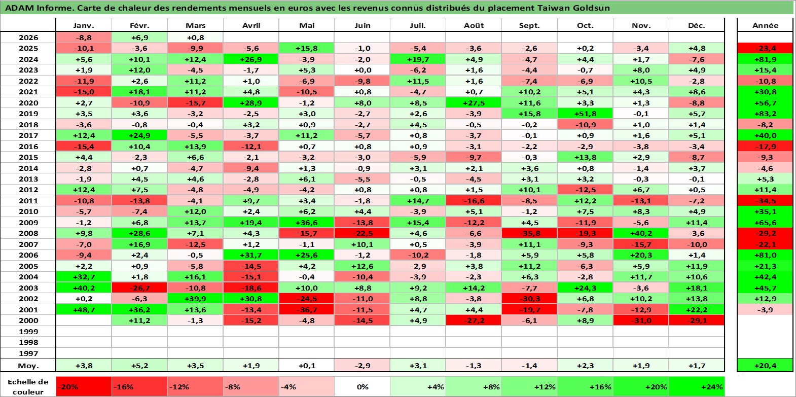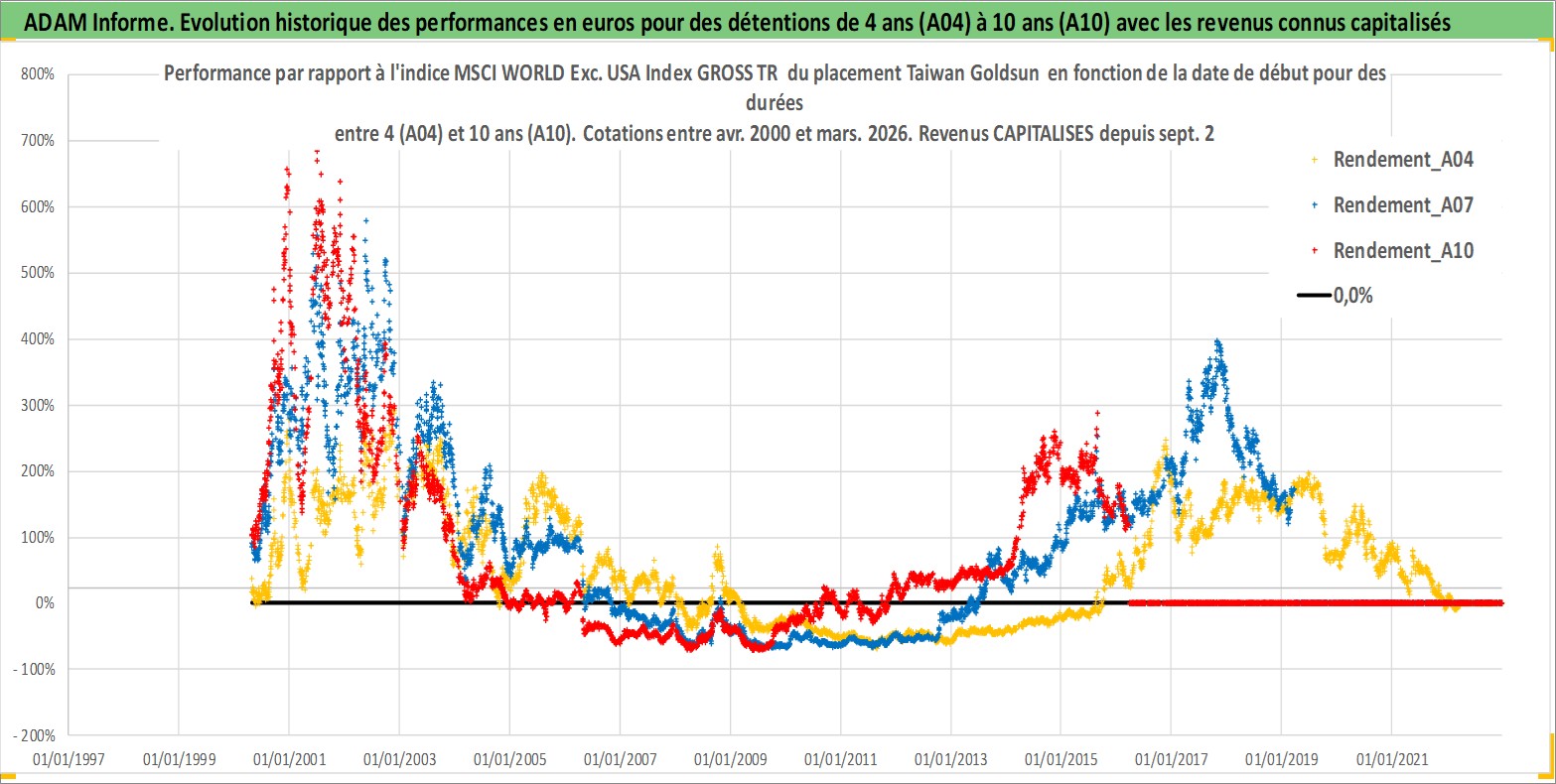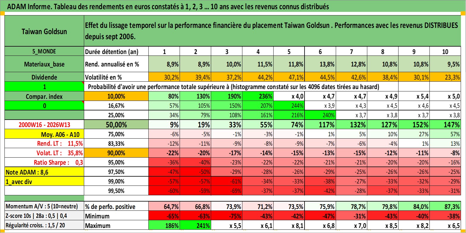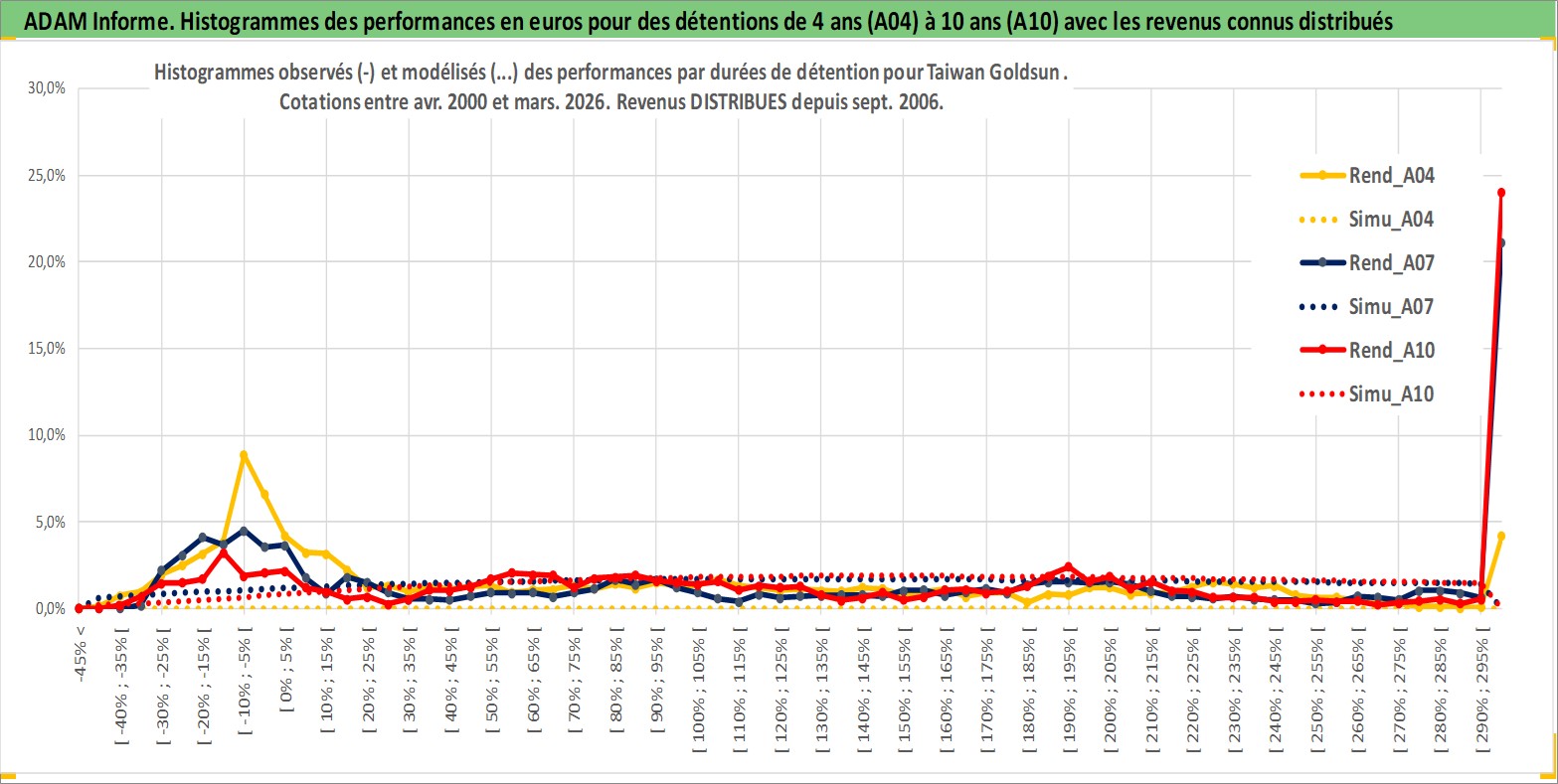 Site dédié aux investisseursPage dédiée sur site financeAnalyse des valorisations hebdomadaires de l'action Taiwan Goldsun . Cet actif est cote en TWD. Les valorisations sont en contrevaleur EURO et couvrent les semaines 2000W16 a 2026W13. Les revenus de cet actif financier sont pris en compte depuis la semaine 2006W37. La note ESG de cet actif n'est pas connue.