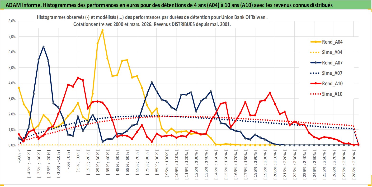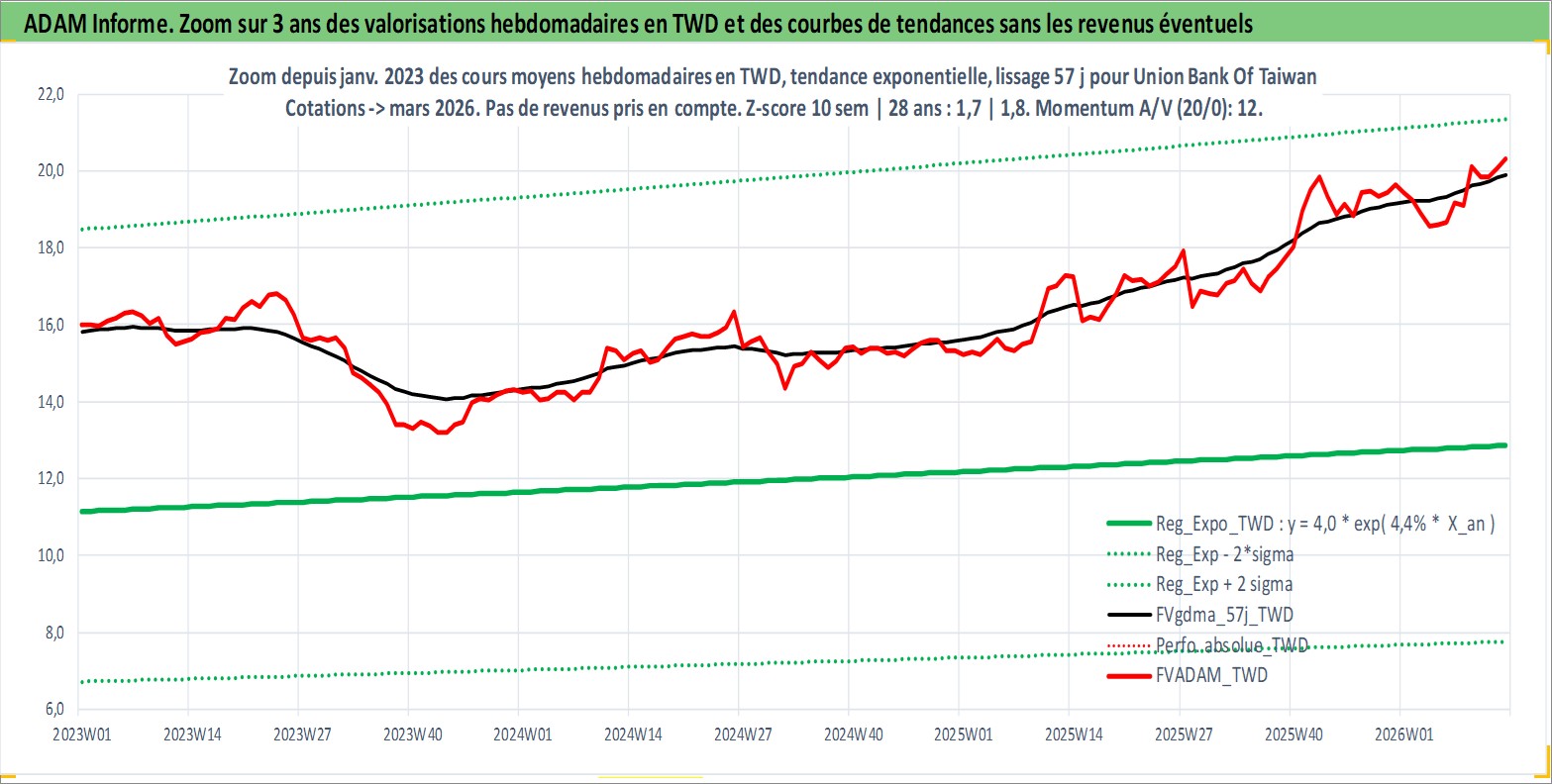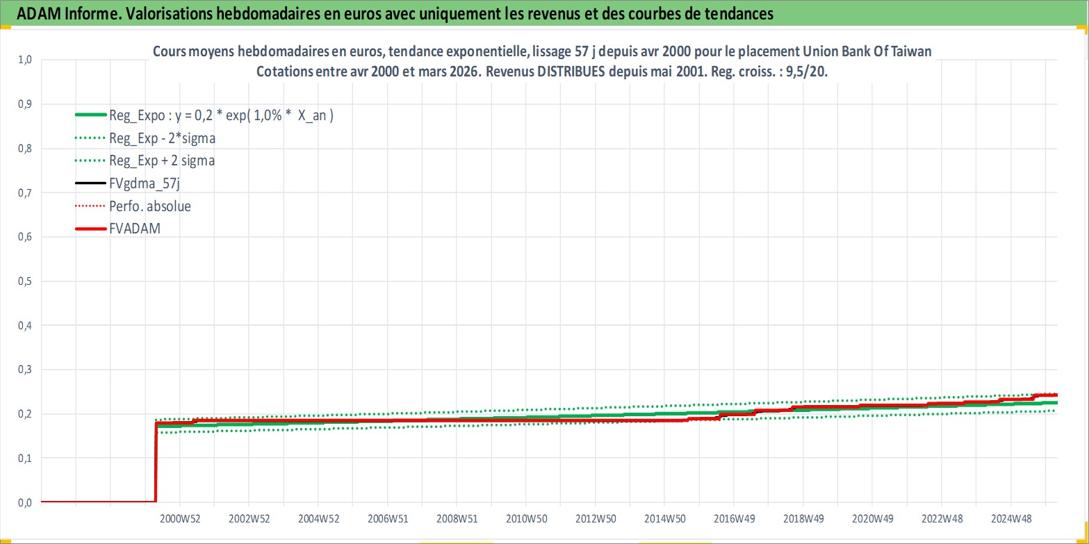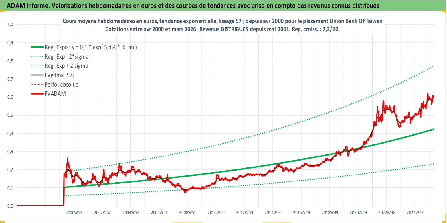 Site dédié aux investisseursPage dédiée sur site financeAnalyse des valorisations hebdomadaires de l'action Union Bank Of Taiwan . Cet actif est cote en TWD. Les valorisations sont en contrevaleur EURO et couvrent les semaines 2000W16 a 2026W13. Les revenus de cet actif financier sont pris en compte depuis la semaine 2001W20. La note ESG de cet actif n'est pas connue.
