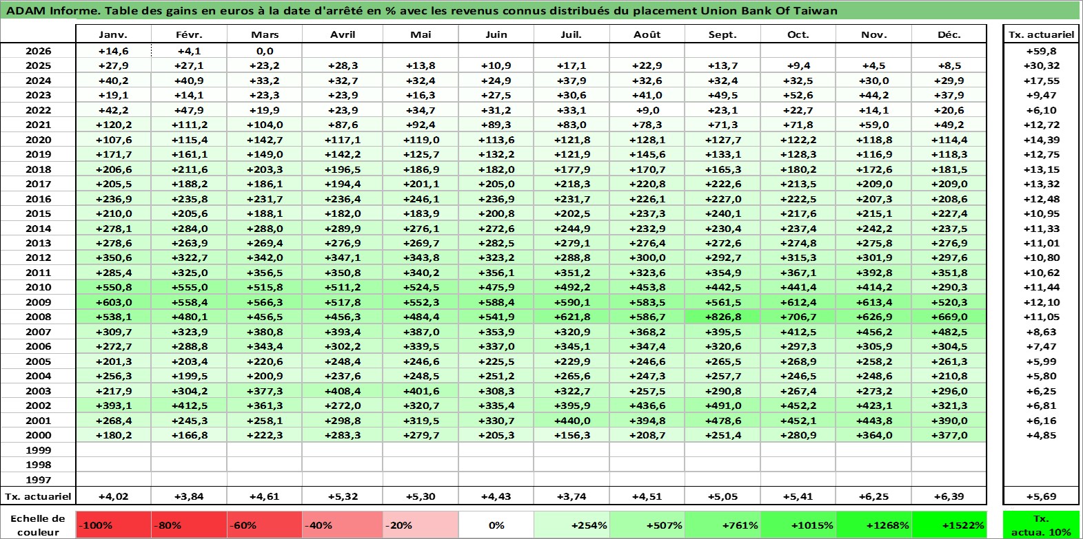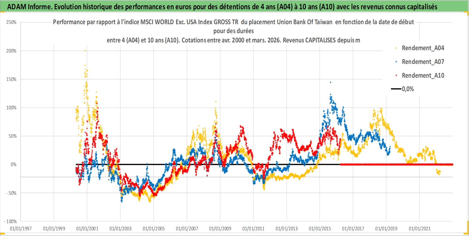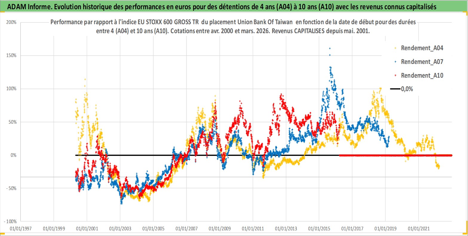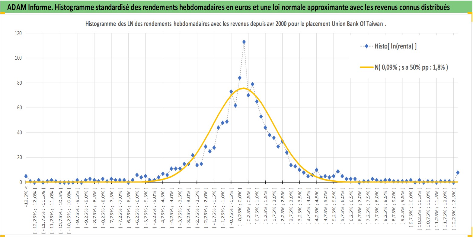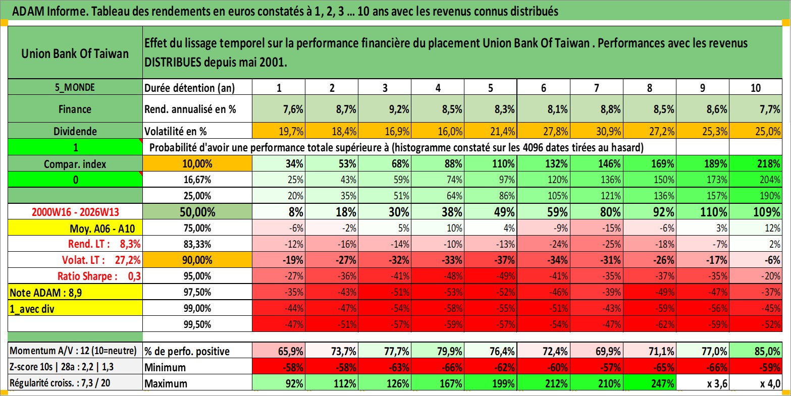 Site dédié aux investisseursPage dédiée sur site financeAnalyse des valorisations hebdomadaires de l'action Union Bank Of Taiwan . Cet actif est cote en TWD. Les valorisations sont en contrevaleur EURO et couvrent les semaines 2000W16 a 2026W13. Les revenus de cet actif financier sont pris en compte depuis la semaine 2001W20. La note ESG de cet actif n'est pas connue.