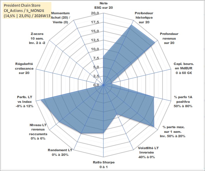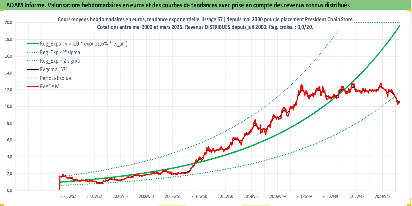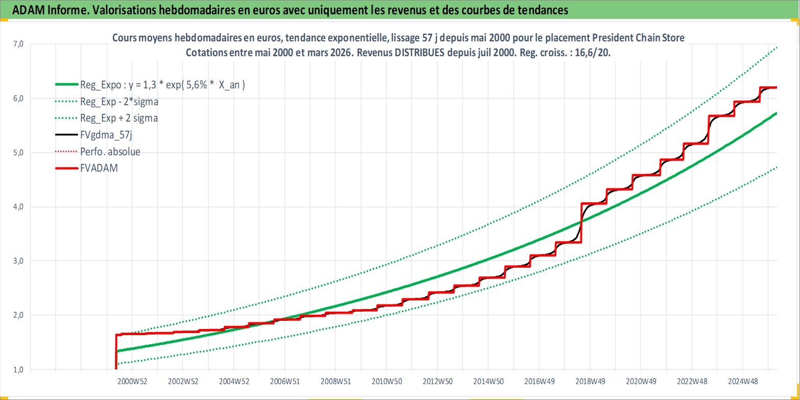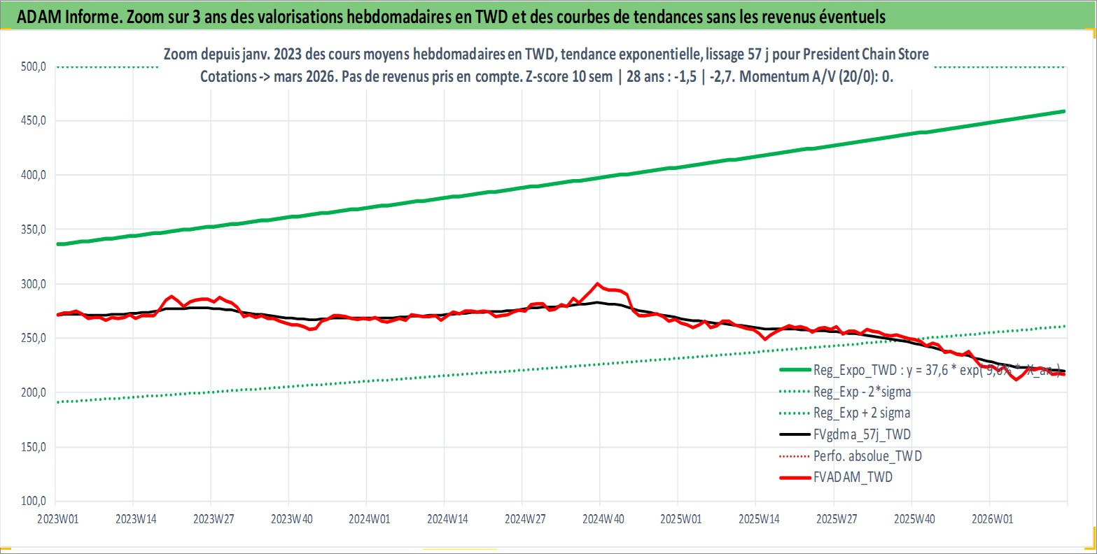 Site dédié aux investisseursPage dédiée sur site financeAnalyse des valorisations hebdomadaires de l'action President Chain Store . Cet actif est cote en TWD. Les valorisations sont en contrevaleur EURO et couvrent les semaines 2000W19 a 2026W13. Les revenus de cet actif financier sont pris en compte depuis la semaine 2000W30. La note globale ESG de cet actif est estimee a 8.0 (apres rebasage entre 0 et 20).
