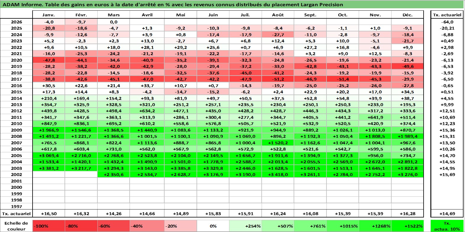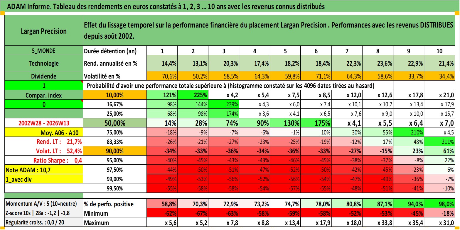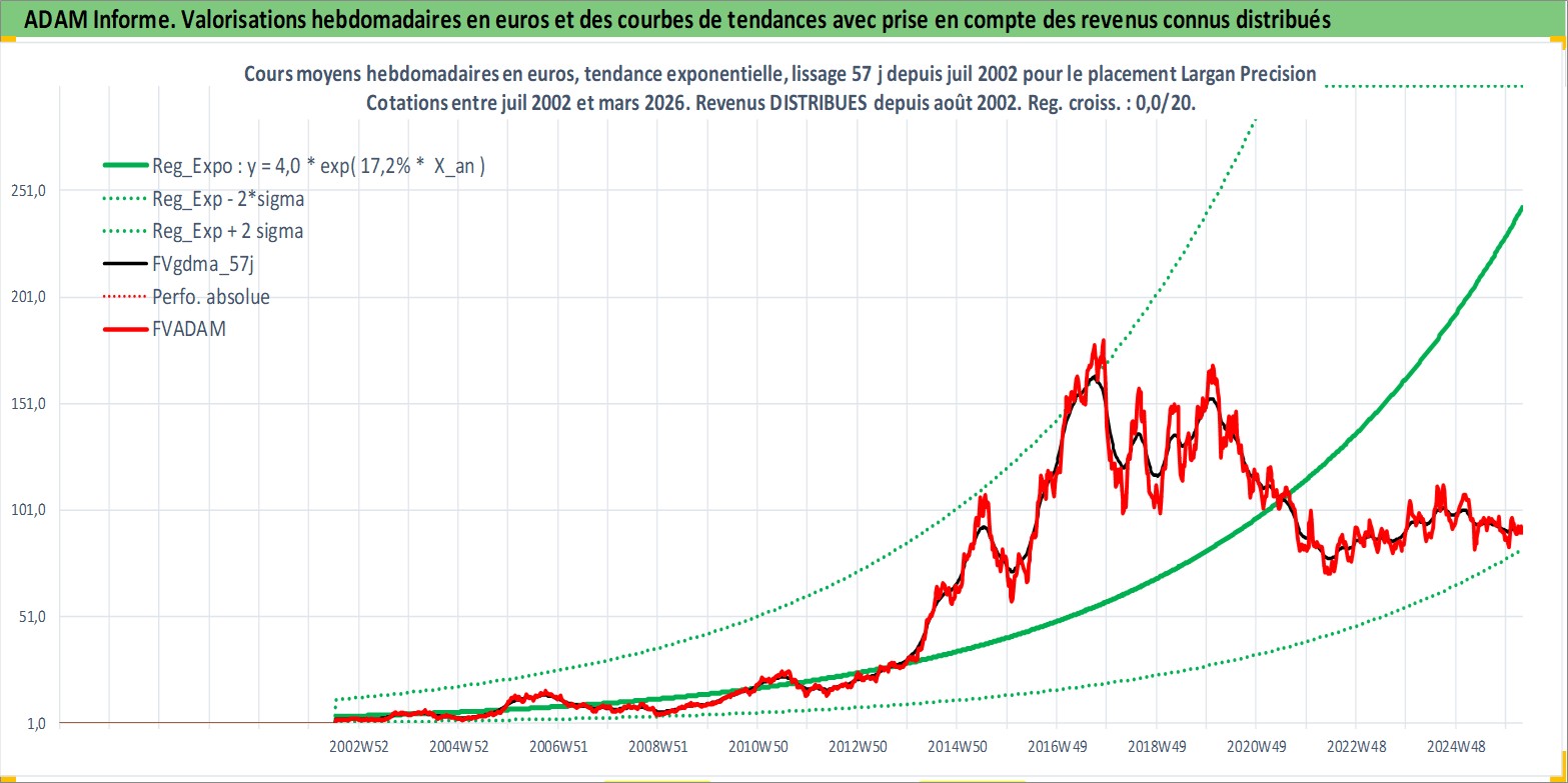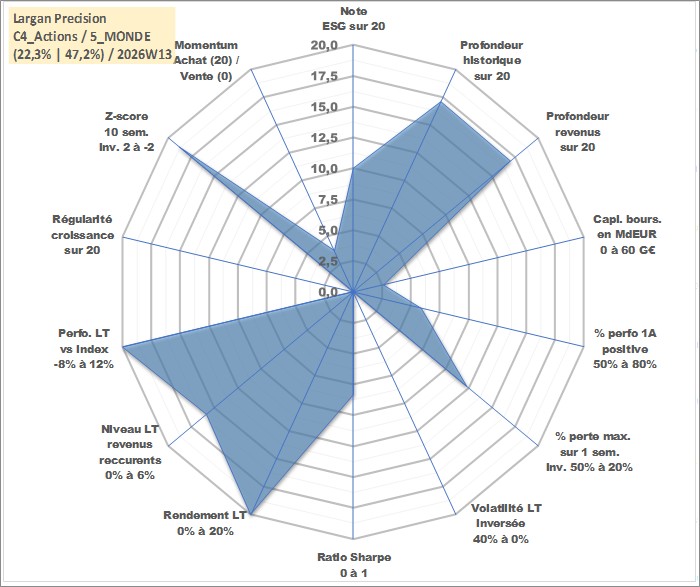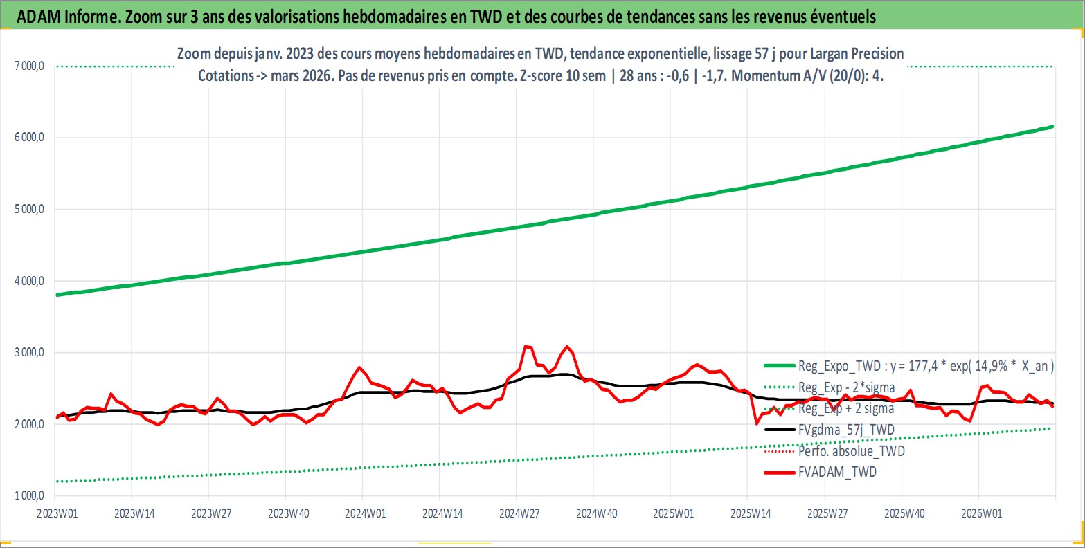 Site dédié aux investisseursPage dédiée sur site financeAnalyse des valorisations hebdomadaires de l'action Largan Precision . Cet actif est cote en TWD. Les valorisations sont en contrevaleur EURO et couvrent les semaines 2002W28 a 2026W13. Les revenus de cet actif financier sont pris en compte depuis la semaine 2002W35. La note globale ESG de cet actif est estimee a 10.0 (apres rebasage entre 0 et 20).