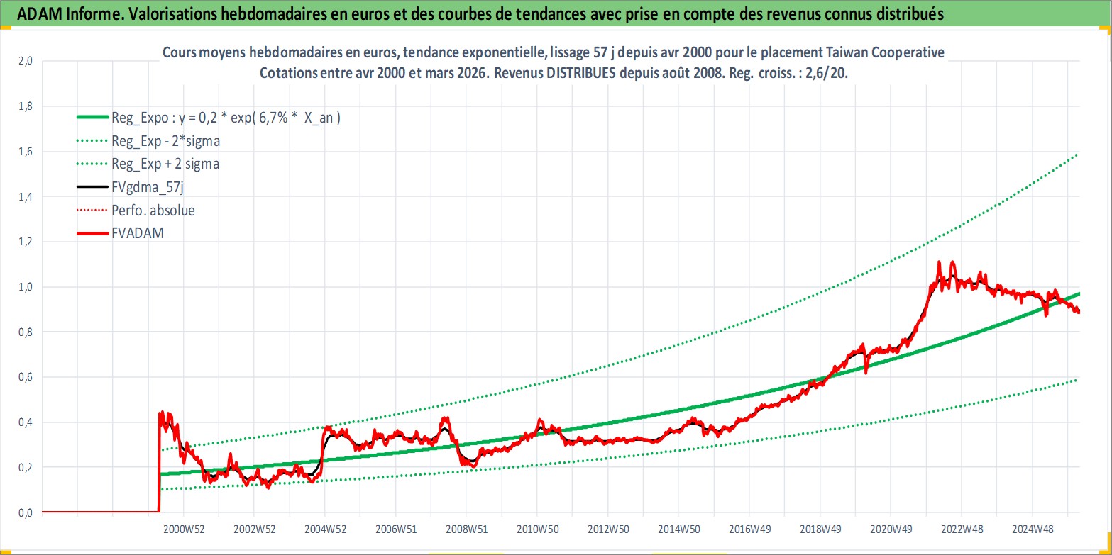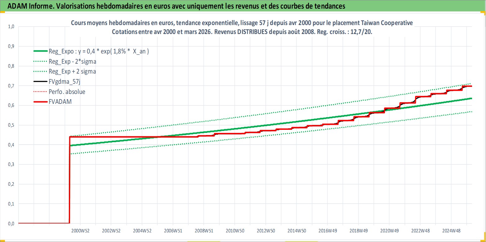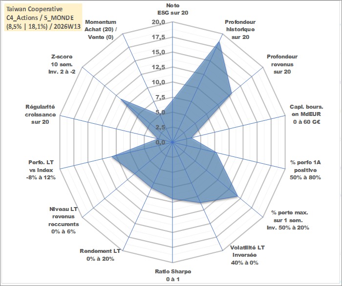 Site dédié aux investisseursPage dédiée sur site financeAnalyse des valorisations hebdomadaires de l'action Taiwan Cooperative . Cet actif est cote en TWD. Les valorisations sont en contrevaleur EURO et couvrent les semaines 2000W16 a 2026W13. Les revenus de cet actif financier sont pris en compte depuis la semaine 2008W32. La note globale ESG de cet actif est estimee a 7.0 (apres rebasage entre 0 et 20).
