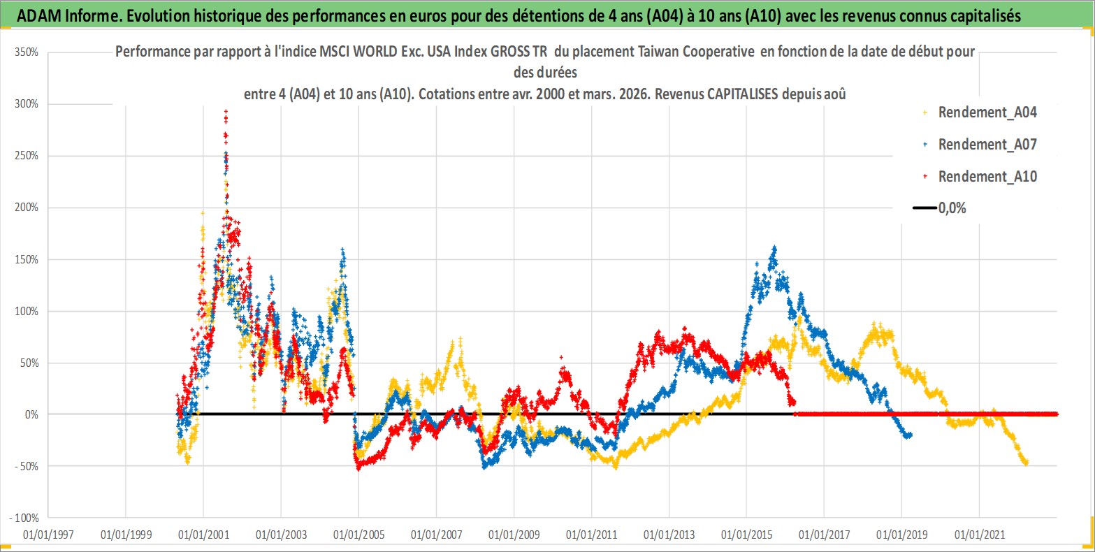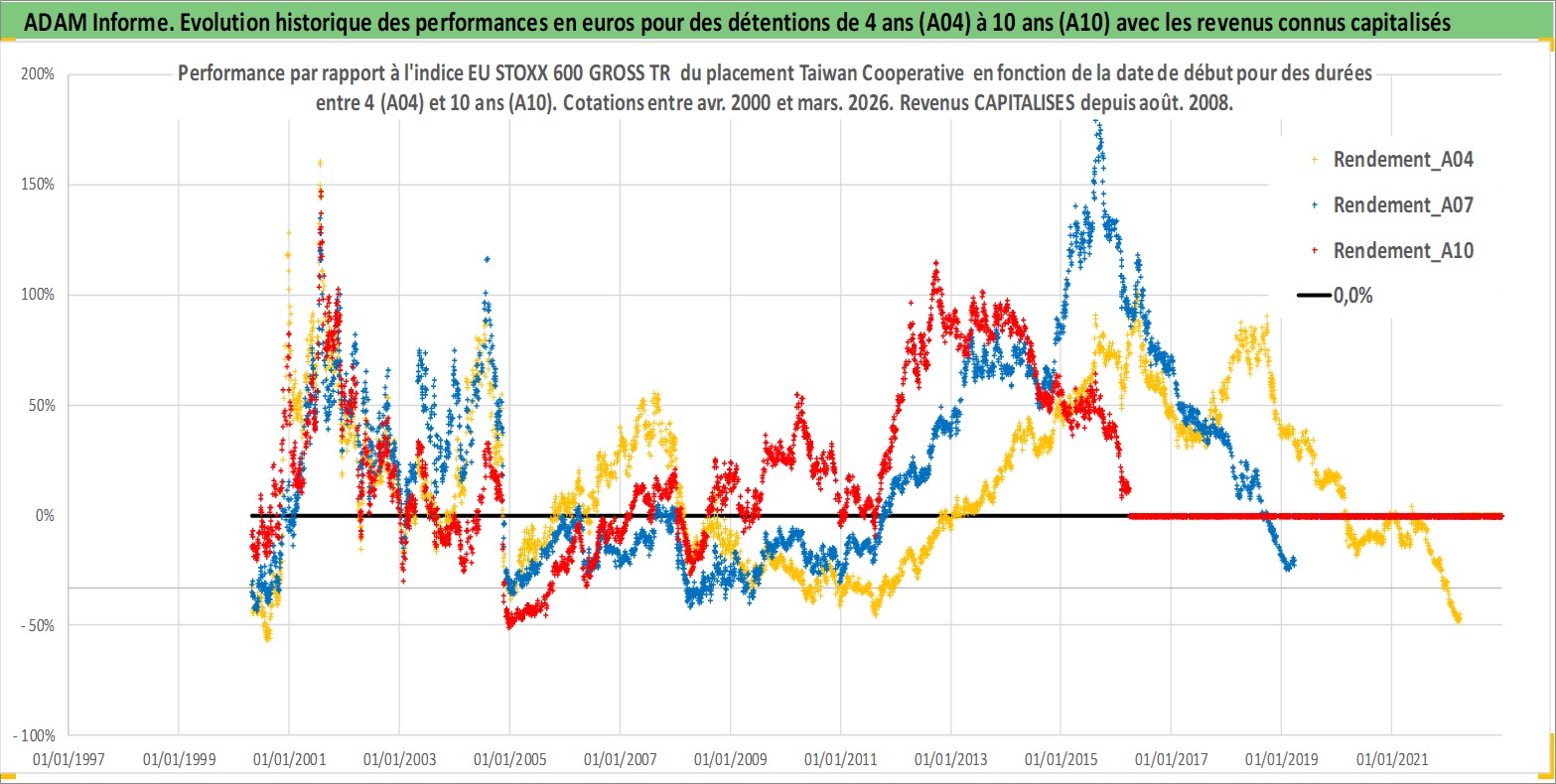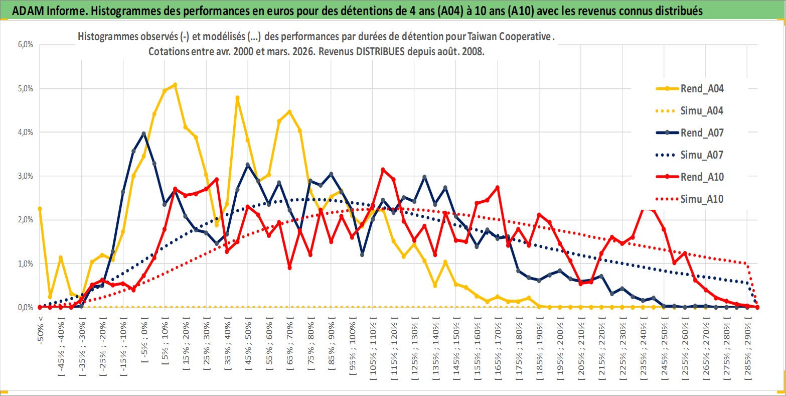 Site dédié aux investisseursPage dédiée sur site financeAnalyse des valorisations hebdomadaires de l'action Taiwan Cooperative . Cet actif est cote en TWD. Les valorisations sont en contrevaleur EURO et couvrent les semaines 2000W16 a 2026W13. Les revenus de cet actif financier sont pris en compte depuis la semaine 2008W32. La note globale ESG de cet actif est estimee a 7.0 (apres rebasage entre 0 et 20).