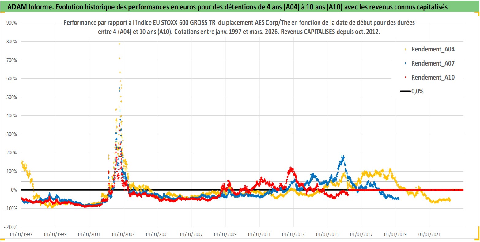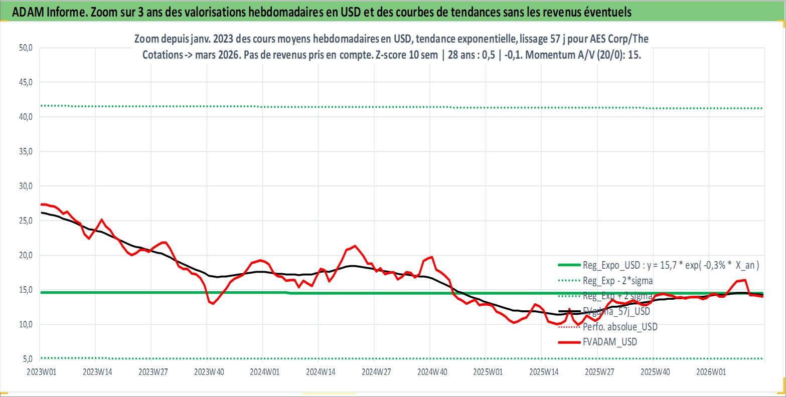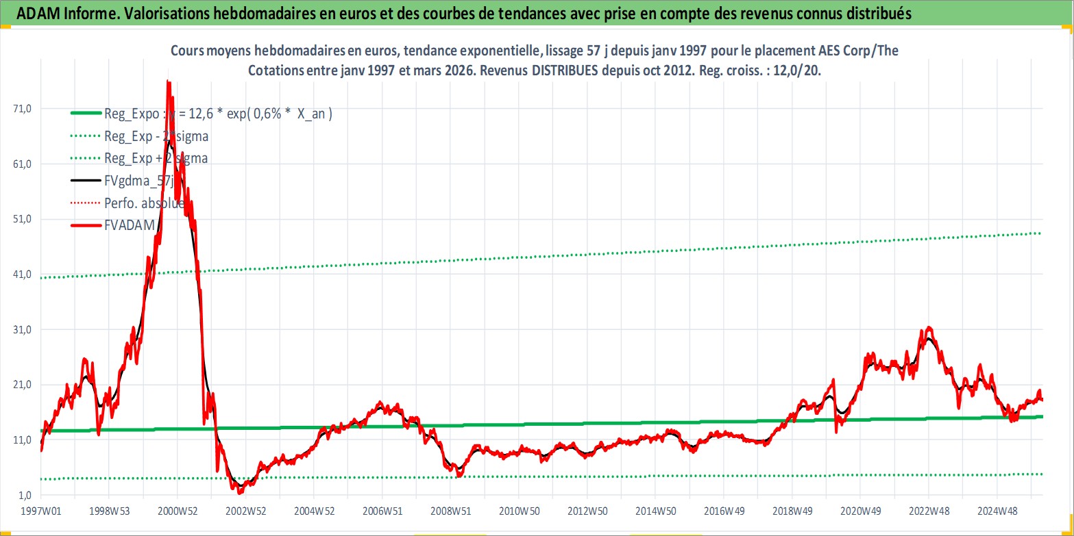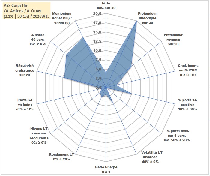 Site dédié aux investisseursPage dédiée sur site financeAnalyse des valorisations hebdomadaires de l'action AES Corp/The. Cet actif est cote en USD. Les valorisations sont en contrevaleur EURO et couvrent les semaines 1997W01 a 2026W13. Les revenus de cet actif financier sont pris en compte depuis la semaine 2012W43. La note globale ESG de cet actif est estimee a 4.0 (apres rebasage entre 0 et 20).