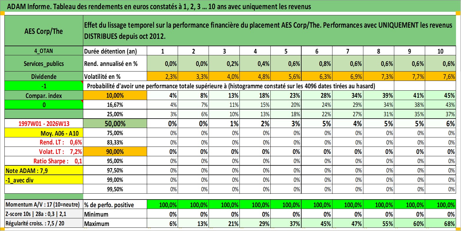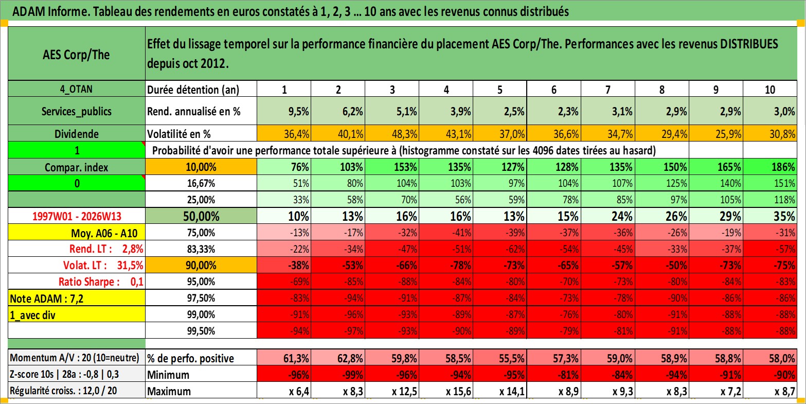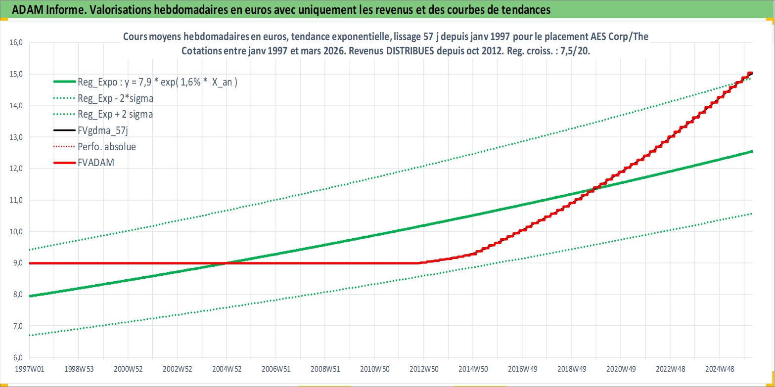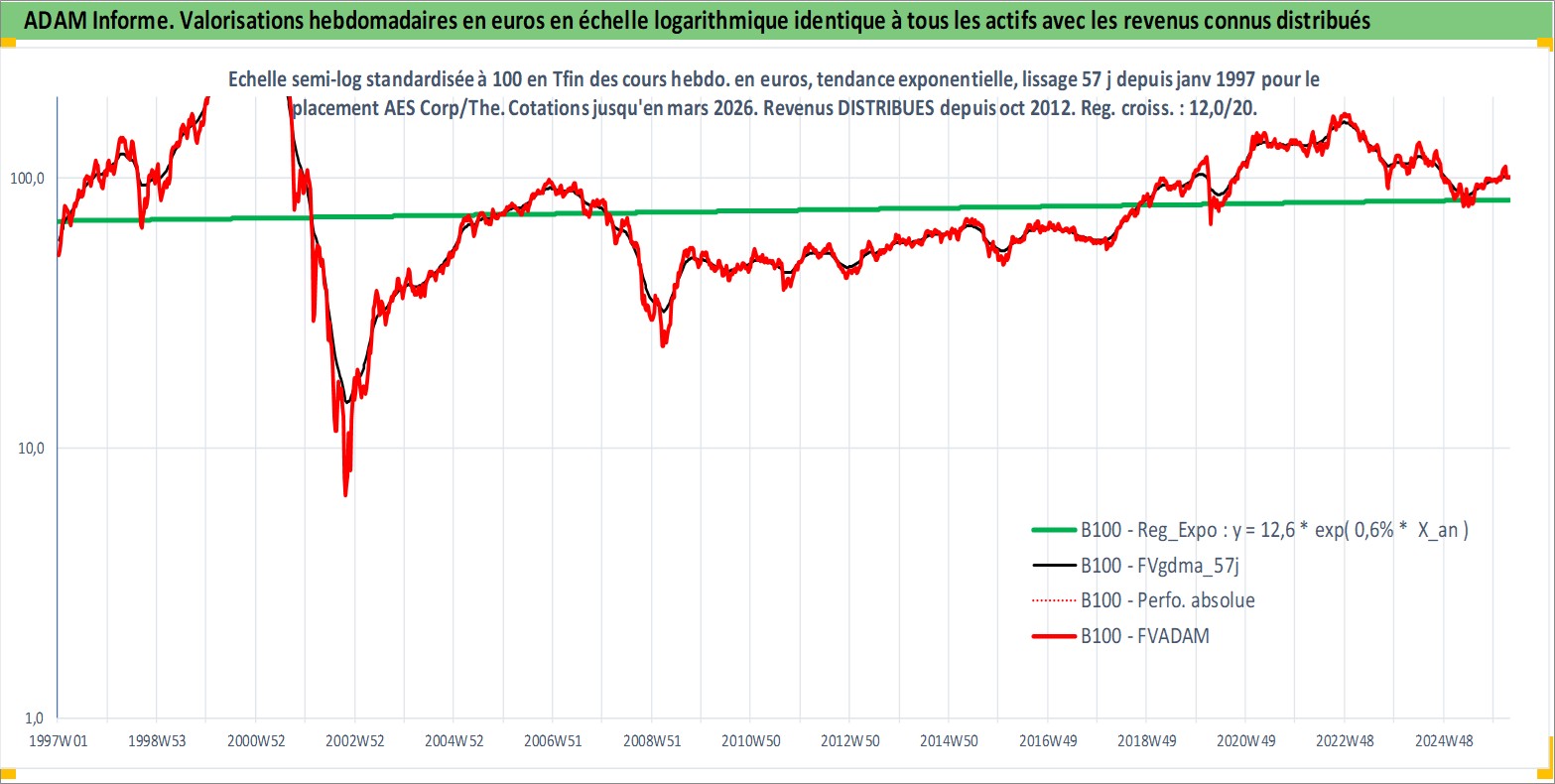 Site dédié aux investisseursPage dédiée sur site financeAnalyse des valorisations hebdomadaires de l'action AES Corp/The. Cet actif est cote en USD. Les valorisations sont en contrevaleur EURO et couvrent les semaines 1997W01 a 2026W13. Les revenus de cet actif financier sont pris en compte depuis la semaine 2012W43. La note globale ESG de cet actif est estimee a 4.0 (apres rebasage entre 0 et 20).