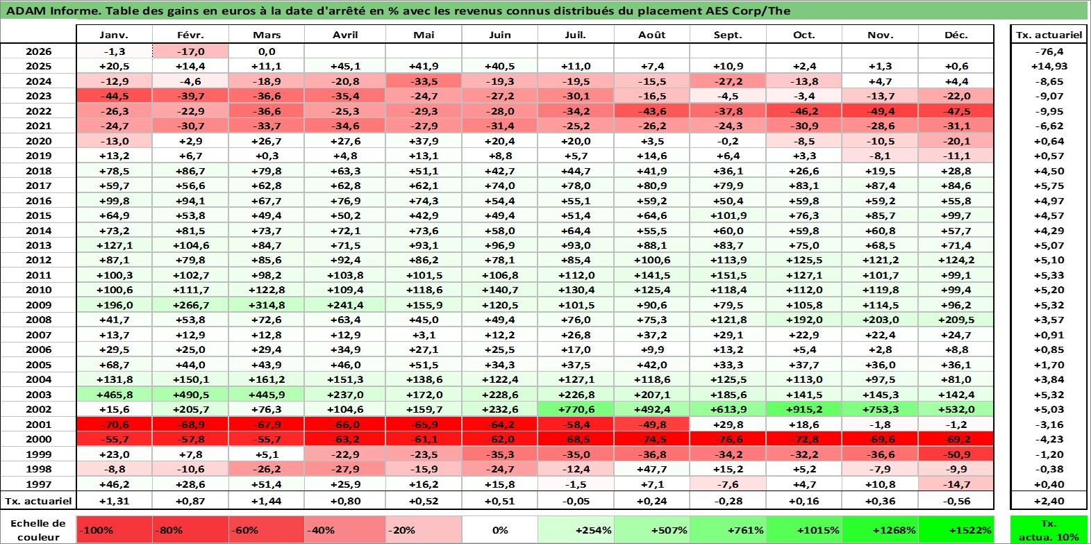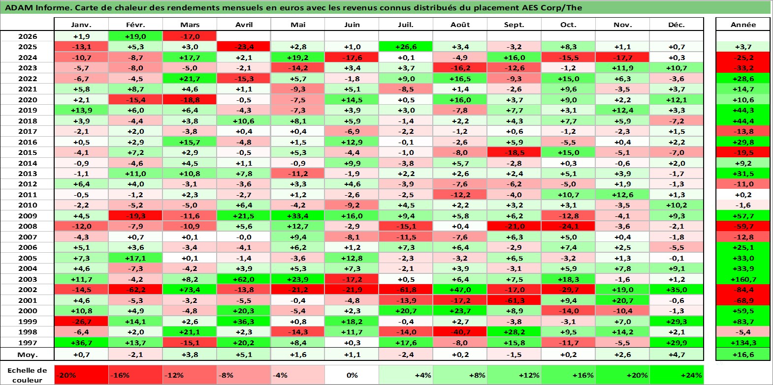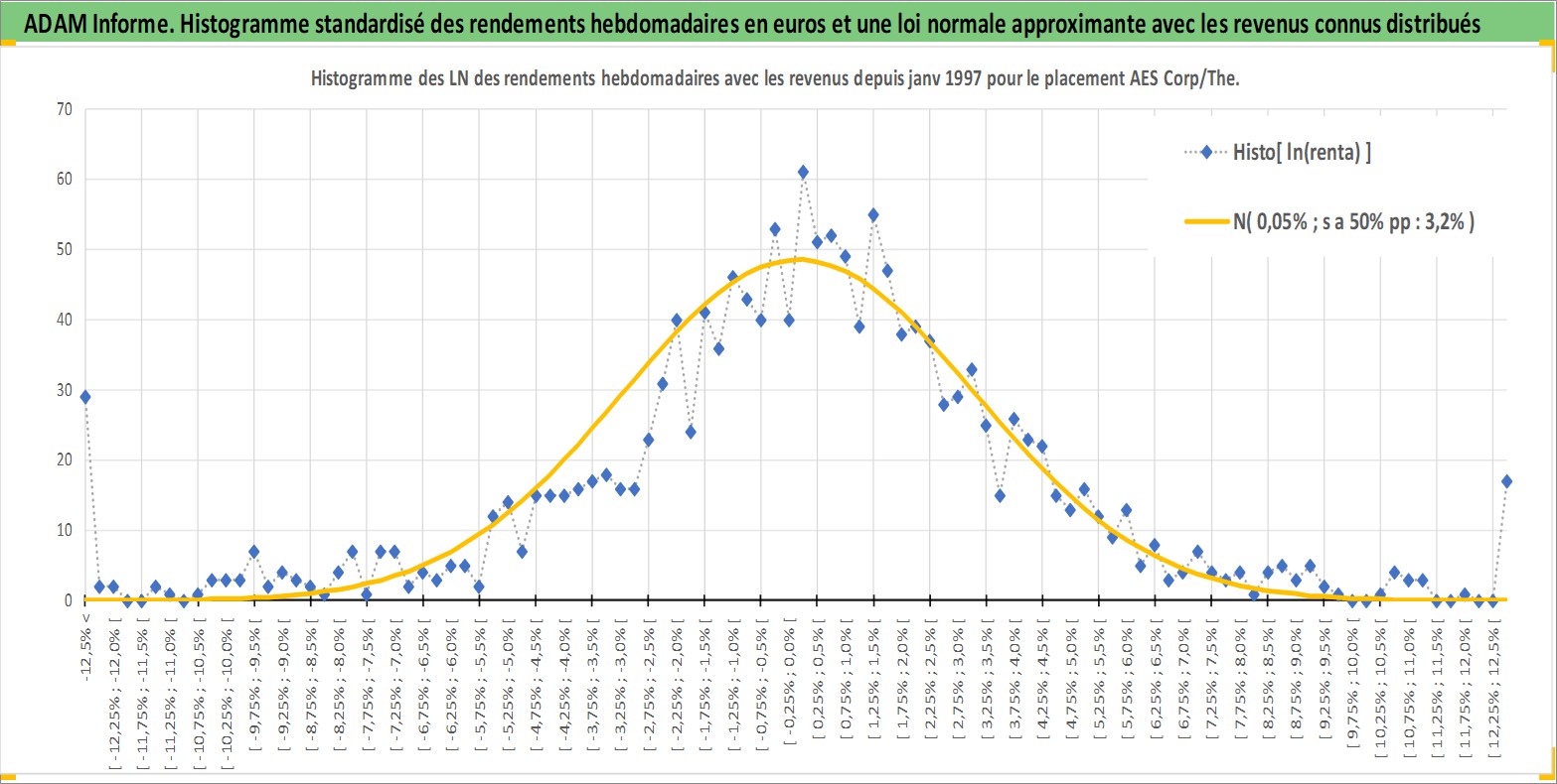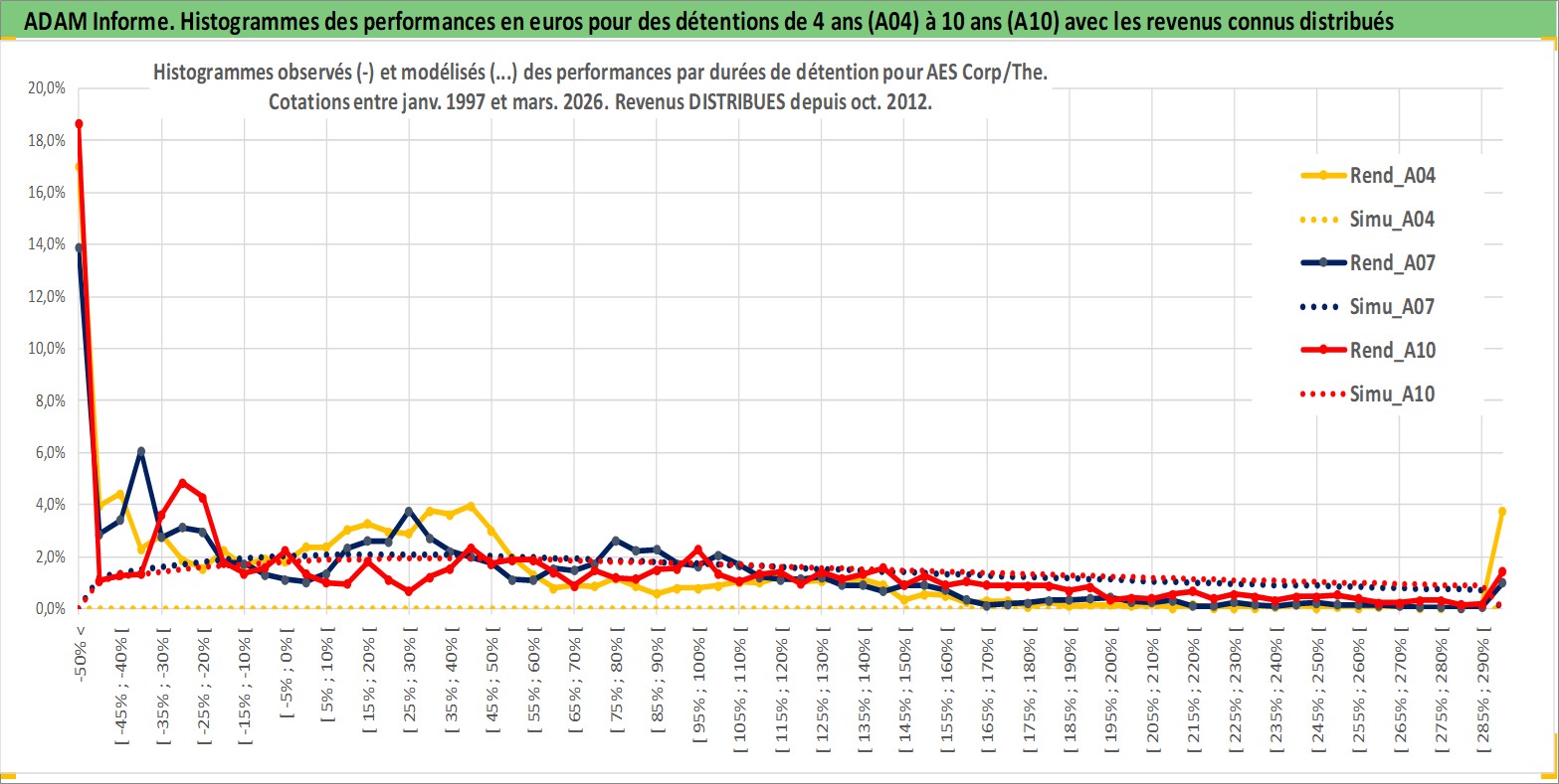 Site dédié aux investisseursPage dédiée sur site financeAnalyse des valorisations hebdomadaires de l'action AES Corp/The. Cet actif est cote en USD. Les valorisations sont en contrevaleur EURO et couvrent les semaines 1997W01 a 2026W13. Les revenus de cet actif financier sont pris en compte depuis la semaine 2012W43. La note globale ESG de cet actif est estimee a 4.0 (apres rebasage entre 0 et 20).