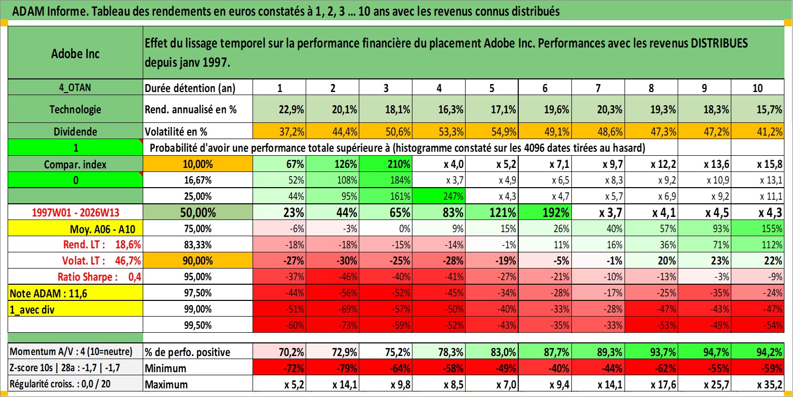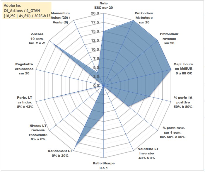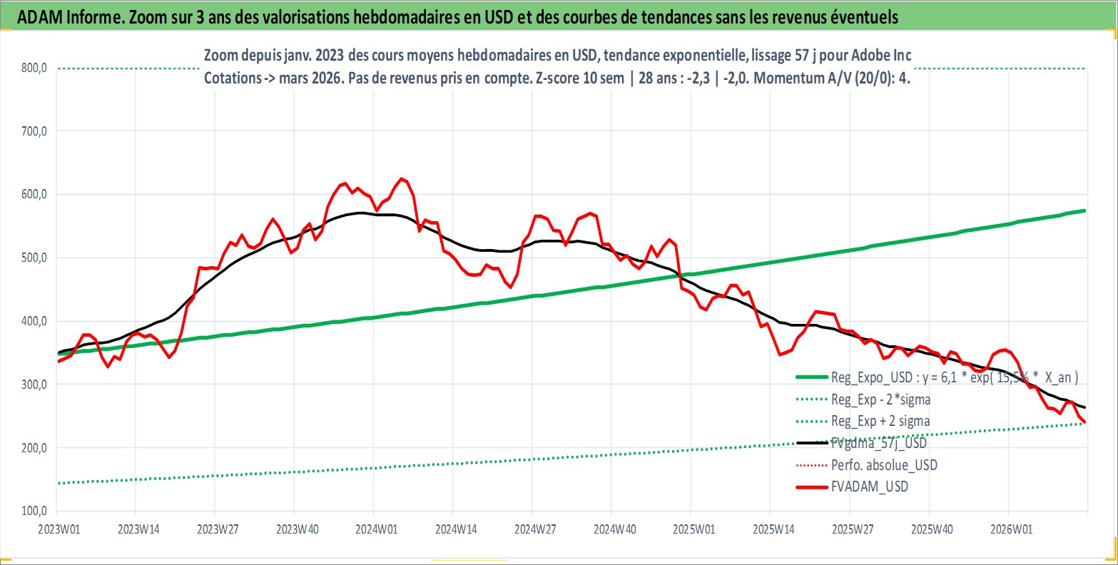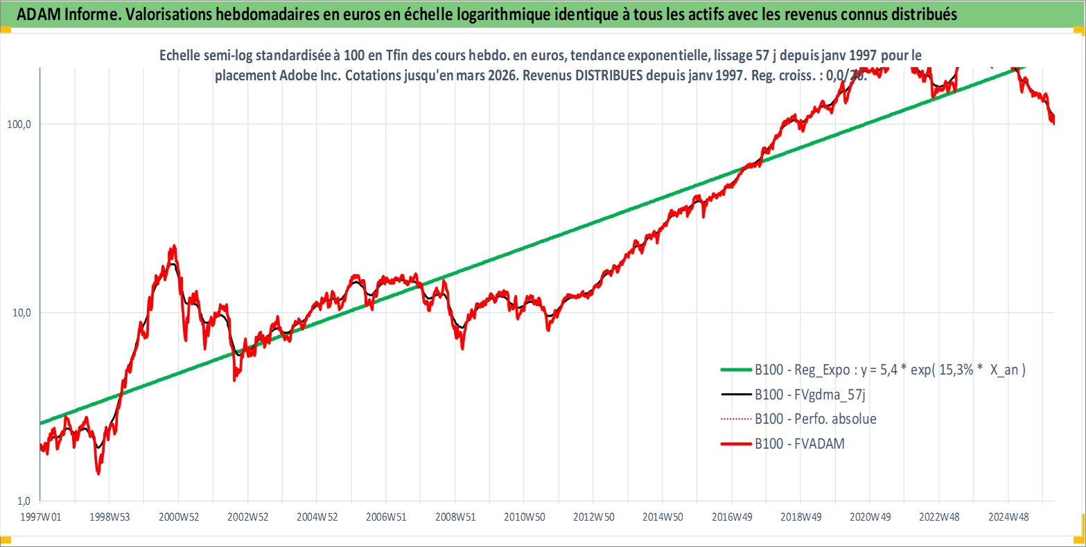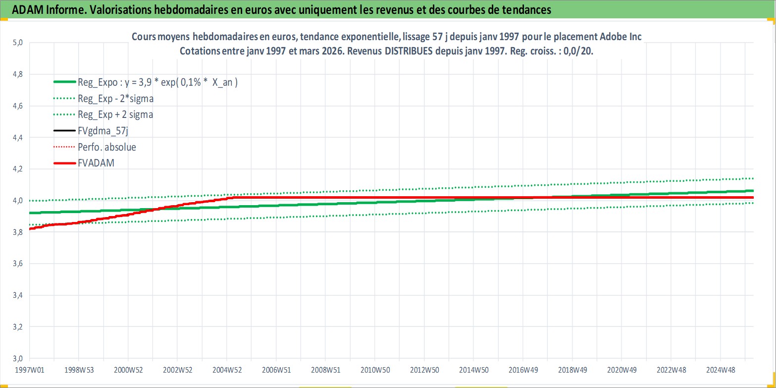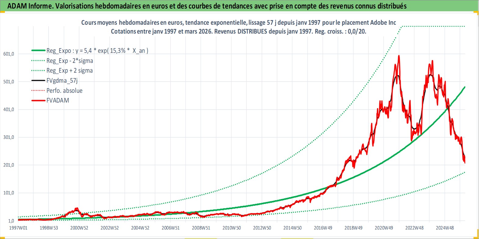 Site dédié aux investisseursPage dédiée sur site financeAnalyse des valorisations hebdomadaires de l'action Adobe Inc. Cet actif est cote en USD. Les valorisations sont en contrevaleur EURO et couvrent les semaines 1997W01 a 2026W13. Les revenus de cet actif financier sont pris en compte depuis la semaine 1997W03. La note globale ESG de cet actif est estimee a 15.0 (apres rebasage entre 0 et 20).