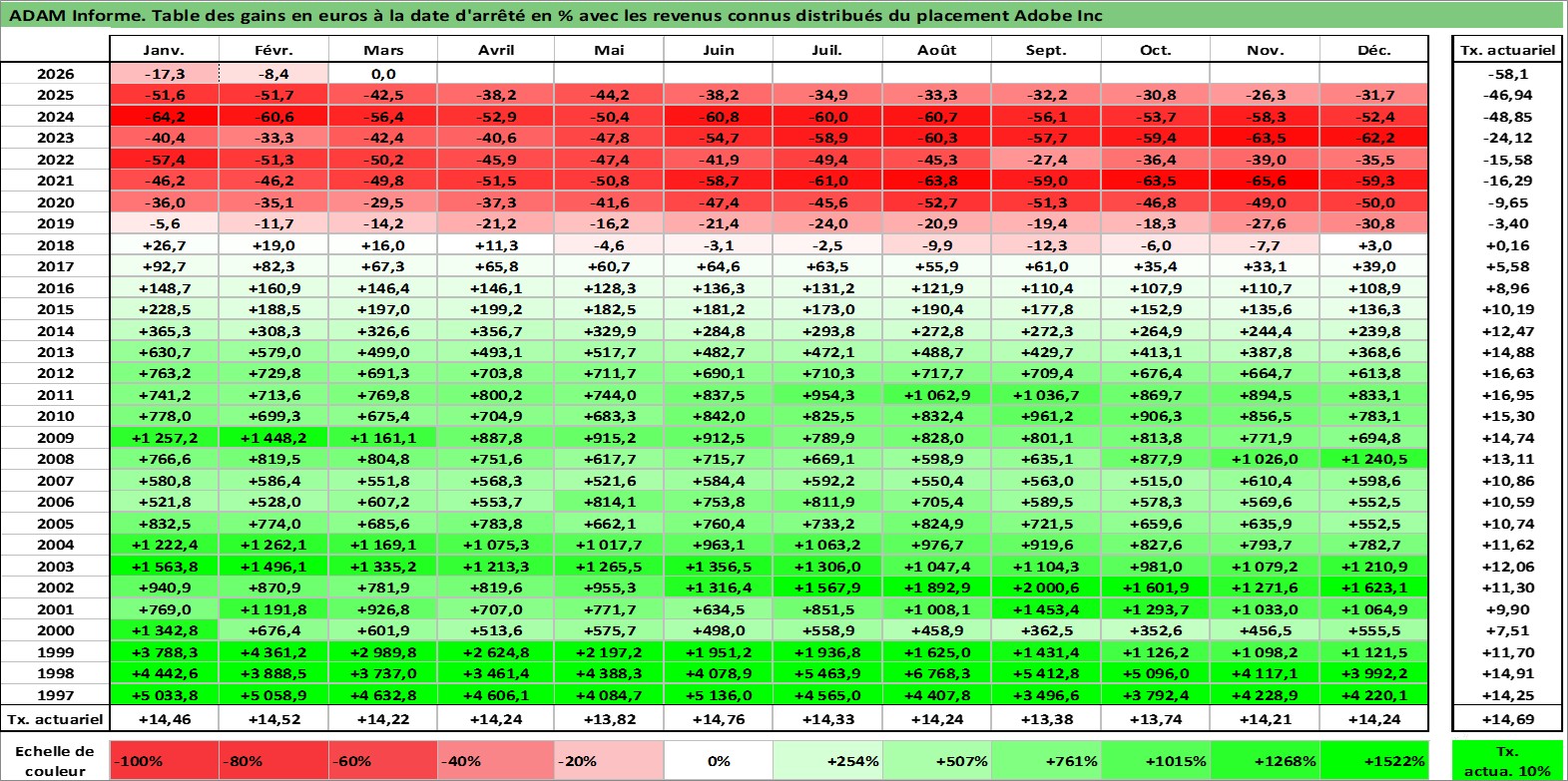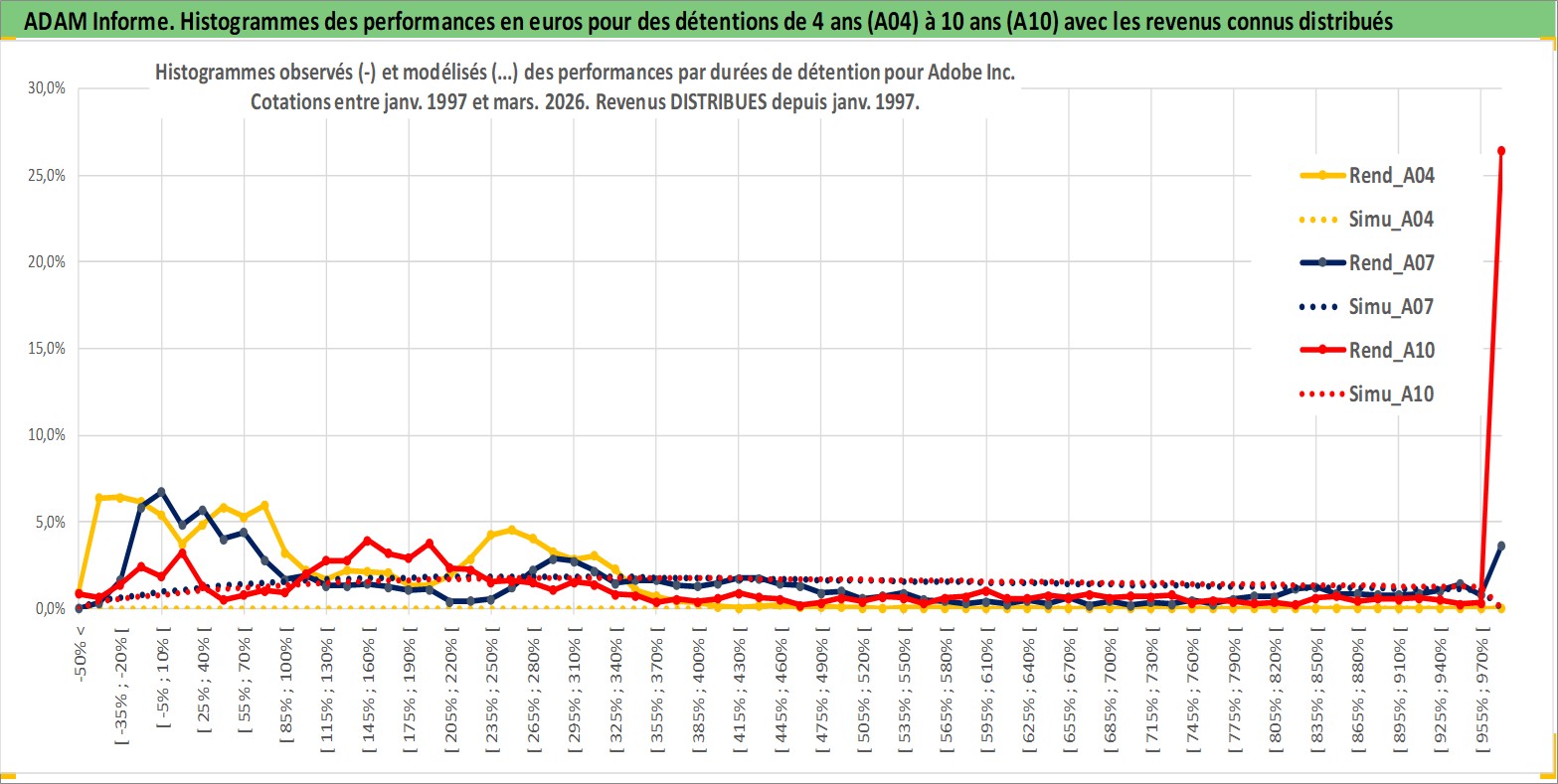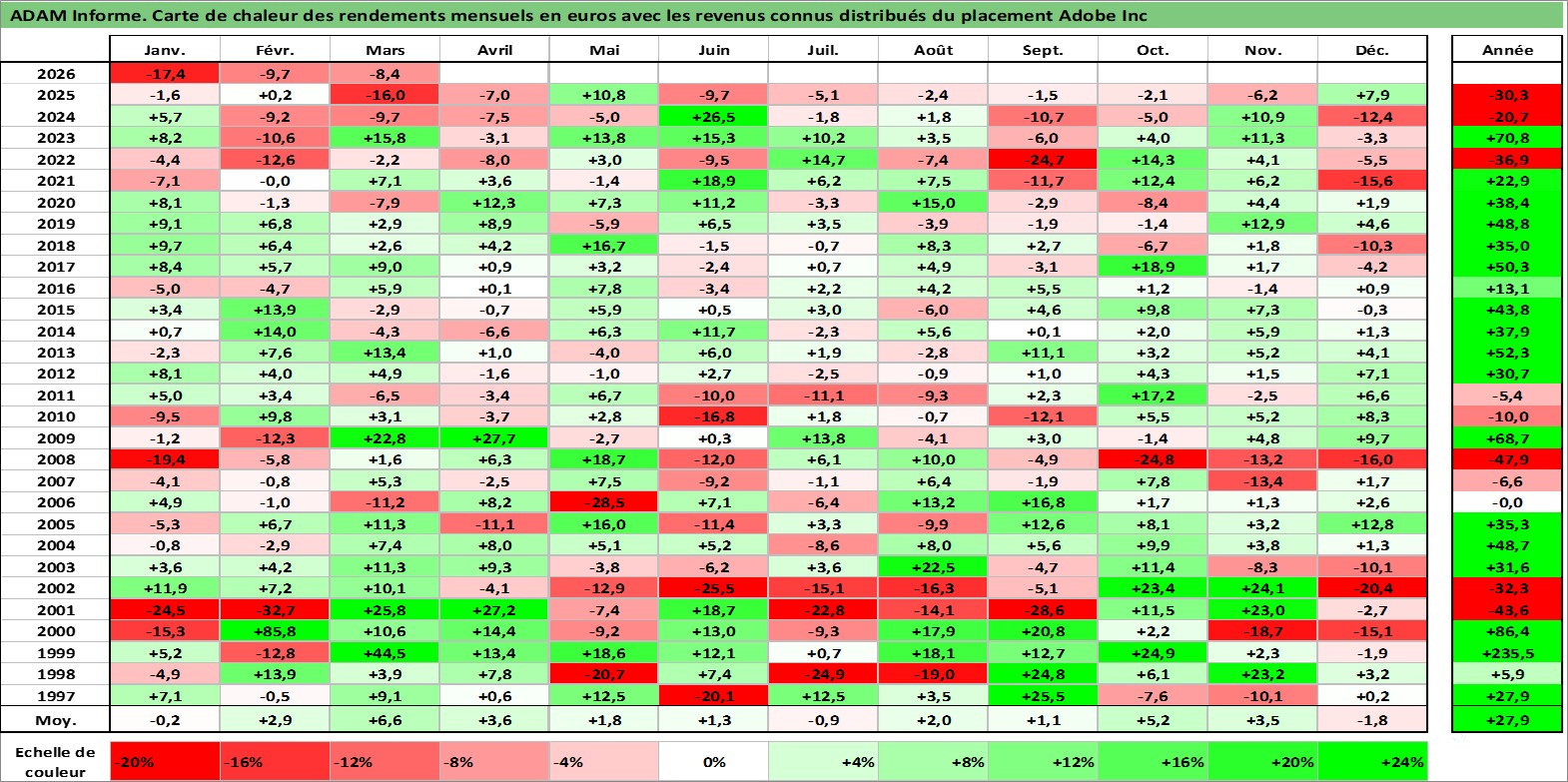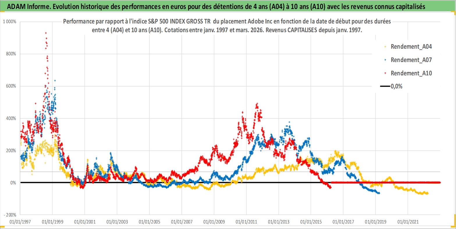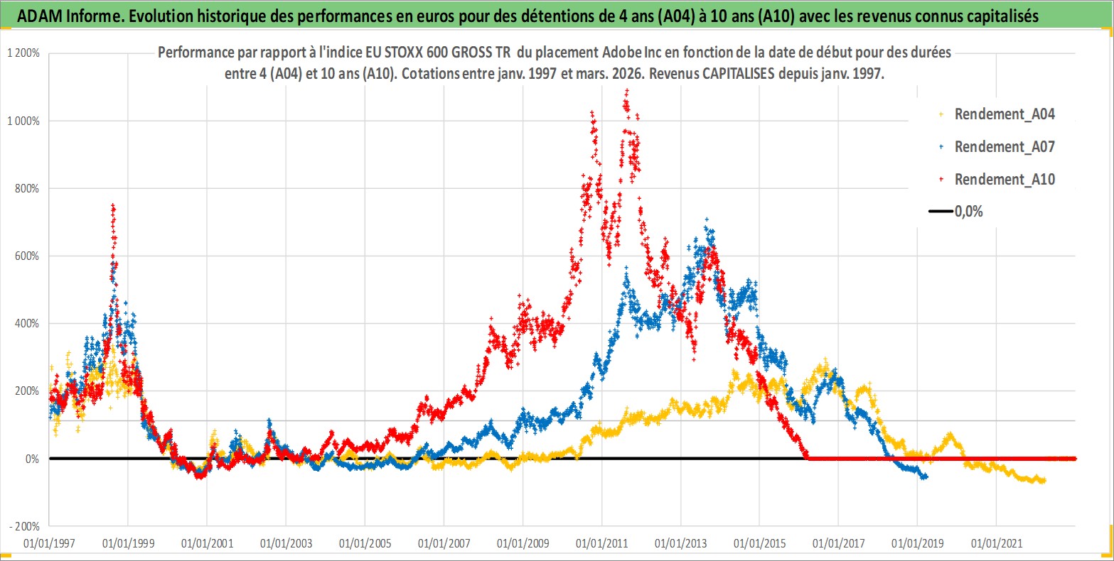 Site dédié aux investisseursPage dédiée sur site financeAnalyse des valorisations hebdomadaires de l'action Adobe Inc. Cet actif est cote en USD. Les valorisations sont en contrevaleur EURO et couvrent les semaines 1997W01 a 2026W13. Les revenus de cet actif financier sont pris en compte depuis la semaine 1997W03. La note globale ESG de cet actif est estimee a 15.0 (apres rebasage entre 0 et 20).