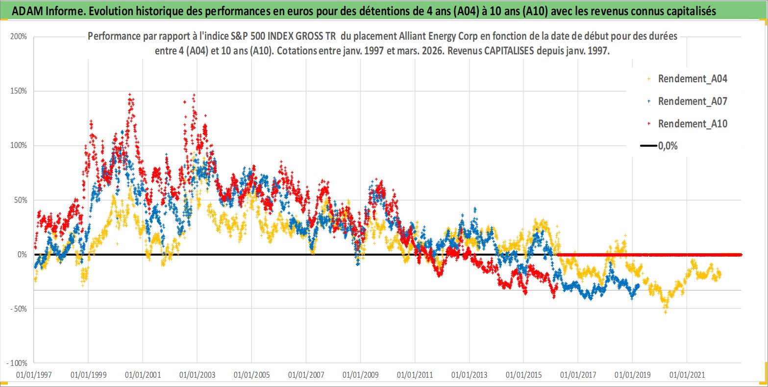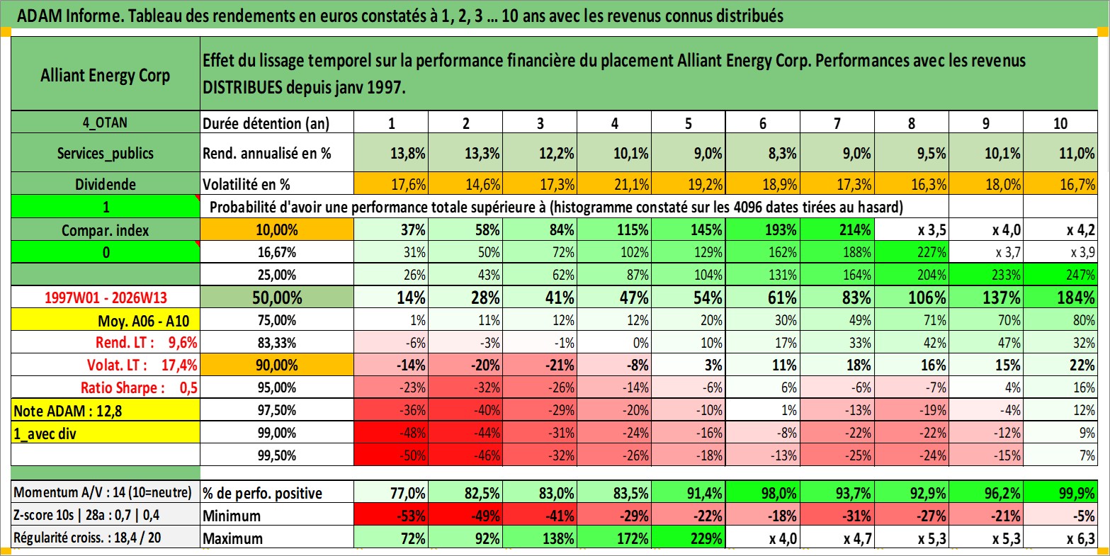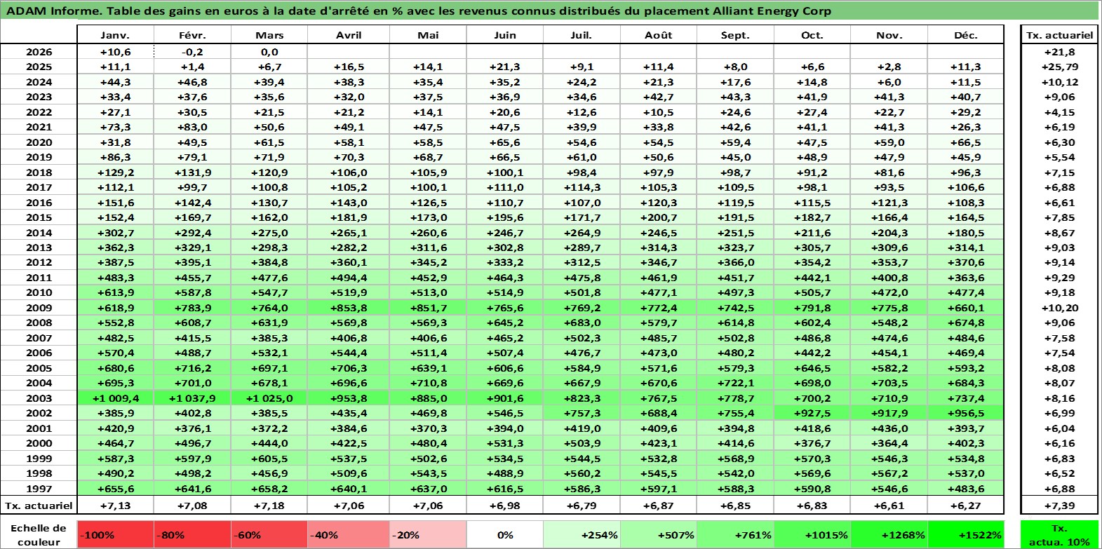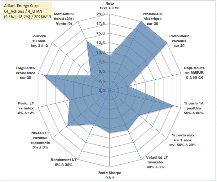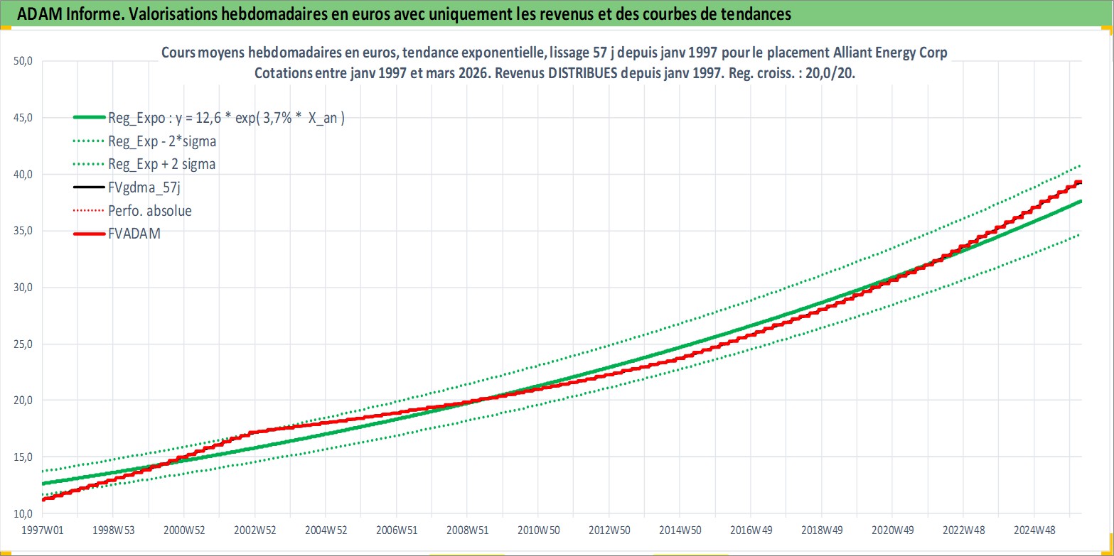 Site dédié aux investisseursPage dédiée sur site financeAnalyse des valorisations hebdomadaires de l'action Alliant Energy Corp. Cet actif est cote en USD. Les valorisations sont en contrevaleur EURO et couvrent les semaines 1997W01 a 2026W13. Les revenus de cet actif financier sont pris en compte depuis la semaine 1997W05. La note globale ESG de cet actif est estimee a 9.0 (apres rebasage entre 0 et 20).