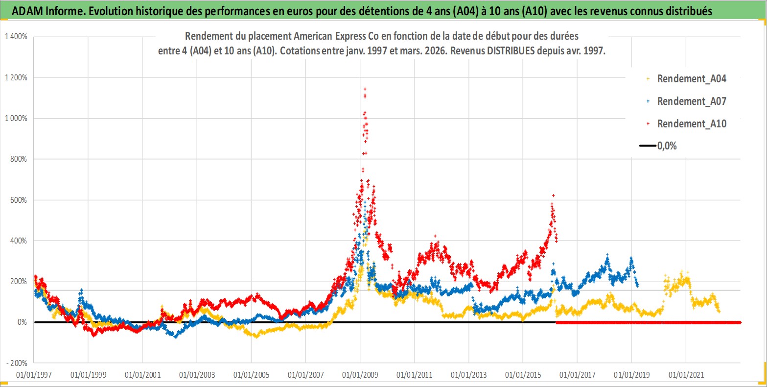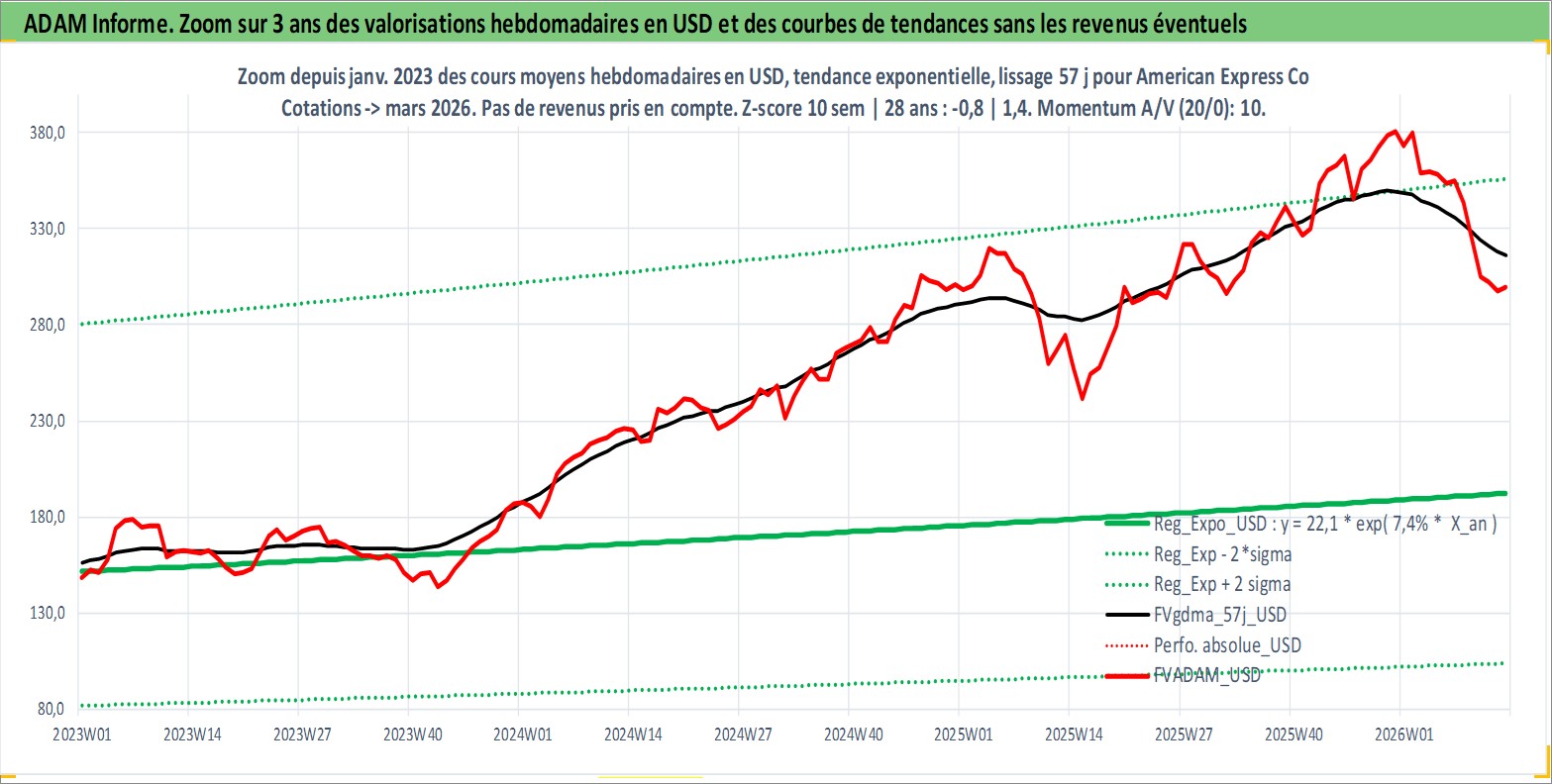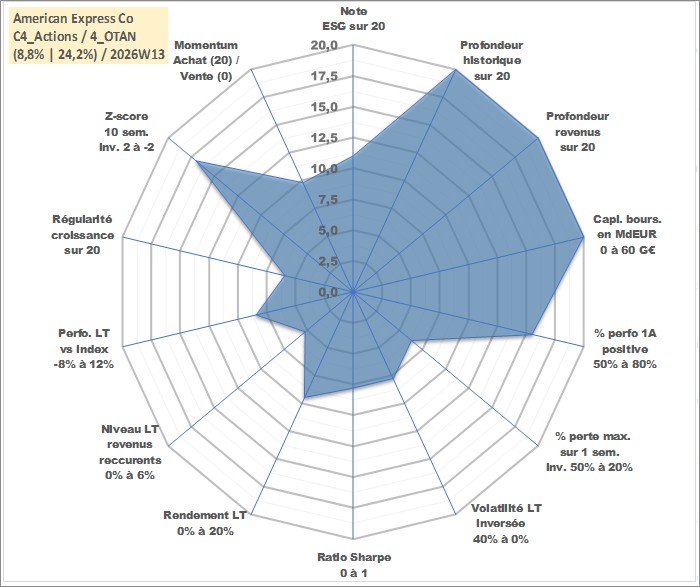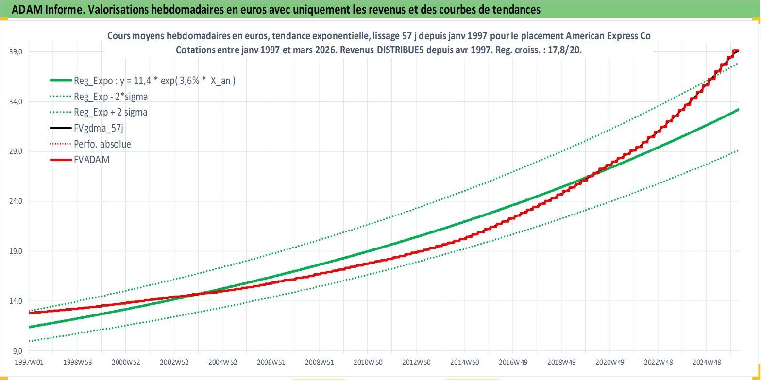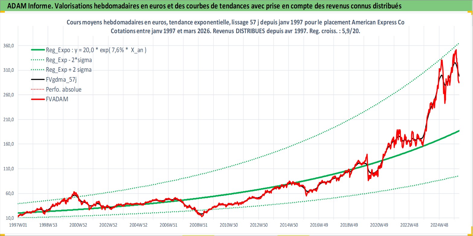 Site dédié aux investisseursPage dédiée sur site financeAnalyse des valorisations hebdomadaires de l'action American Express Co. Cet actif est cote en USD. Les valorisations sont en contrevaleur EURO et couvrent les semaines 1997W01 a 2026W13. Les revenus de cet actif financier sont pris en compte depuis la semaine 1997W14. La note globale ESG de cet actif est estimee a 11.0 (apres rebasage entre 0 et 20).