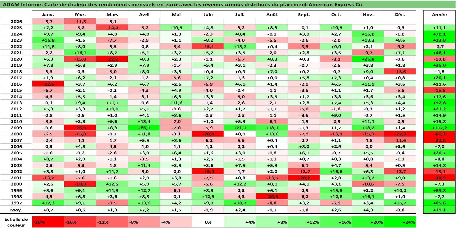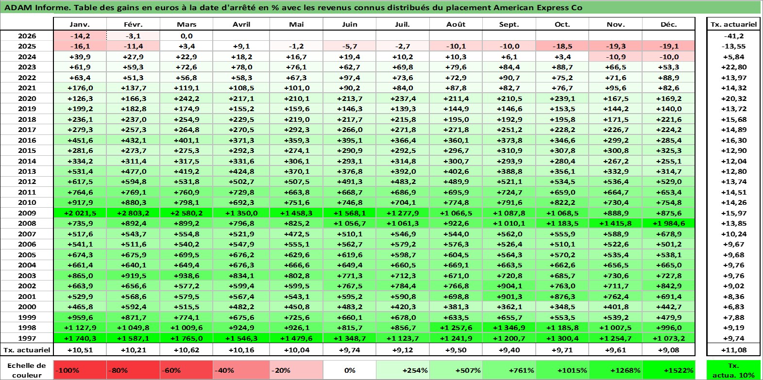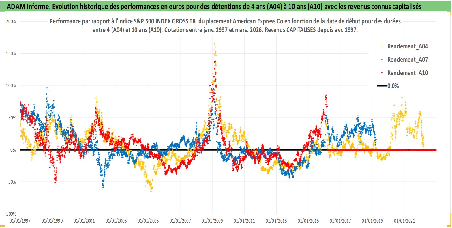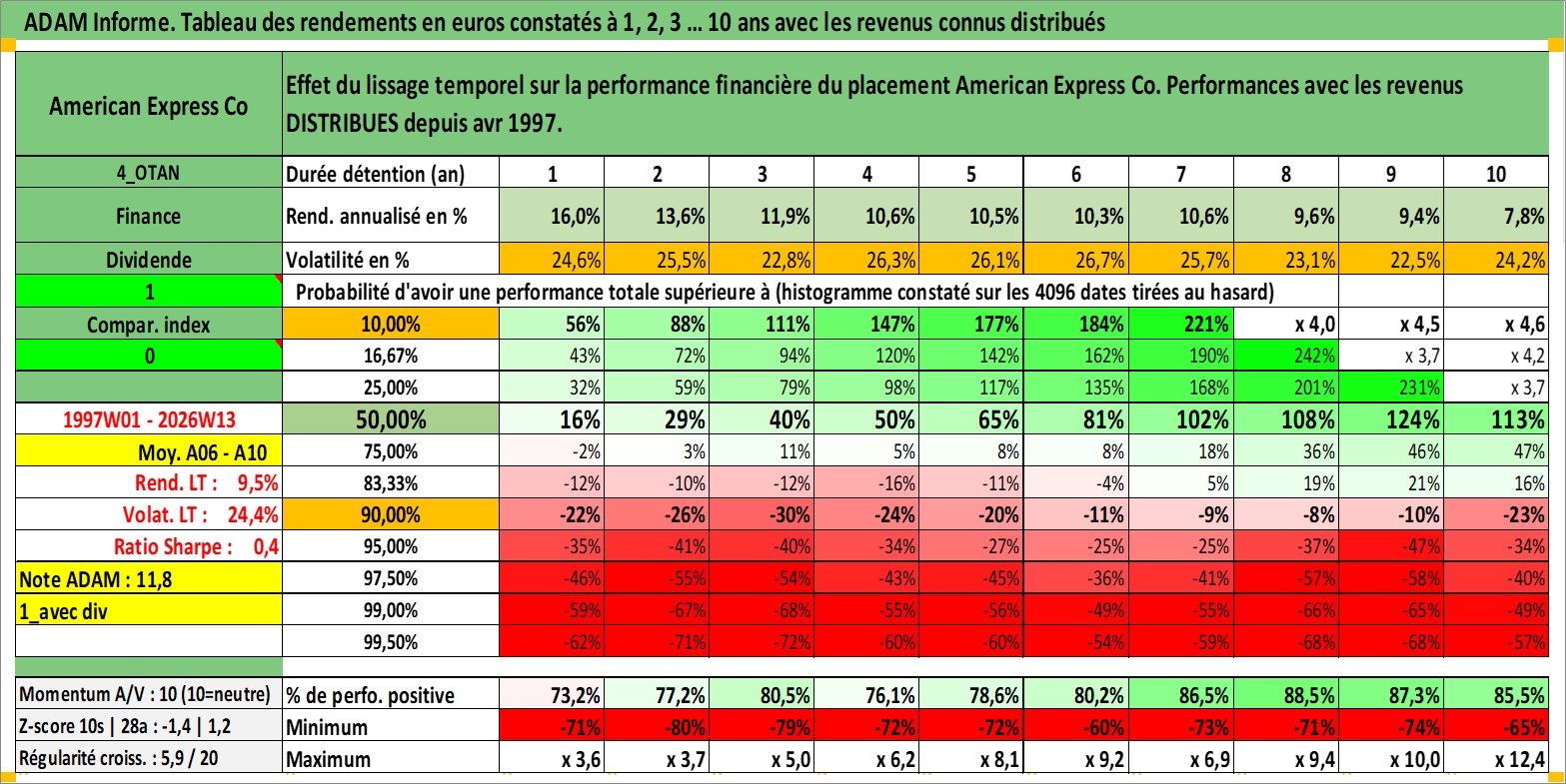Site dédié aux investisseursPage dédiée sur site financeAnalyse des valorisations hebdomadaires de l'action American Express Co. Cet actif est cote en USD. Les valorisations sont en contrevaleur EURO et couvrent les semaines 1997W01 a 2026W13. Les revenus de cet actif financier sont pris en compte depuis la semaine 1997W14. La note globale ESG de cet actif est estimee a 11.0 (apres rebasage entre 0 et 20).