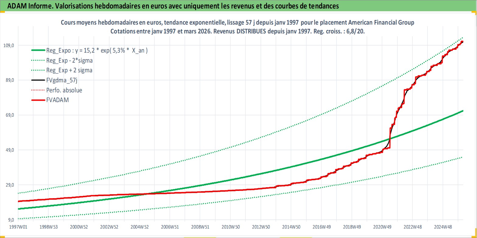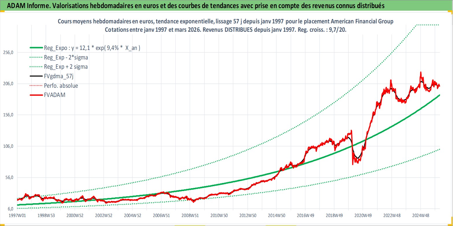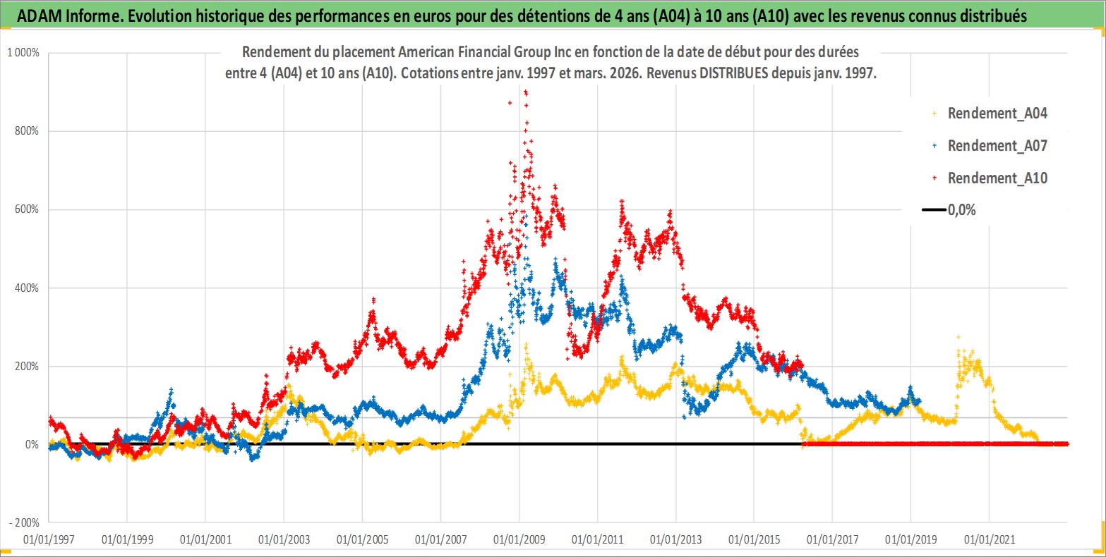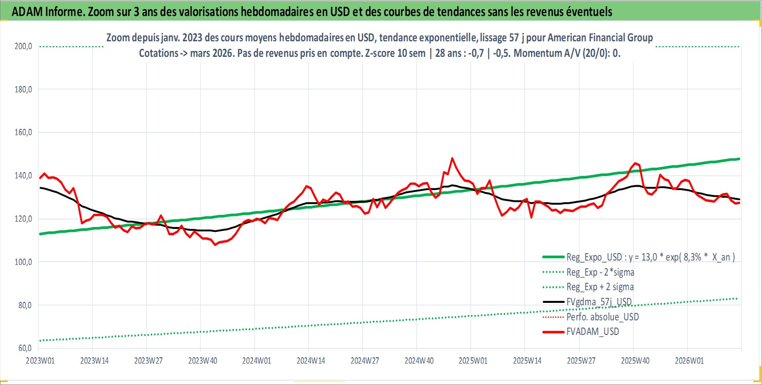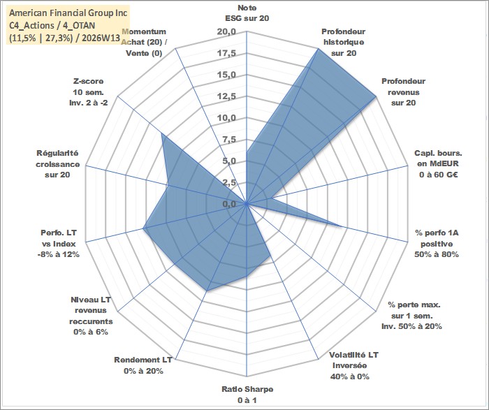 Site dédié aux investisseursPage dédiée sur site financeAnalyse des valorisations hebdomadaires de l'action American Financial Group Inc. Cet actif est cote en USD. Les valorisations sont en contrevaleur EURO et couvrent les semaines 1997W01 a 2026W13. Les revenus de cet actif financier sont pris en compte depuis la semaine 1997W03. La note globale ESG de cet actif est estimee a 6.0 (apres rebasage entre 0 et 20).