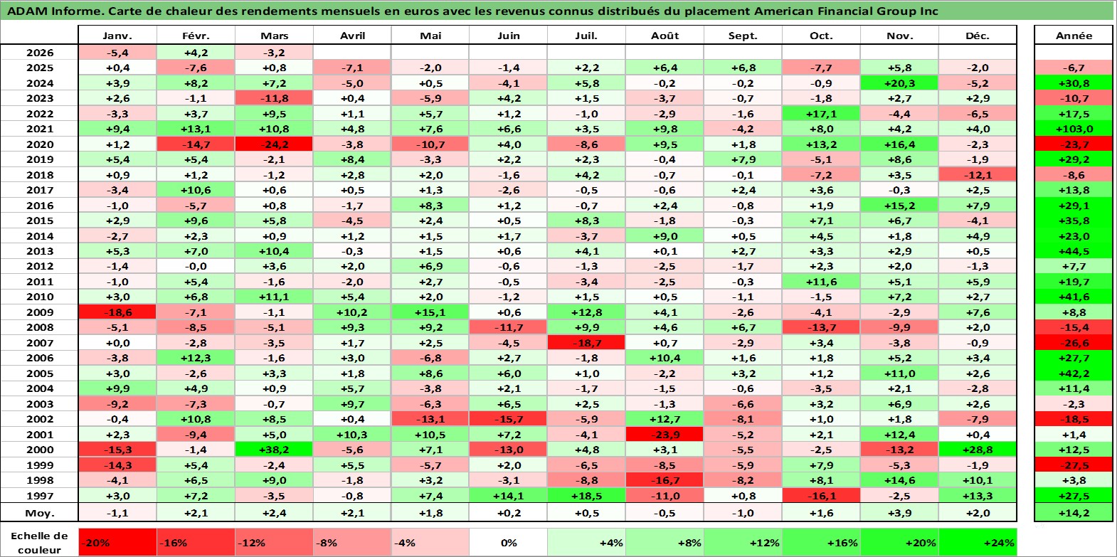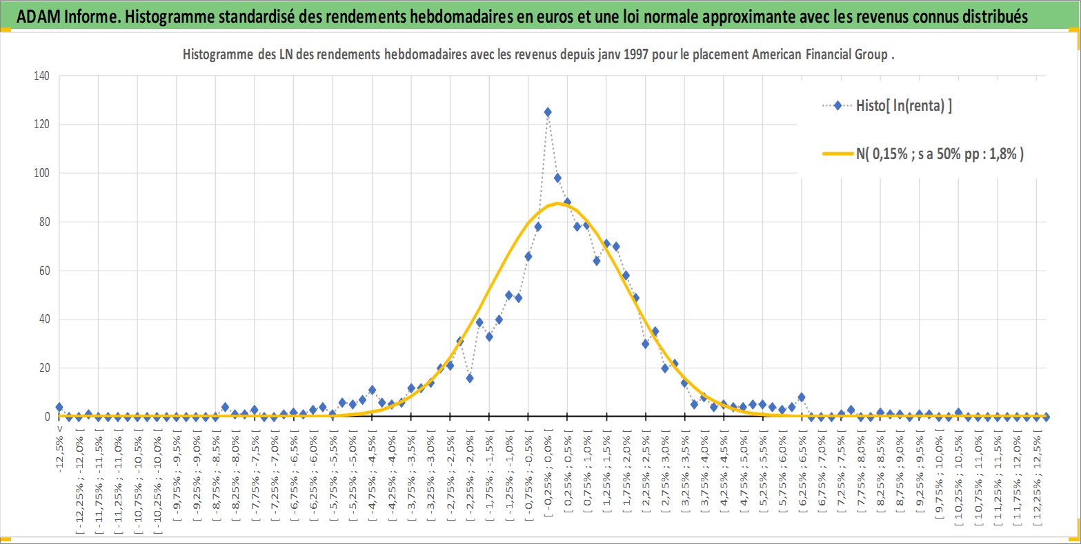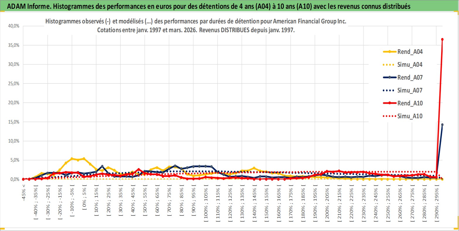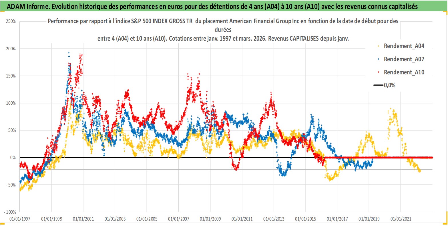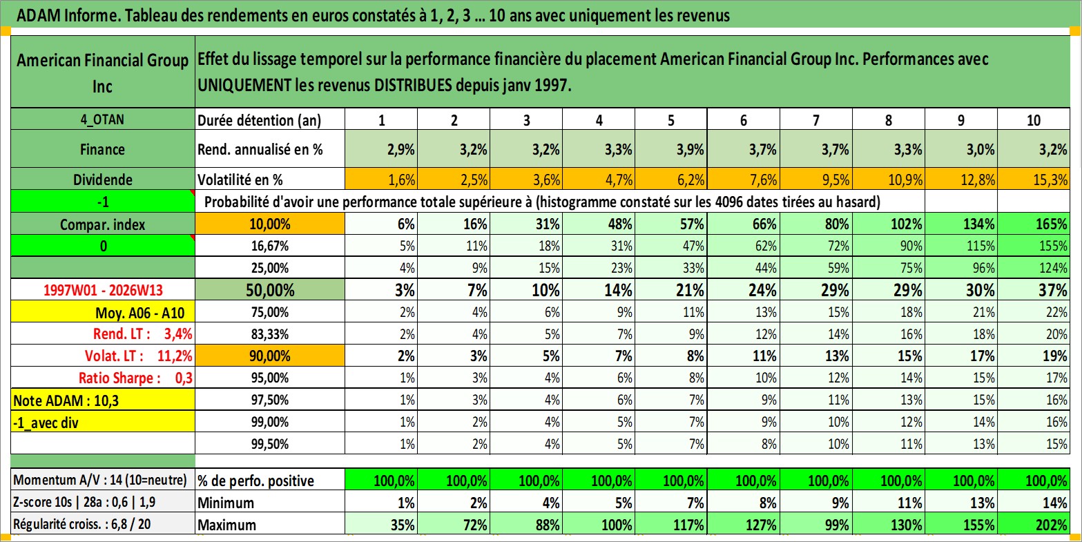 Site dédié aux investisseursPage dédiée sur site financeAnalyse des valorisations hebdomadaires de l'action American Financial Group Inc. Cet actif est cote en USD. Les valorisations sont en contrevaleur EURO et couvrent les semaines 1997W01 a 2026W13. Les revenus de cet actif financier sont pris en compte depuis la semaine 1997W03. La note globale ESG de cet actif est estimee a 6.0 (apres rebasage entre 0 et 20).