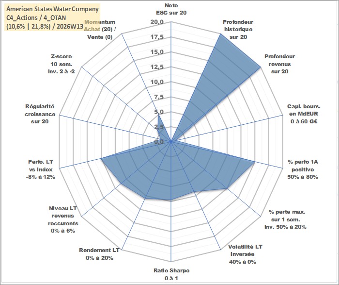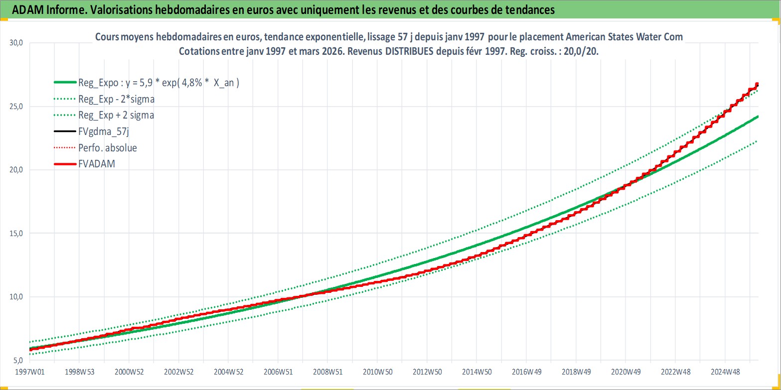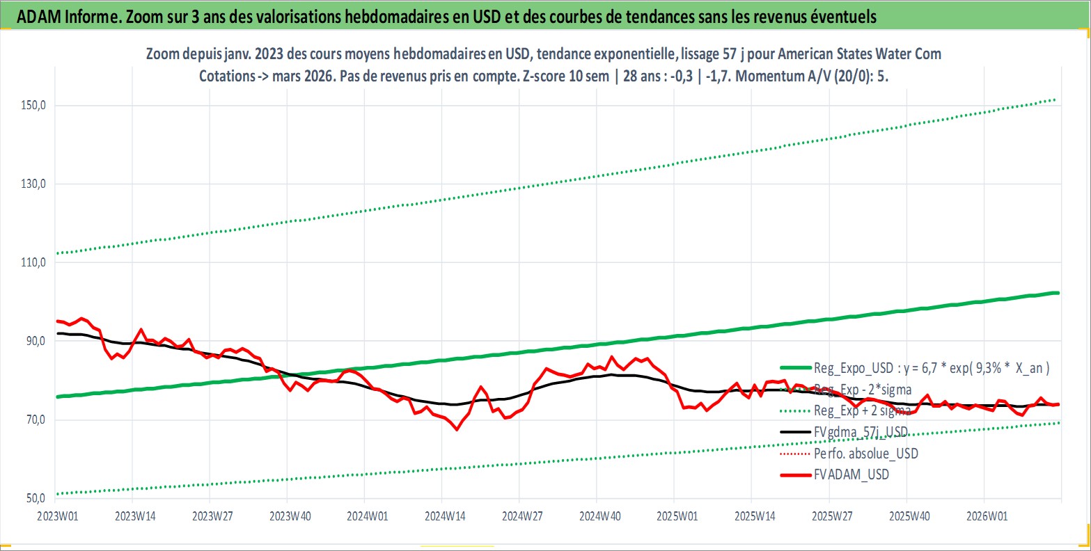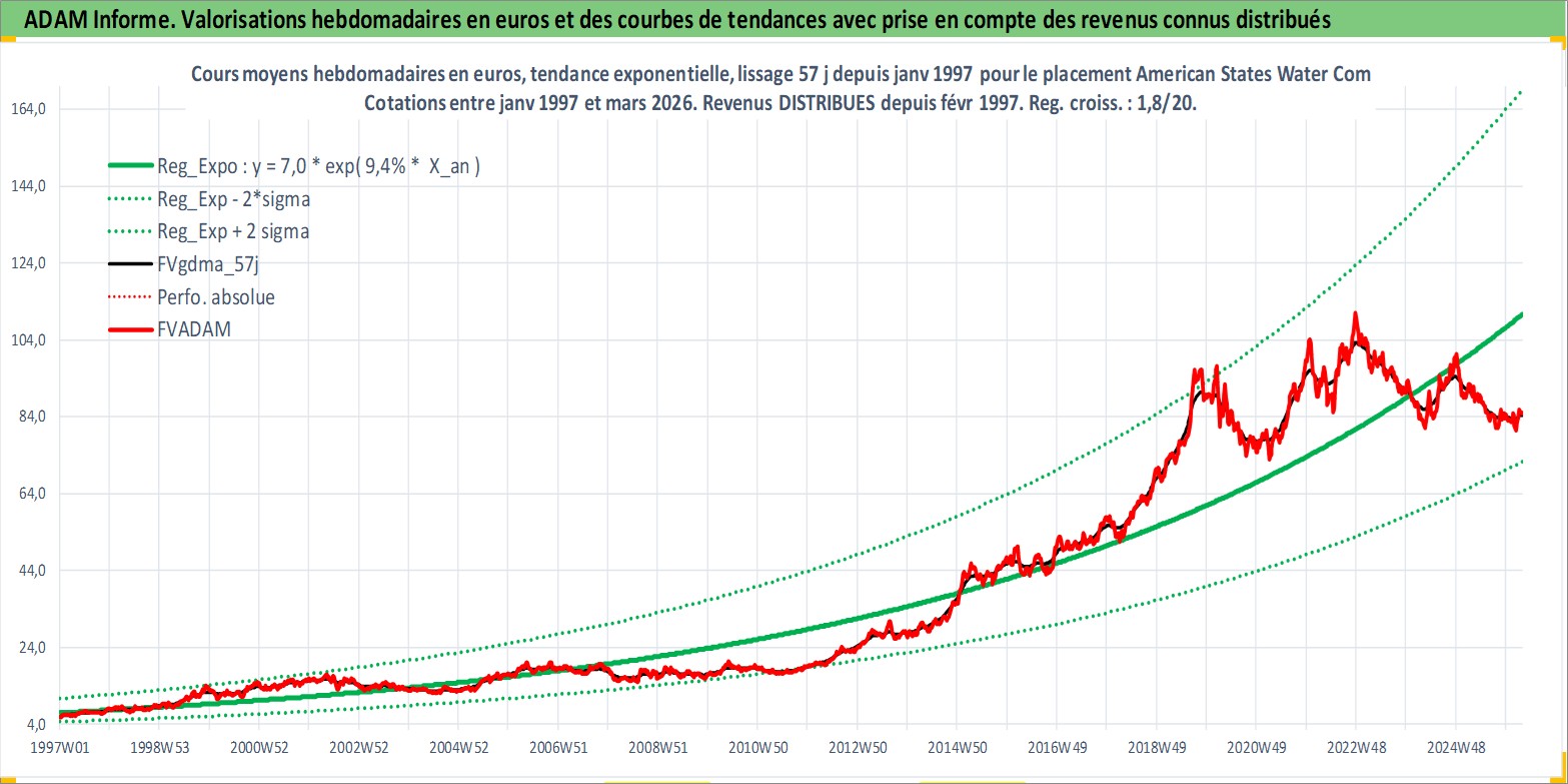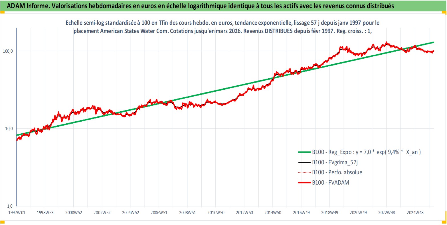 Site dédié aux investisseursPage dédiée sur site financeAnalyse des valorisations hebdomadaires de l'action American States Water Company. Cet actif est cote en USD. Les valorisations sont en contrevaleur EURO et couvrent les semaines 1997W01 a 2026W13. Les revenus de cet actif financier sont pris en compte depuis la semaine 1997W06. La note ESG de cet actif n'est pas connue.