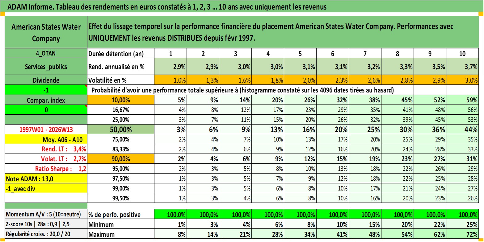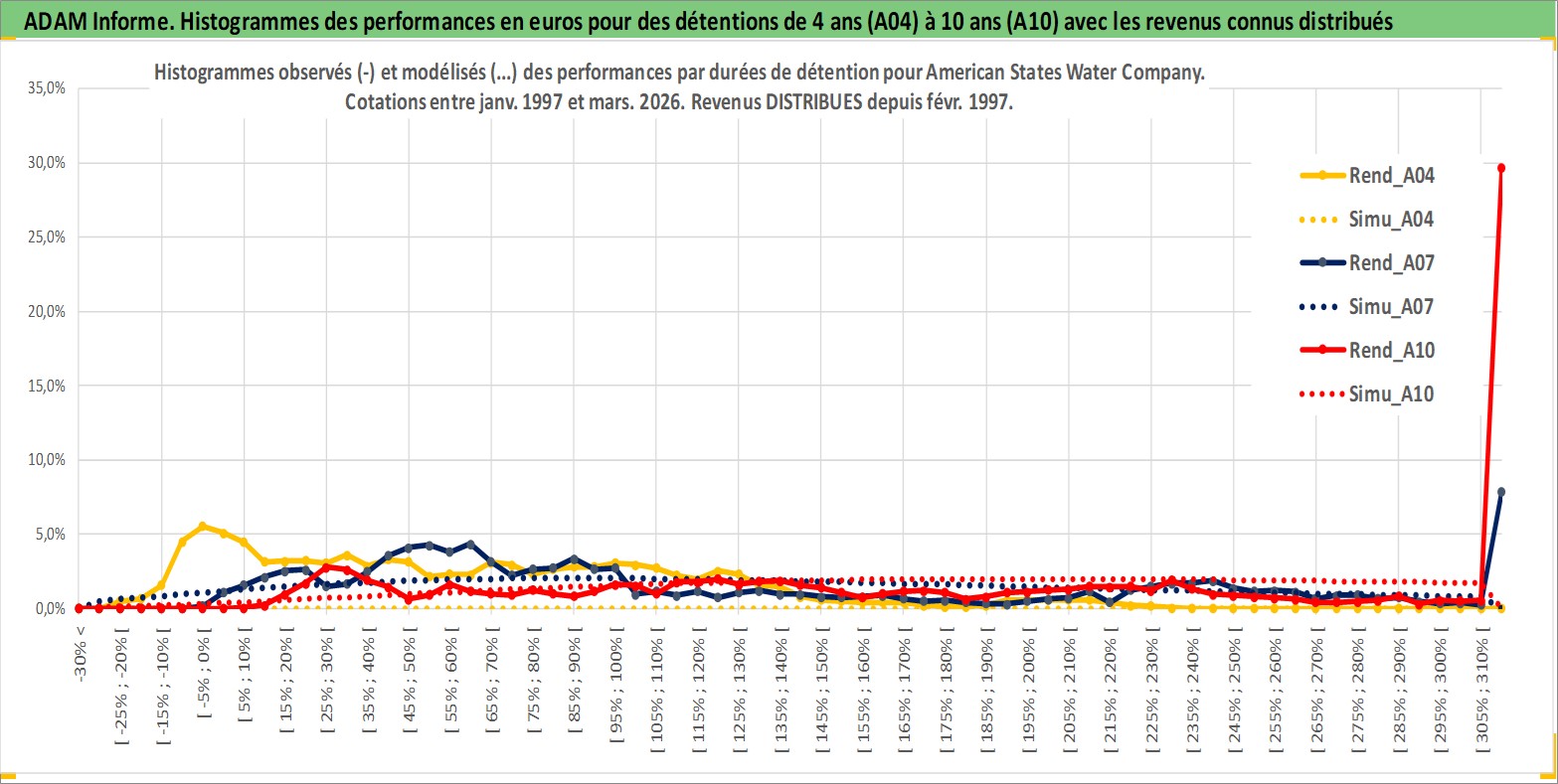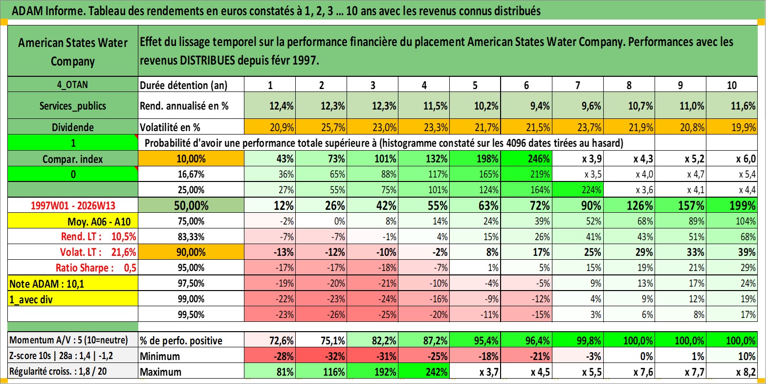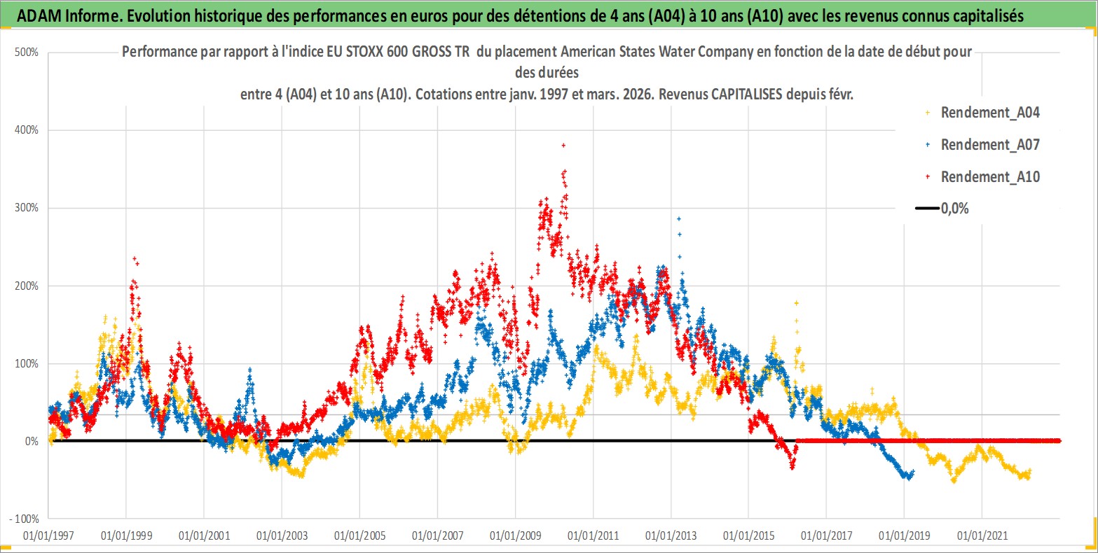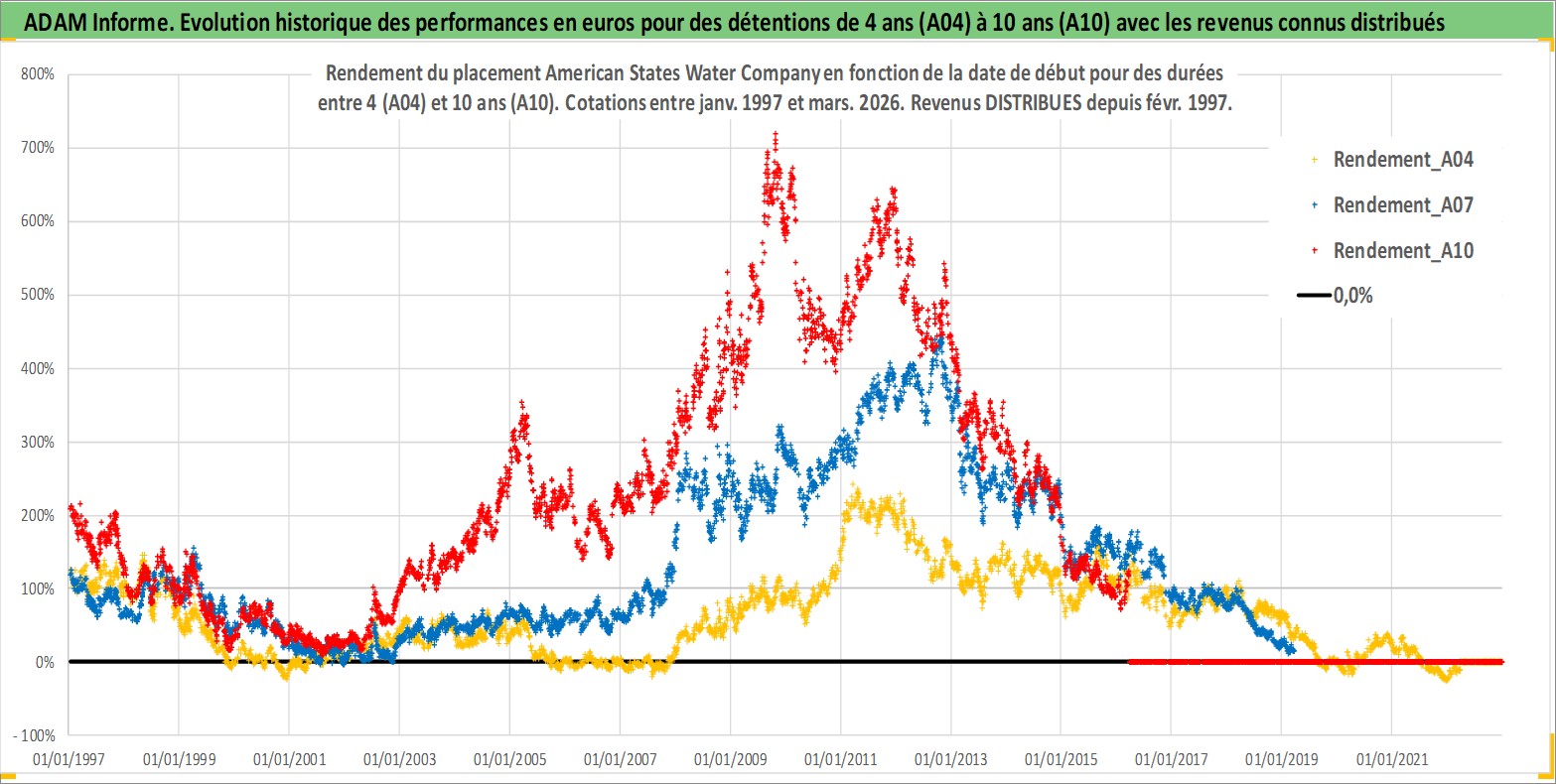 Site dédié aux investisseursPage dédiée sur site financeAnalyse des valorisations hebdomadaires de l'action American States Water Company. Cet actif est cote en USD. Les valorisations sont en contrevaleur EURO et couvrent les semaines 1997W01 a 2026W13. Les revenus de cet actif financier sont pris en compte depuis la semaine 1997W06. La note ESG de cet actif n'est pas connue.