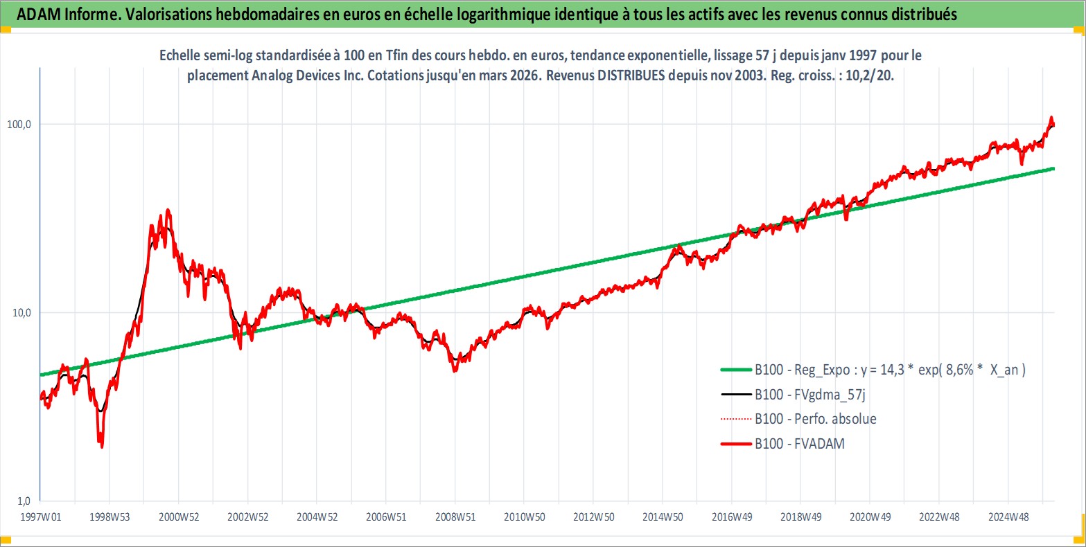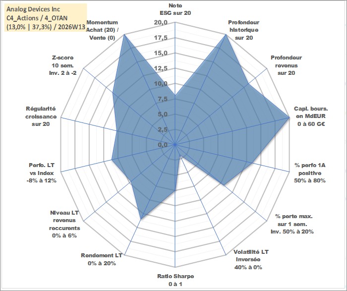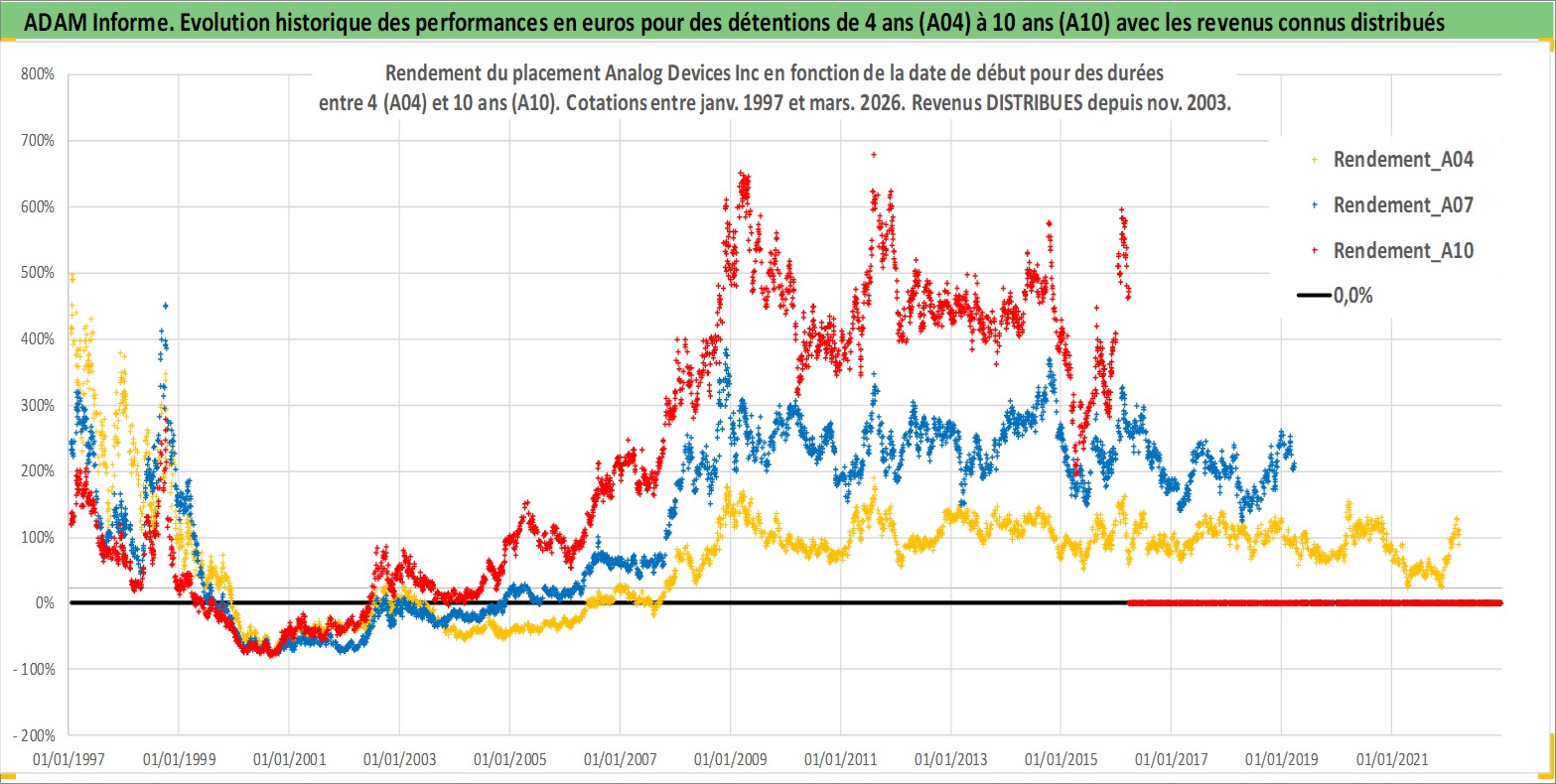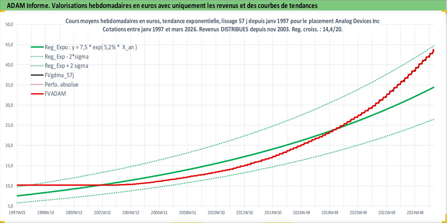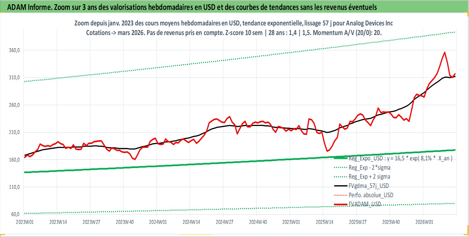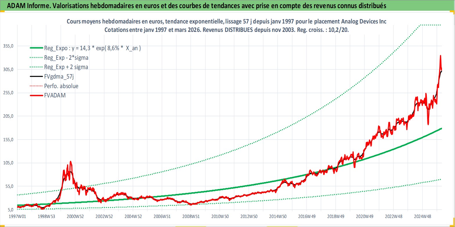 Site dédié aux investisseursPage dédiée sur site financeAnalyse des valorisations hebdomadaires de l'action Analog Devices Inc. Cet actif est cote en USD. Les valorisations sont en contrevaleur EURO et couvrent les semaines 1997W01 a 2026W13. Les revenus de cet actif financier sont pris en compte depuis la semaine 2003W48. La note globale ESG de cet actif est estimee a 8.0 (apres rebasage entre 0 et 20).