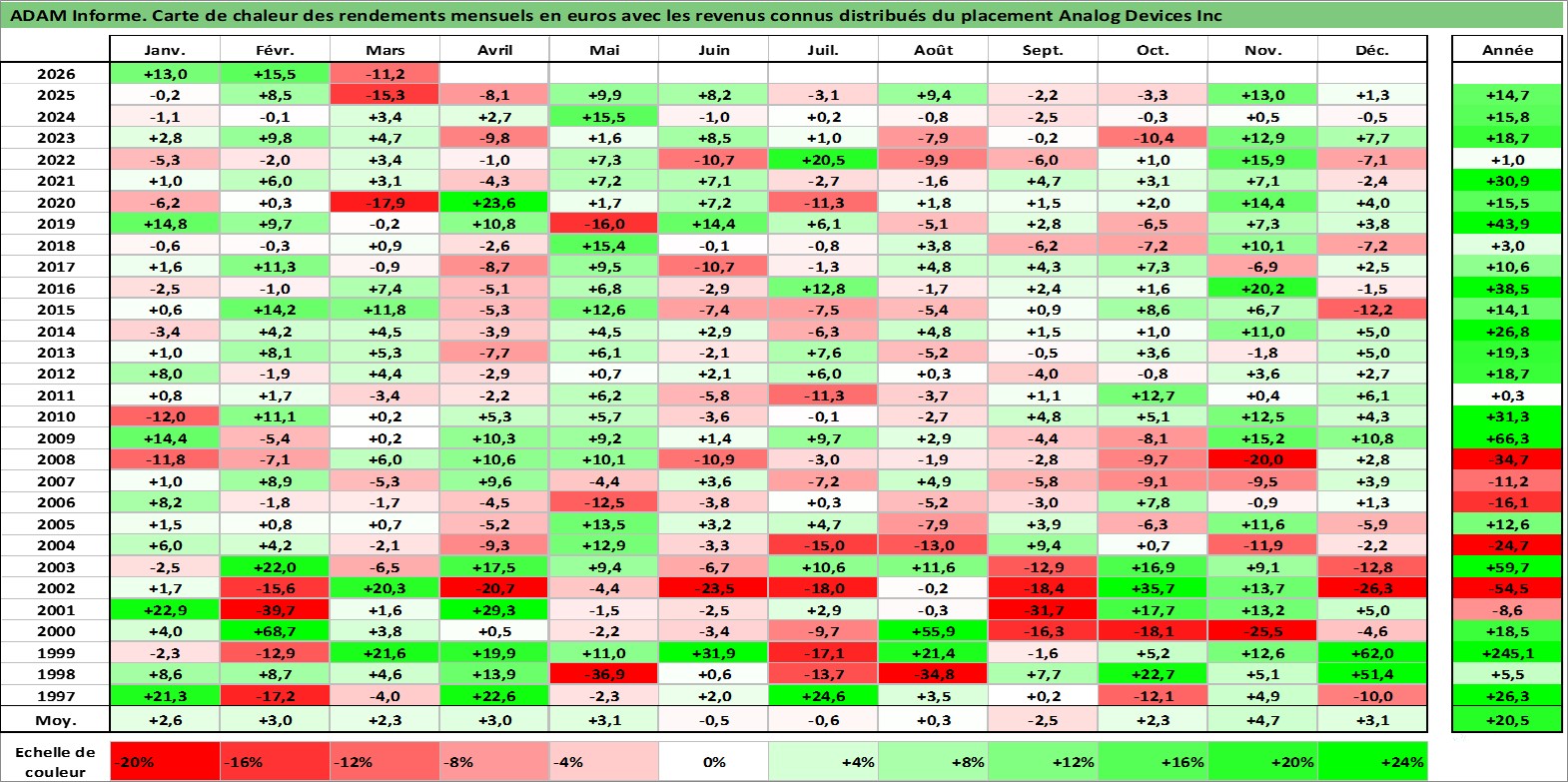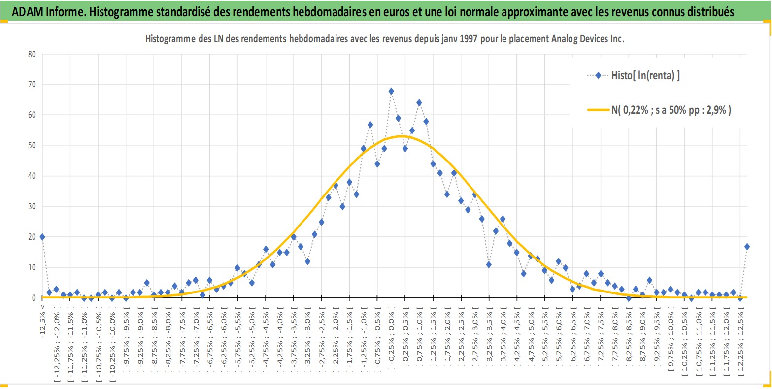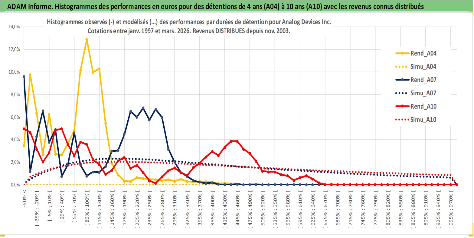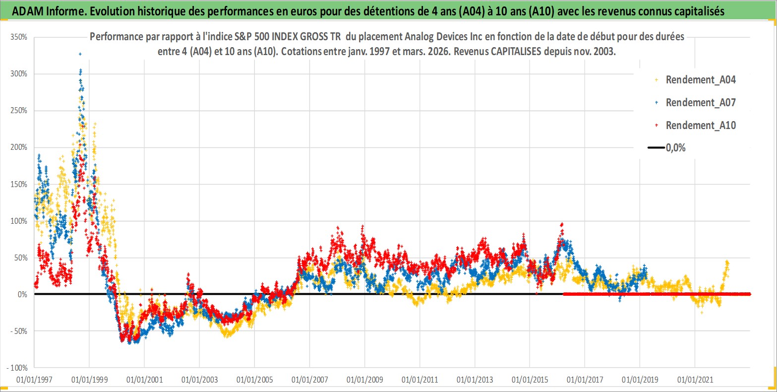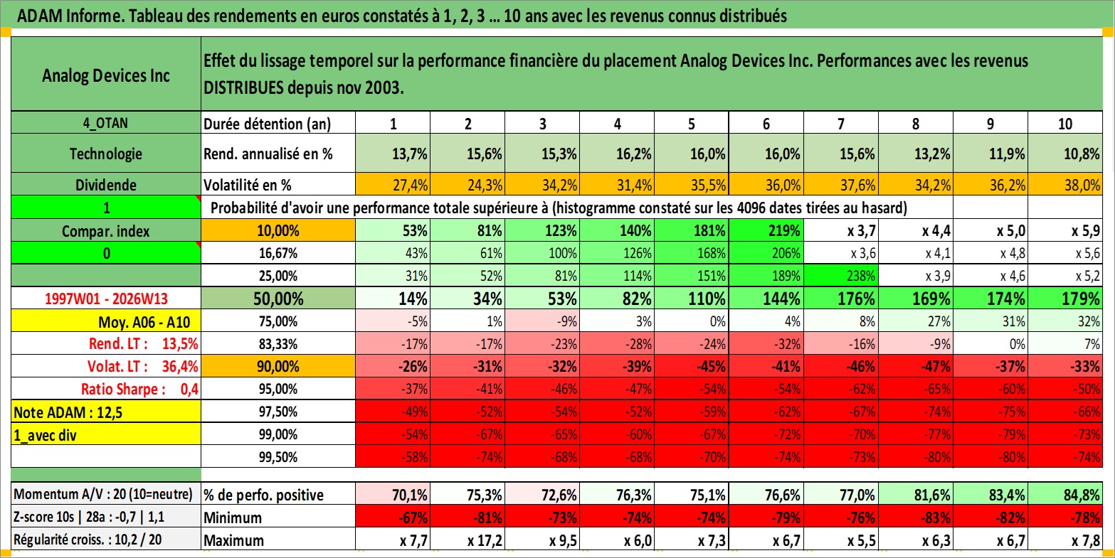 Site dédié aux investisseursPage dédiée sur site financeAnalyse des valorisations hebdomadaires de l'action Analog Devices Inc. Cet actif est cote en USD. Les valorisations sont en contrevaleur EURO et couvrent les semaines 1997W01 a 2026W13. Les revenus de cet actif financier sont pris en compte depuis la semaine 2003W48. La note globale ESG de cet actif est estimee a 8.0 (apres rebasage entre 0 et 20).