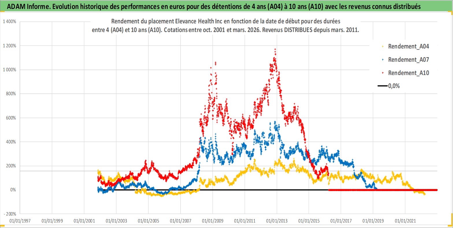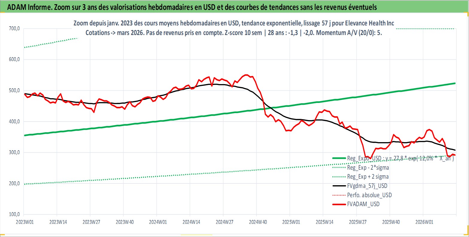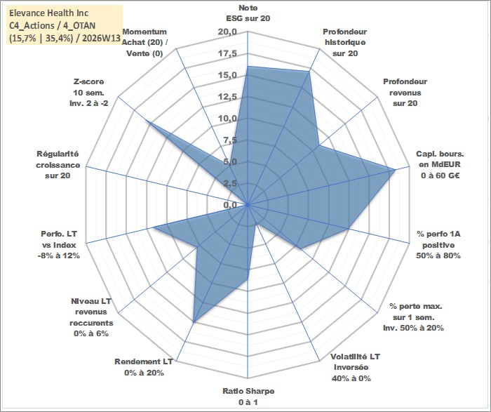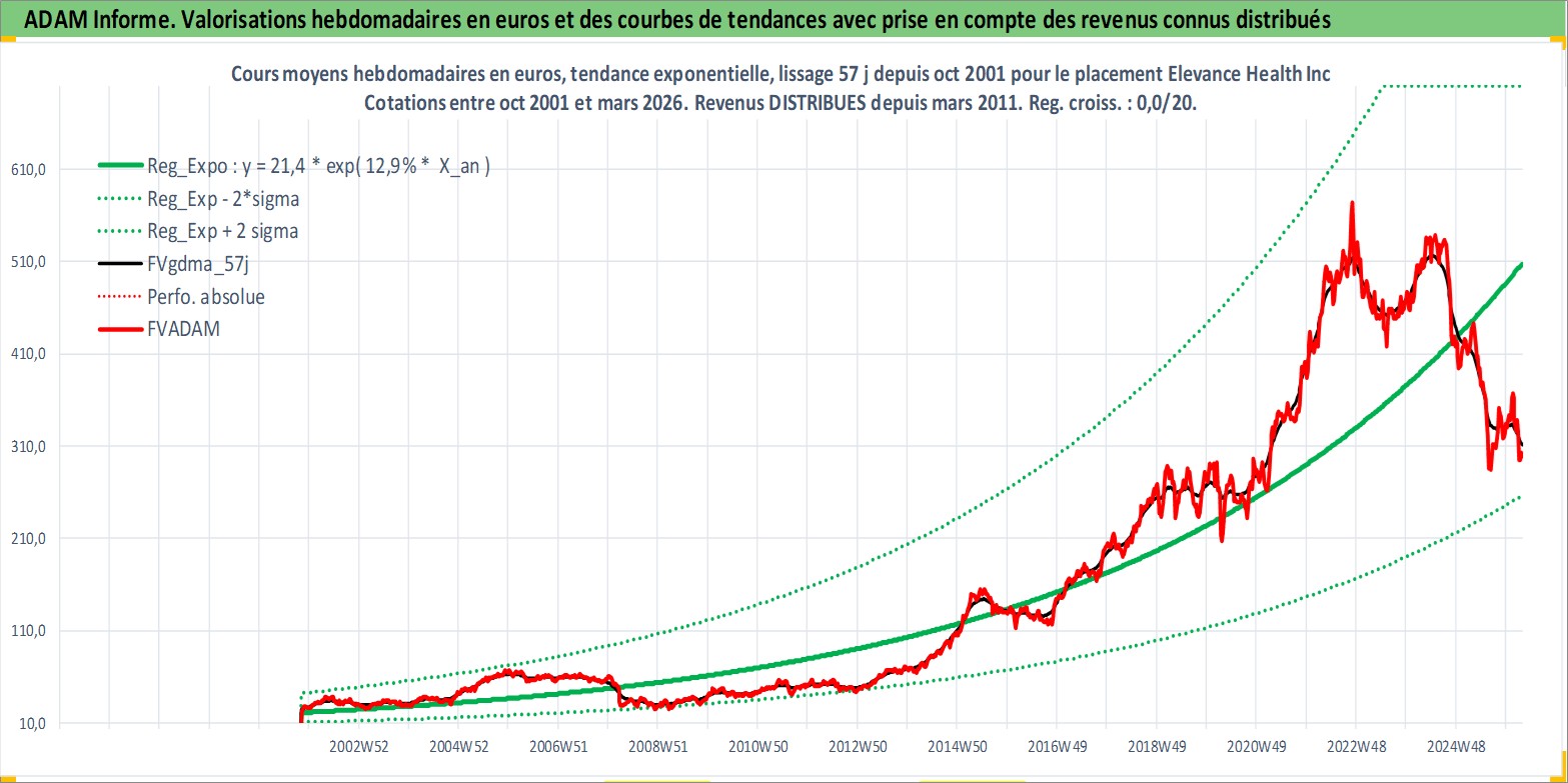 Site dédié aux investisseursPage dédiée sur site financeAnalyse des valorisations hebdomadaires de l'action Elevance Health Inc. Cet actif est cote en USD. Les valorisations sont en contrevaleur EURO et couvrent les semaines 2001W44 a 2026W13. Les revenus de cet actif financier sont pris en compte depuis la semaine 2011W10. La note globale ESG de cet actif est estimee a 16.0 (apres rebasage entre 0 et 20).