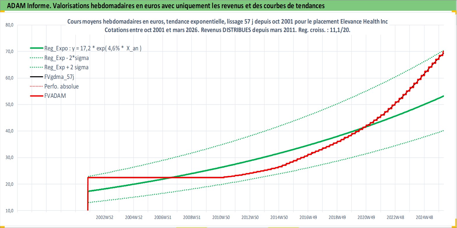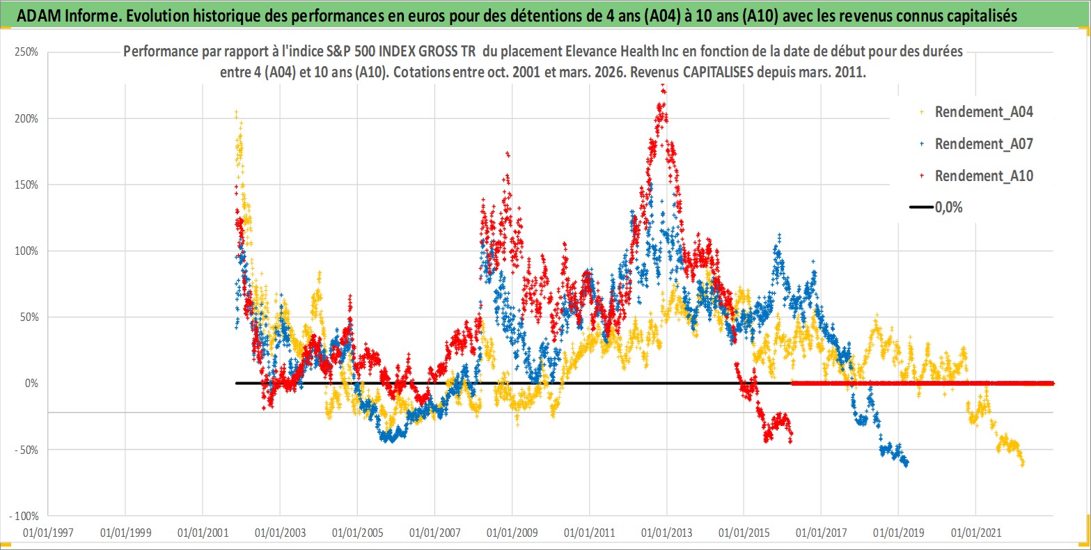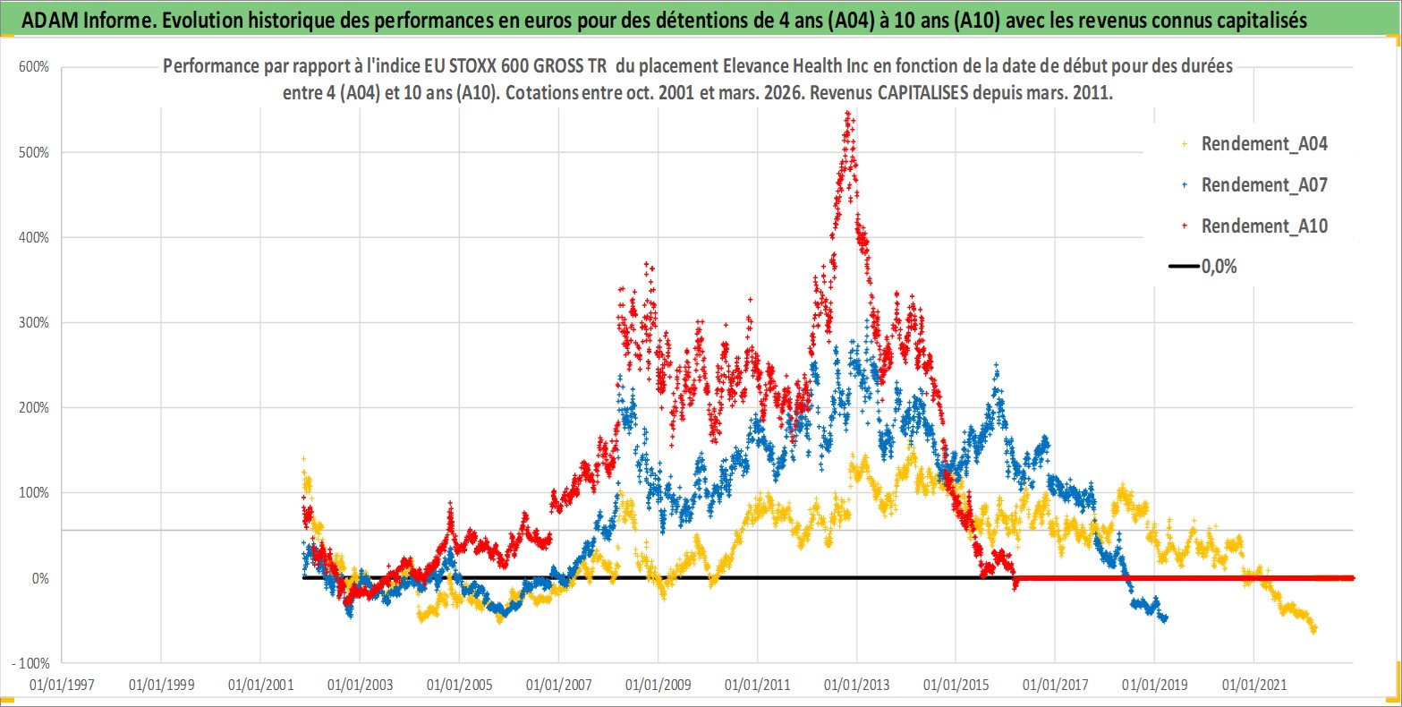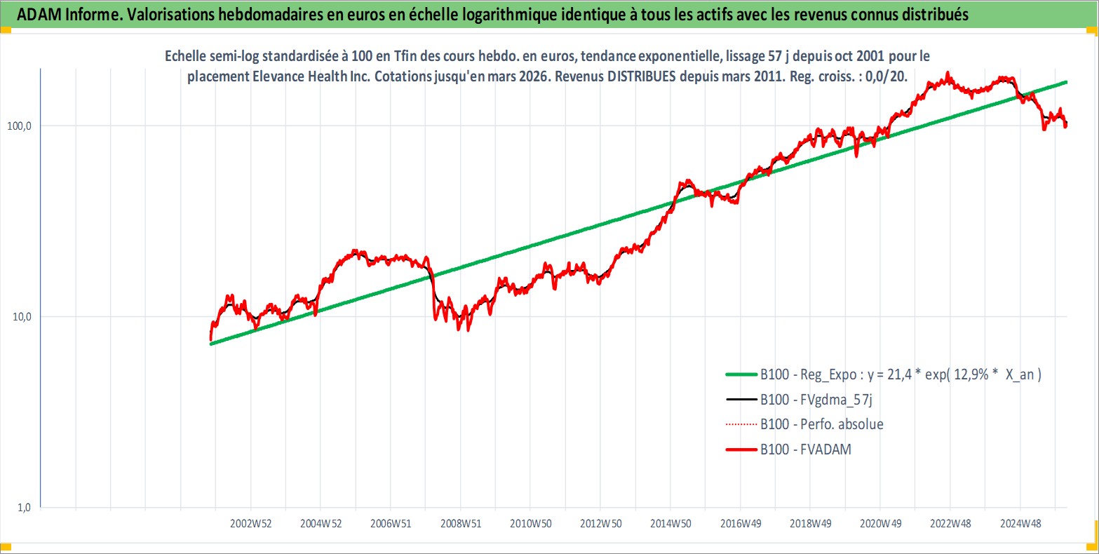 Site dédié aux investisseursPage dédiée sur site financeAnalyse des valorisations hebdomadaires de l'action Elevance Health Inc. Cet actif est cote en USD. Les valorisations sont en contrevaleur EURO et couvrent les semaines 2001W44 a 2026W13. Les revenus de cet actif financier sont pris en compte depuis la semaine 2011W10. La note globale ESG de cet actif est estimee a 16.0 (apres rebasage entre 0 et 20).