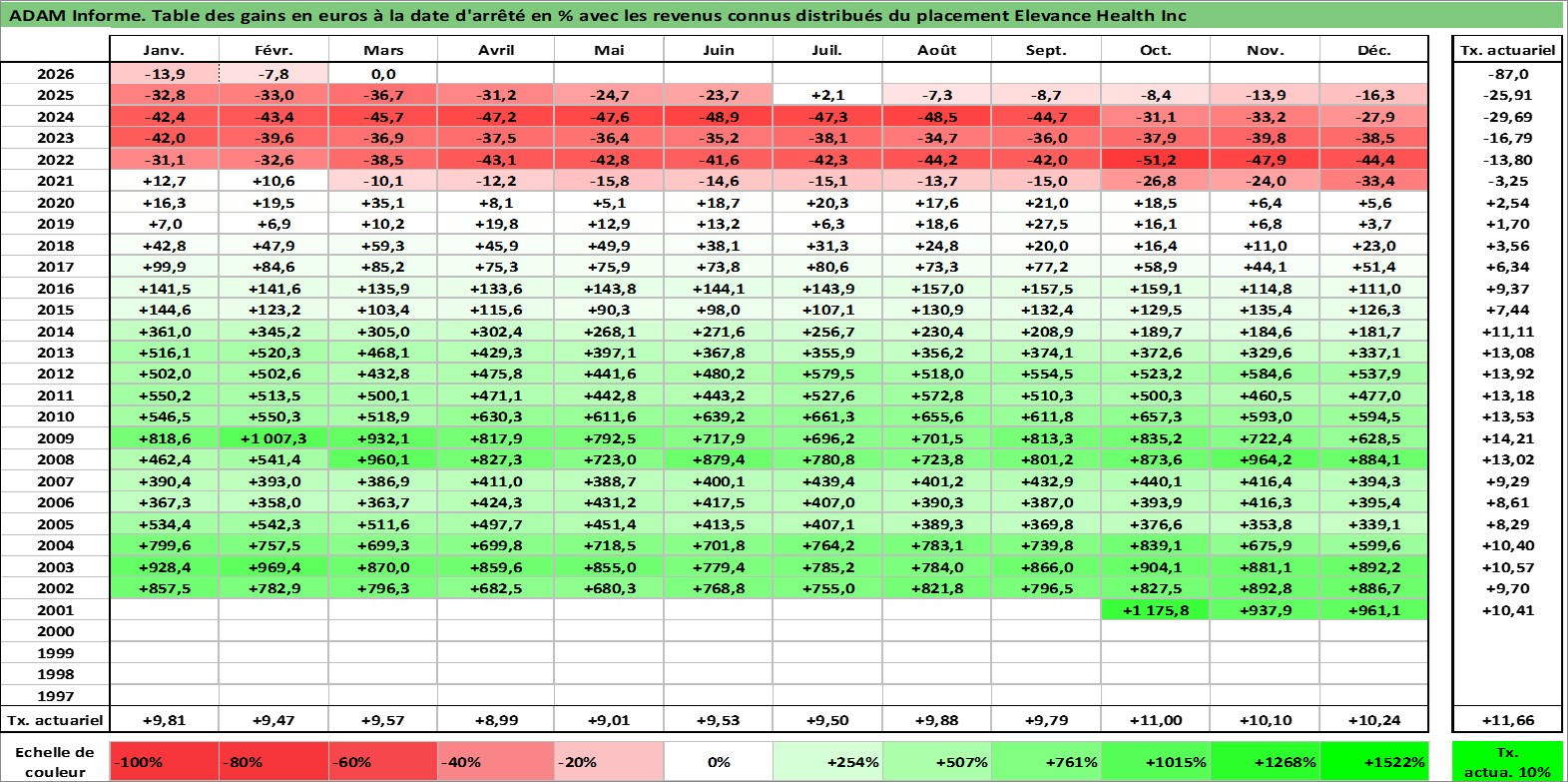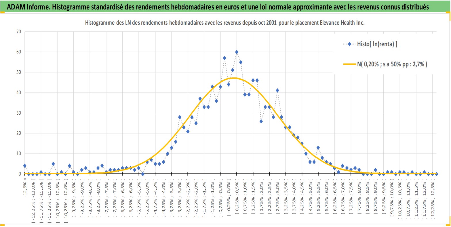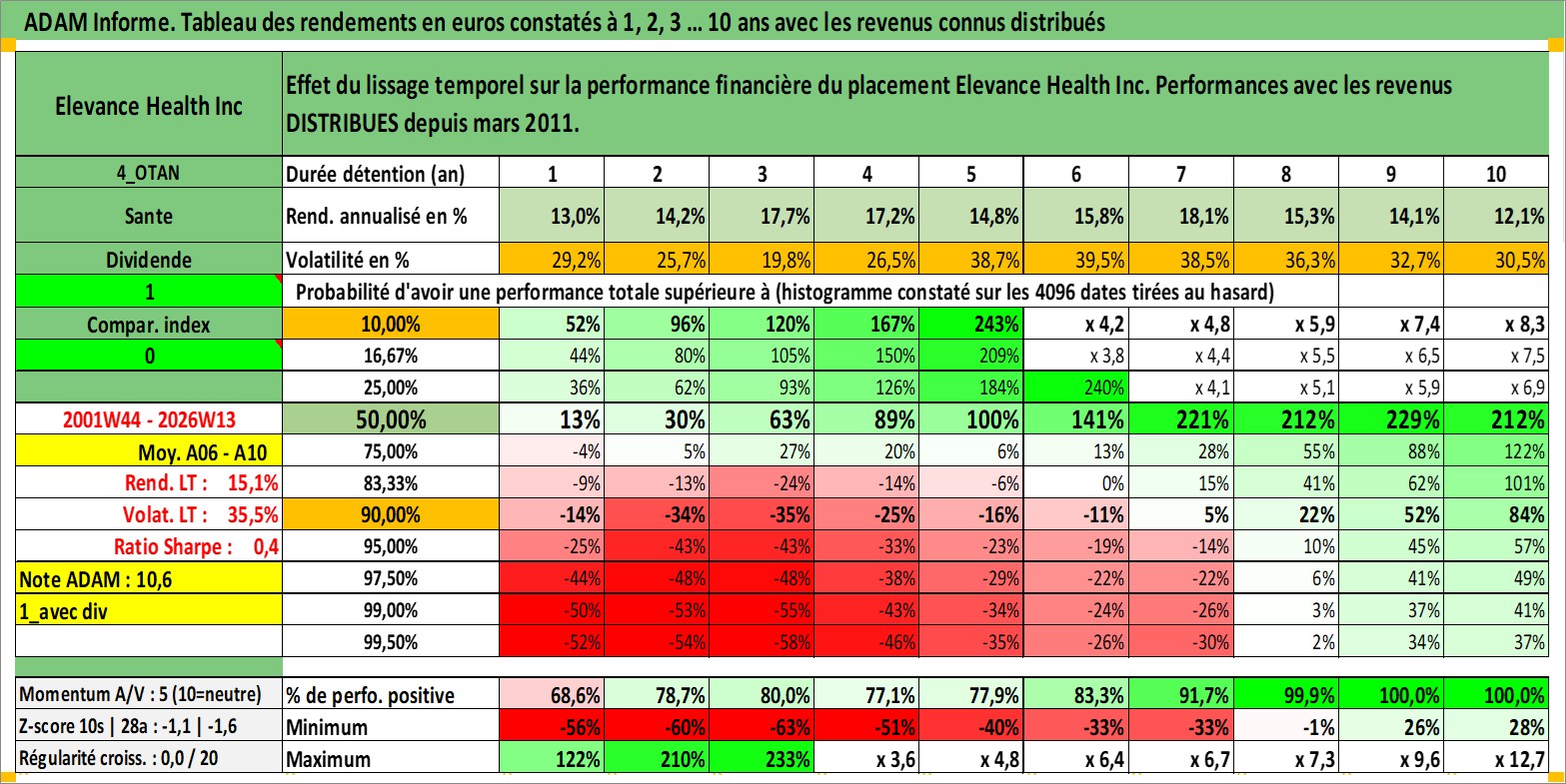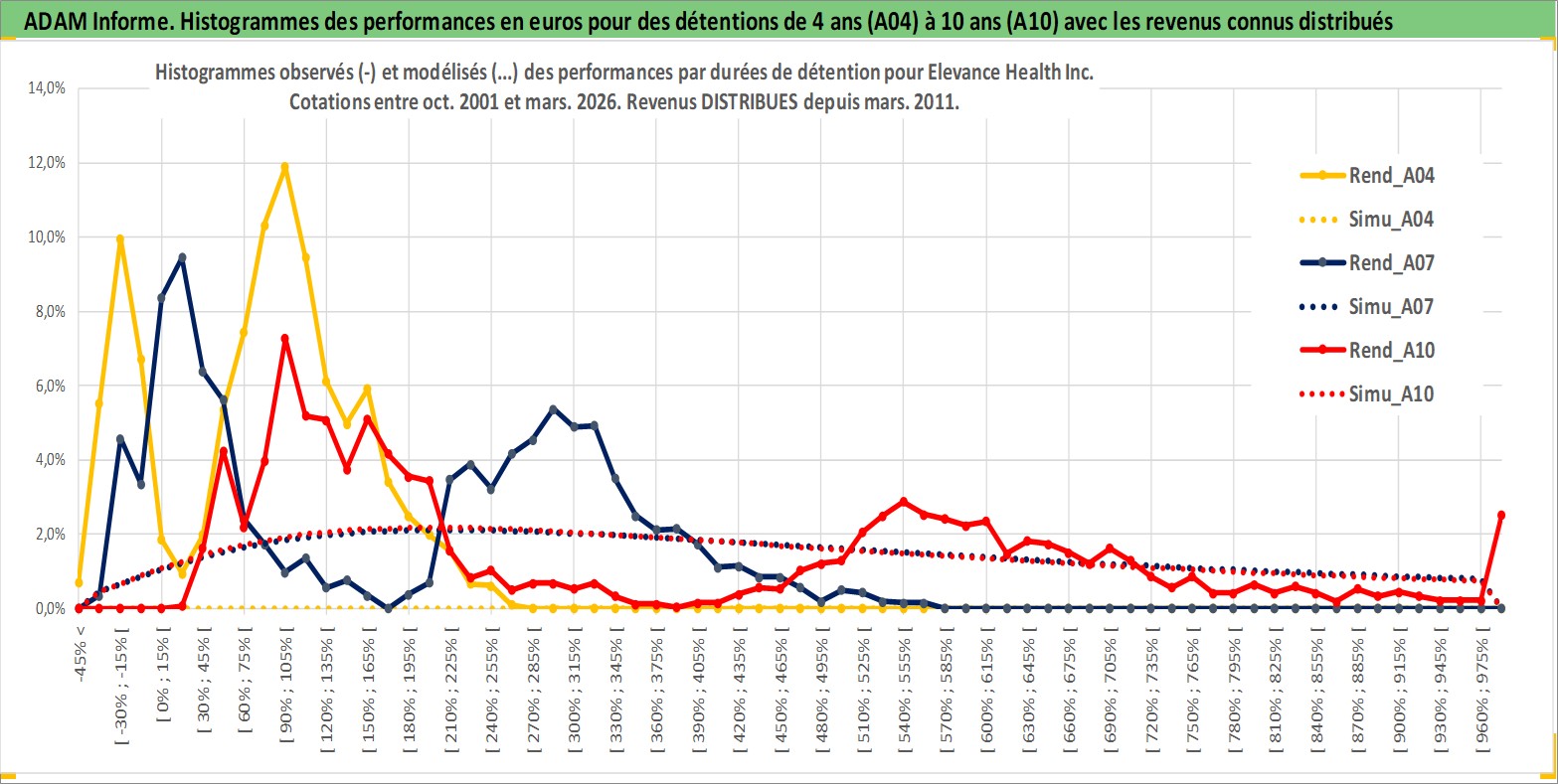 Site dédié aux investisseursPage dédiée sur site financeAnalyse des valorisations hebdomadaires de l'action Elevance Health Inc. Cet actif est cote en USD. Les valorisations sont en contrevaleur EURO et couvrent les semaines 2001W44 a 2026W13. Les revenus de cet actif financier sont pris en compte depuis la semaine 2011W10. La note globale ESG de cet actif est estimee a 16.0 (apres rebasage entre 0 et 20).