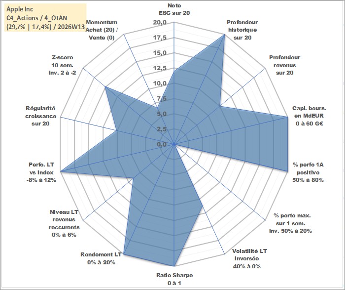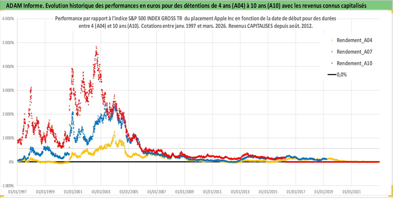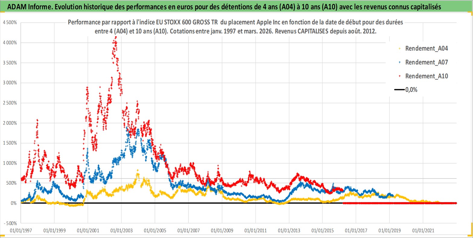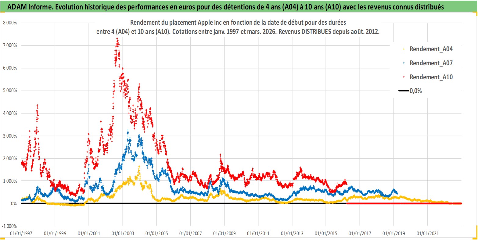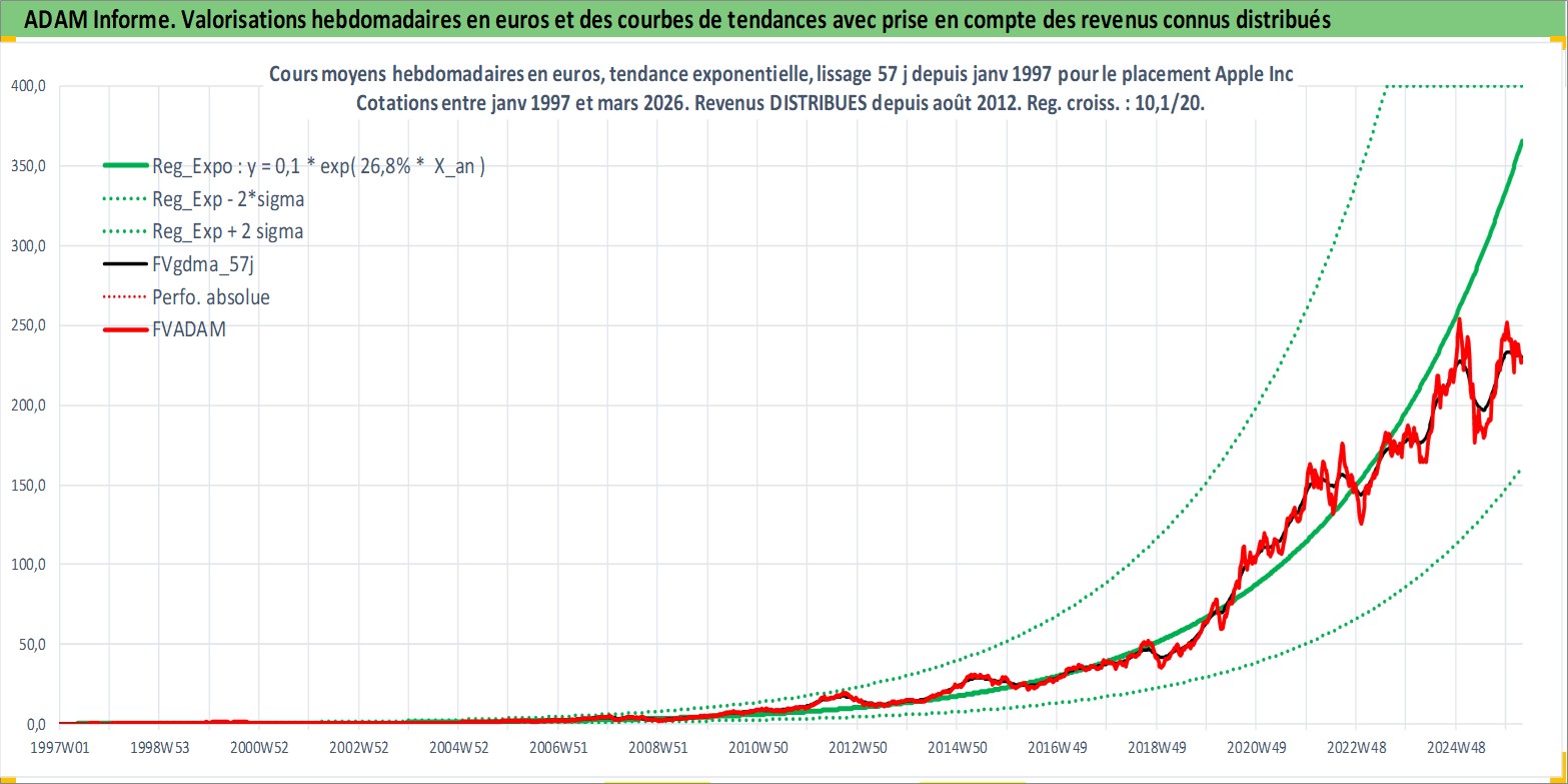 Site dédié aux investisseursPage dédiée sur site financeAnalyse des valorisations hebdomadaires de l'action Apple Inc. Cet actif est cote en USD. Les valorisations sont en contrevaleur EURO et couvrent les semaines 1997W01 a 2026W13. Les revenus de cet actif financier sont pris en compte depuis la semaine 2012W32. La note globale ESG de cet actif est estimee a 12.0 (apres rebasage entre 0 et 20).