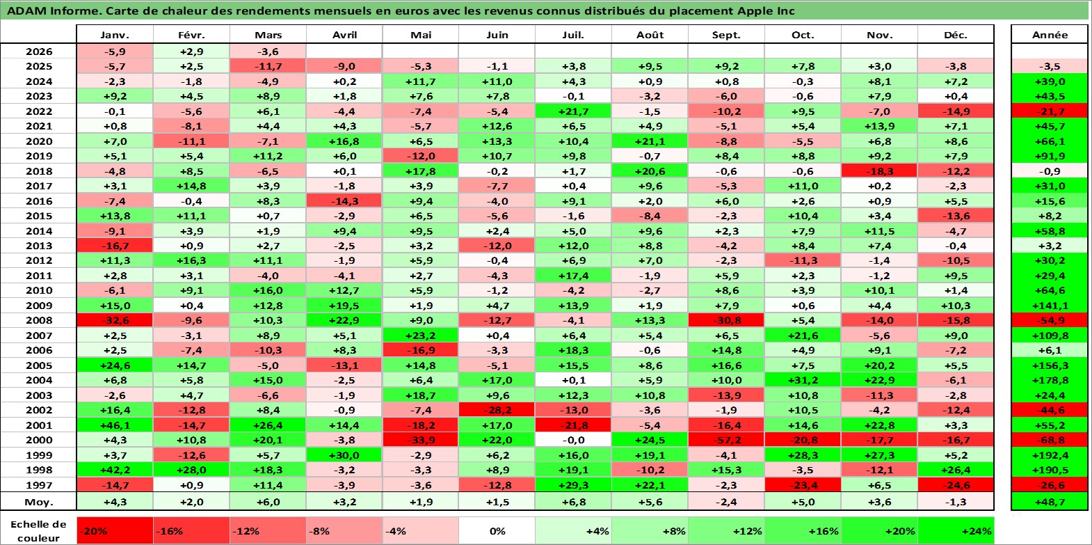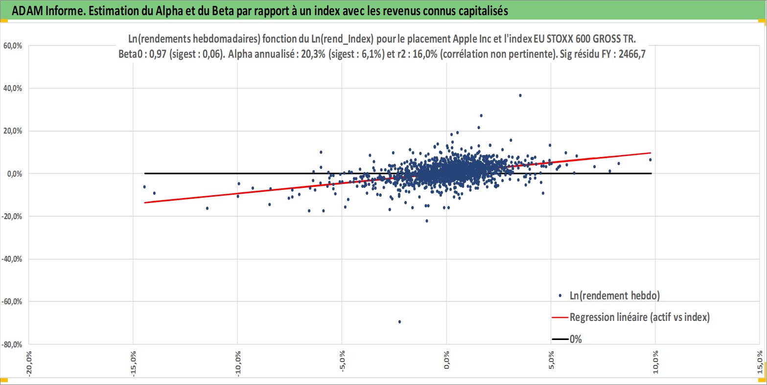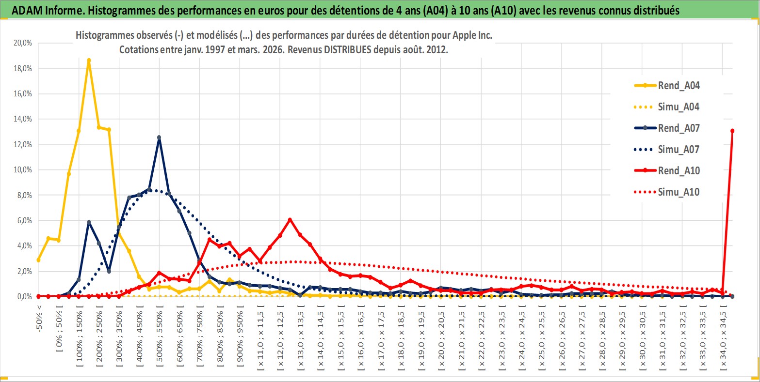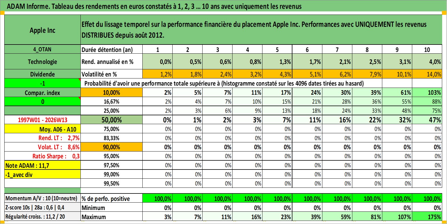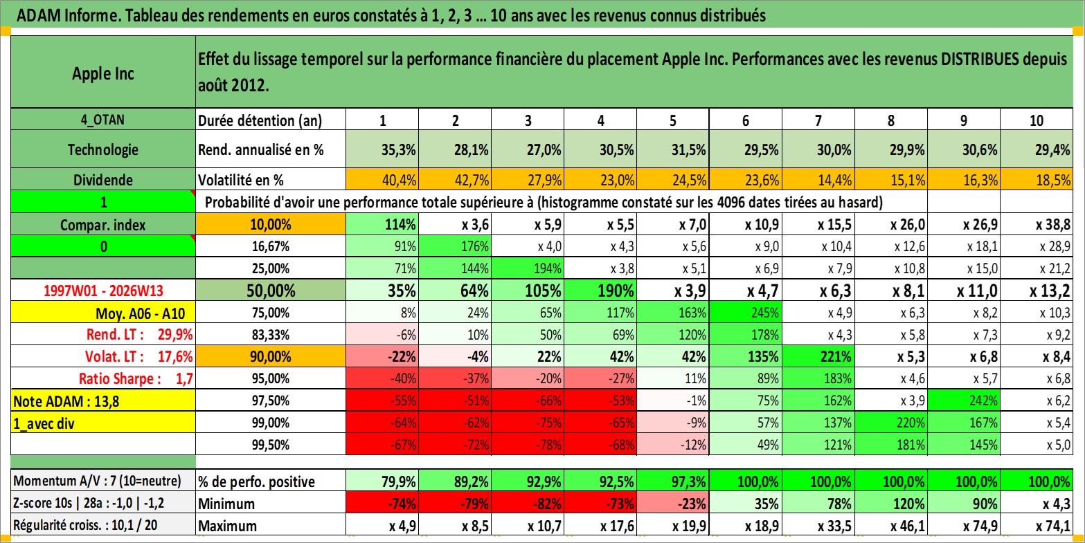 Site dédié aux investisseursPage dédiée sur site financeAnalyse des valorisations hebdomadaires de l'action Apple Inc. Cet actif est cote en USD. Les valorisations sont en contrevaleur EURO et couvrent les semaines 1997W01 a 2026W13. Les revenus de cet actif financier sont pris en compte depuis la semaine 2012W32. La note globale ESG de cet actif est estimee a 12.0 (apres rebasage entre 0 et 20).
