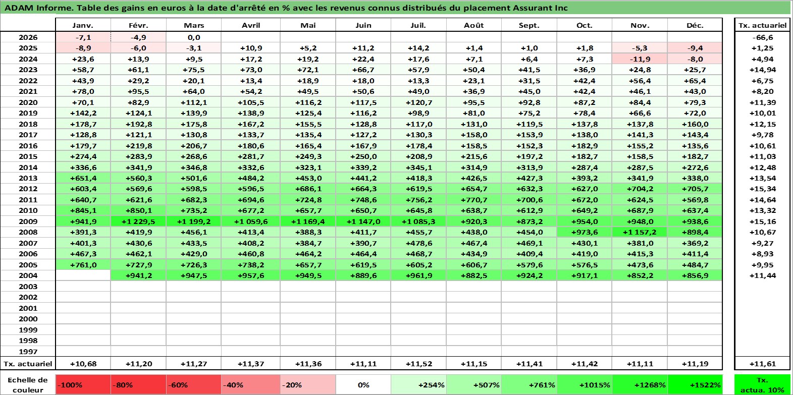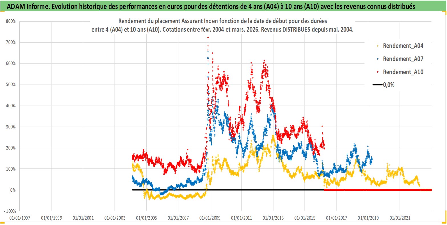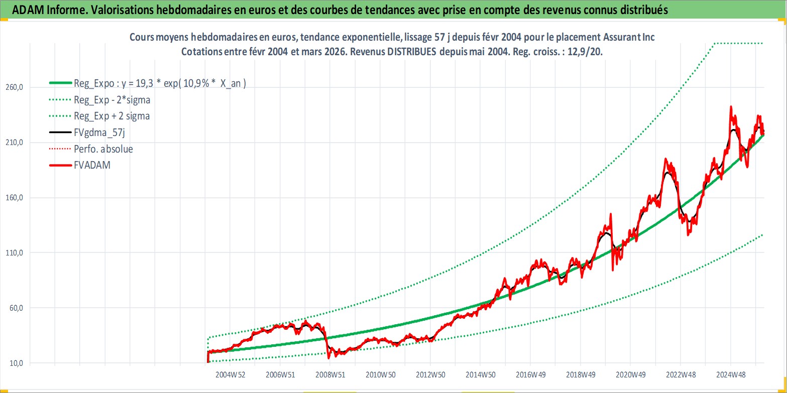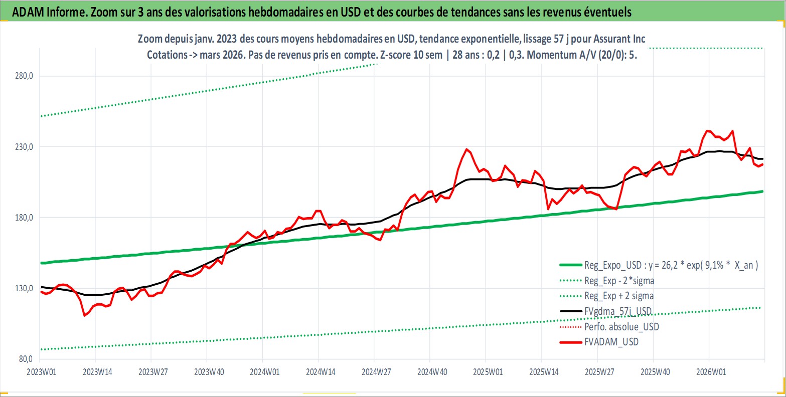 Site dédié aux investisseursPage dédiée sur site financeAnalyse des valorisations hebdomadaires de l'action Assurant Inc. Cet actif est cote en USD. Les valorisations sont en contrevaleur EURO et couvrent les semaines 2004W06 a 2026W13. Les revenus de cet actif financier sont pris en compte depuis la semaine 2004W21. La note globale ESG de cet actif est estimee a 8.0 (apres rebasage entre 0 et 20).