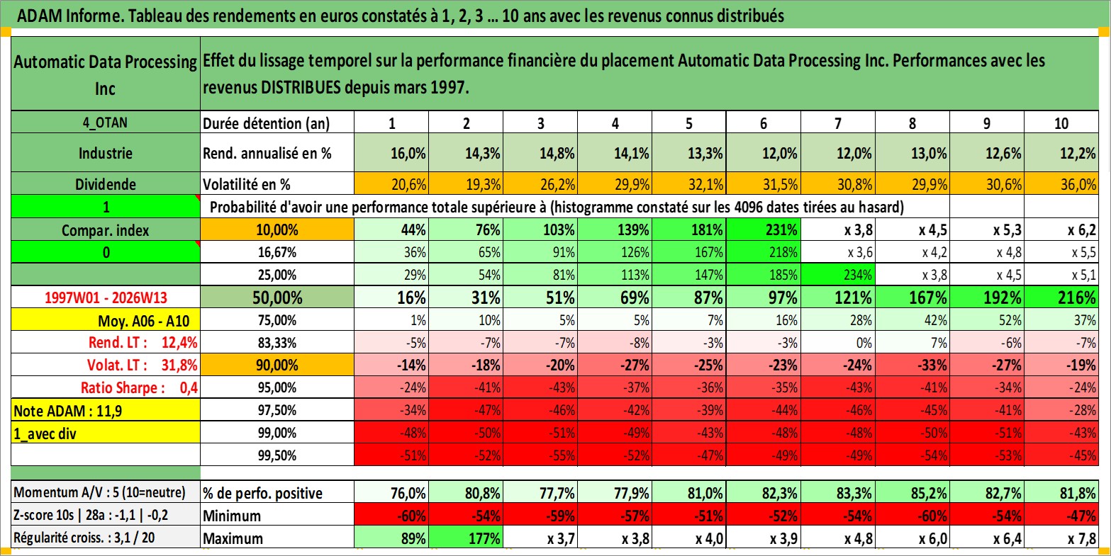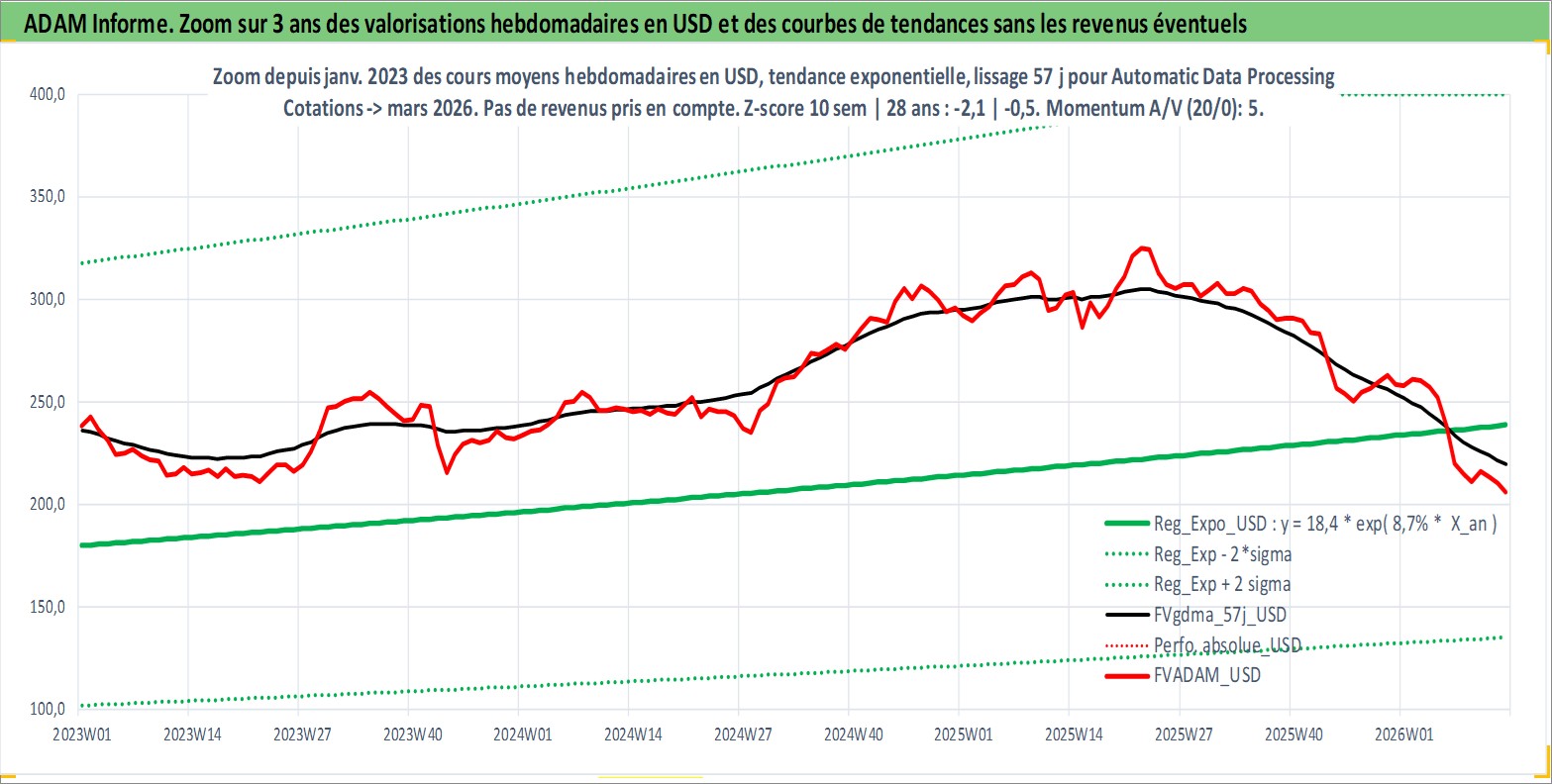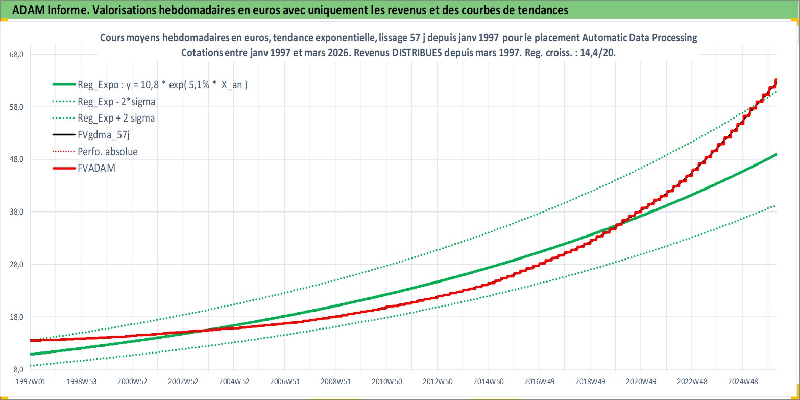 Site dédié aux investisseursPage dédiée sur site financeAnalyse des valorisations hebdomadaires de l'action Automatic Data Processing Inc. Cet actif est cote en USD. Les valorisations sont en contrevaleur EURO et couvrent les semaines 1997W01 a 2026W13. Les revenus de cet actif financier sont pris en compte depuis la semaine 1997W11. La note globale ESG de cet actif est estimee a 14.0 (apres rebasage entre 0 et 20).