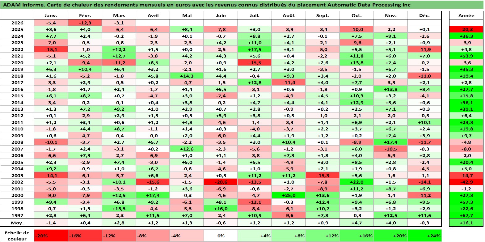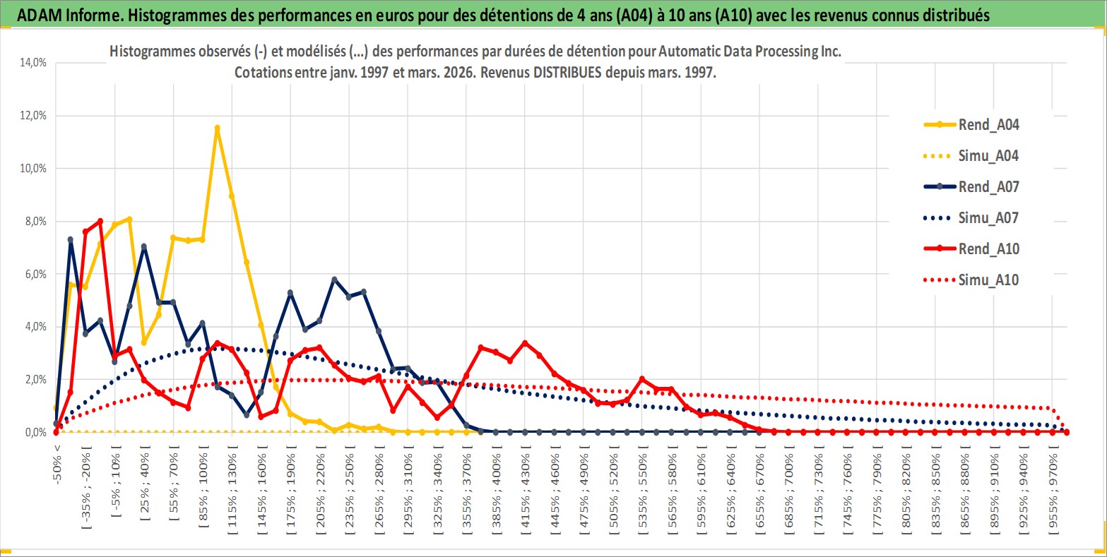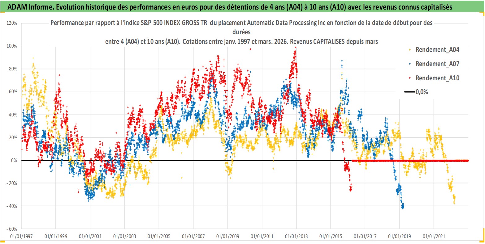 Site dédié aux investisseursPage dédiée sur site financeAnalyse des valorisations hebdomadaires de l'action Automatic Data Processing Inc. Cet actif est cote en USD. Les valorisations sont en contrevaleur EURO et couvrent les semaines 1997W01 a 2026W13. Les revenus de cet actif financier sont pris en compte depuis la semaine 1997W11. La note globale ESG de cet actif est estimee a 14.0 (apres rebasage entre 0 et 20).