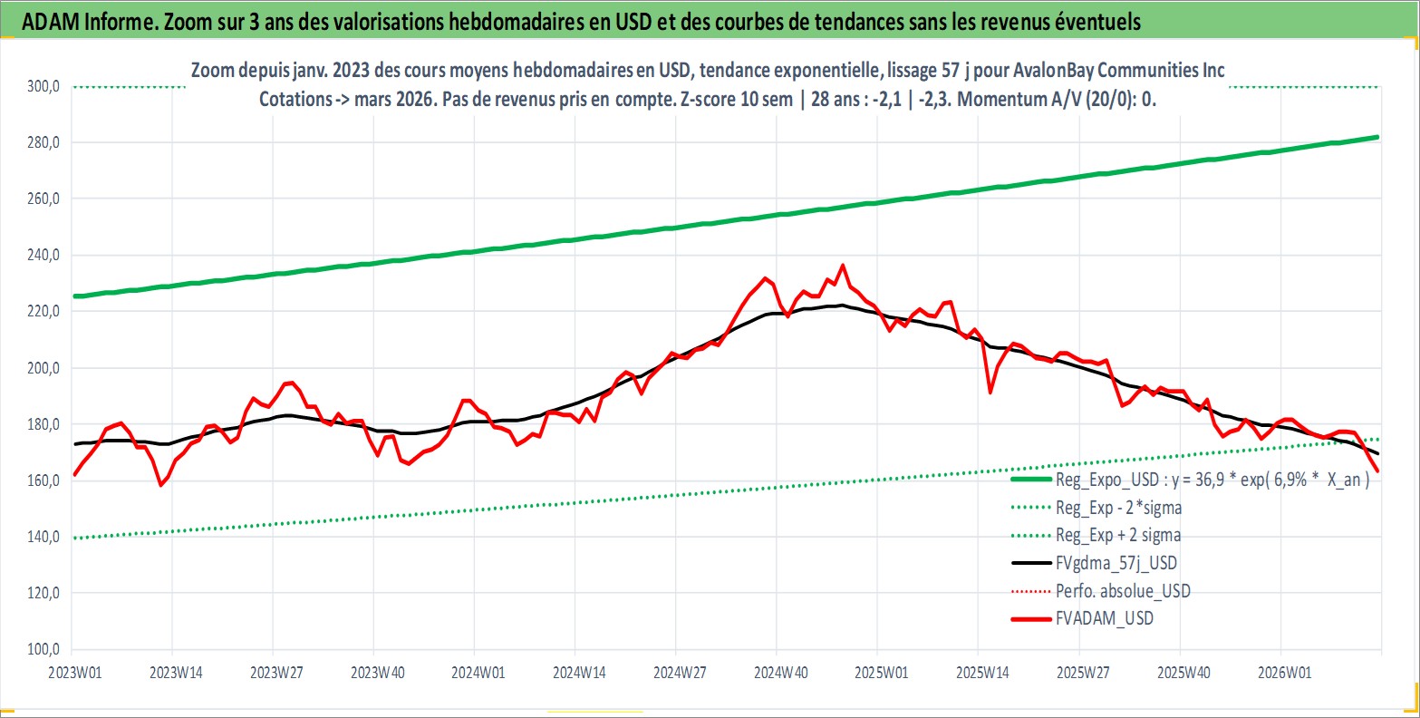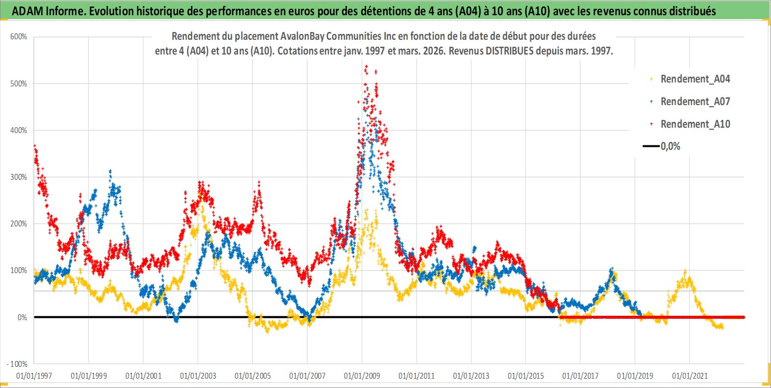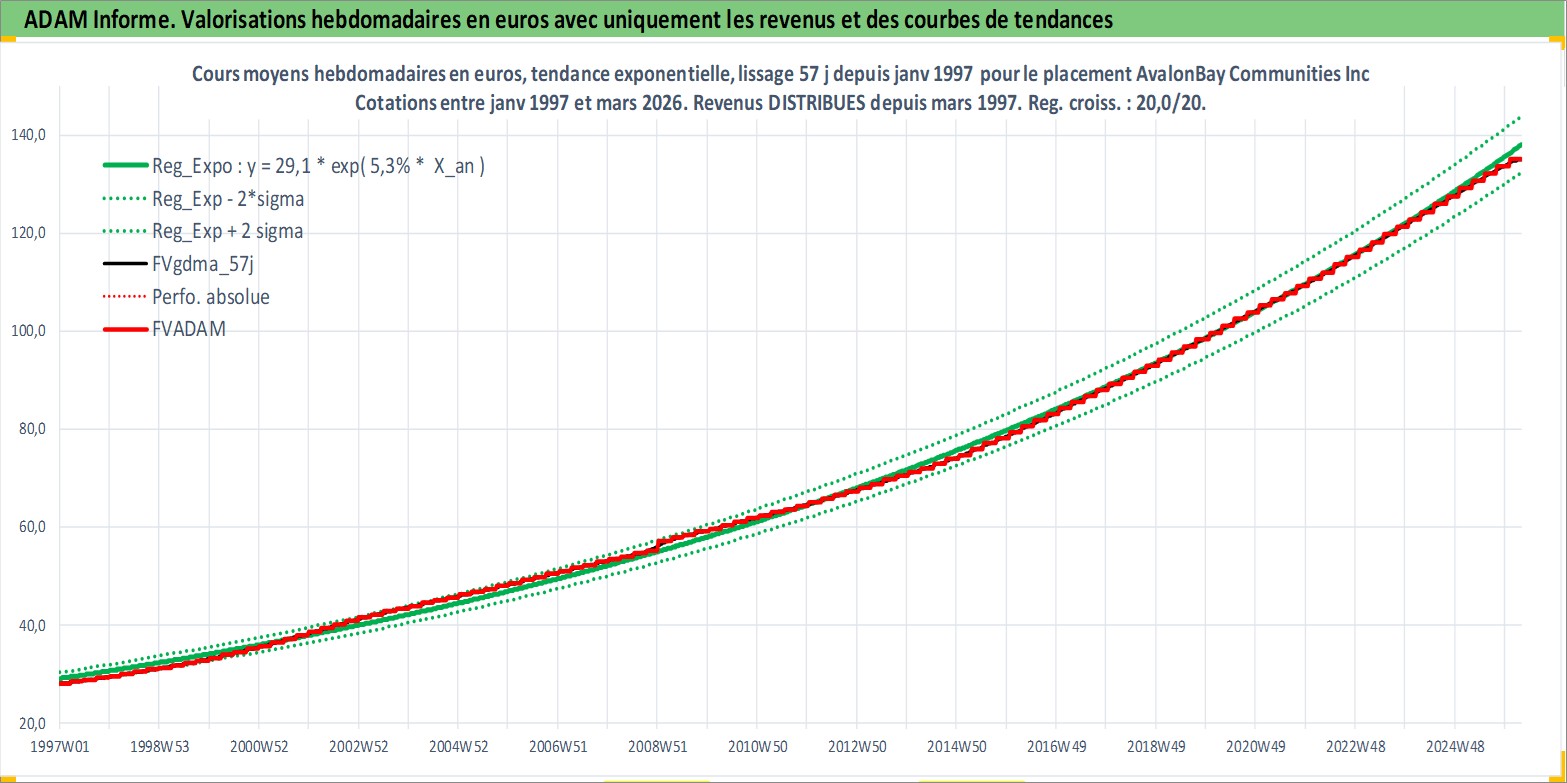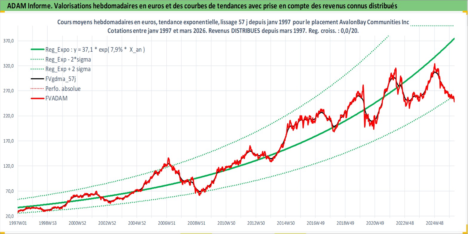 Site dédié aux investisseursPage dédiée sur site financeAnalyse des valorisations hebdomadaires de l'action AvalonBay Communities Inc. Cet actif est cote en USD. Les valorisations sont en contrevaleur EURO et couvrent les semaines 1997W01 a 2026W13. Les revenus de cet actif financier sont pris en compte depuis la semaine 1997W13. La note globale ESG de cet actif est estimee a 16.0 (apres rebasage entre 0 et 20).