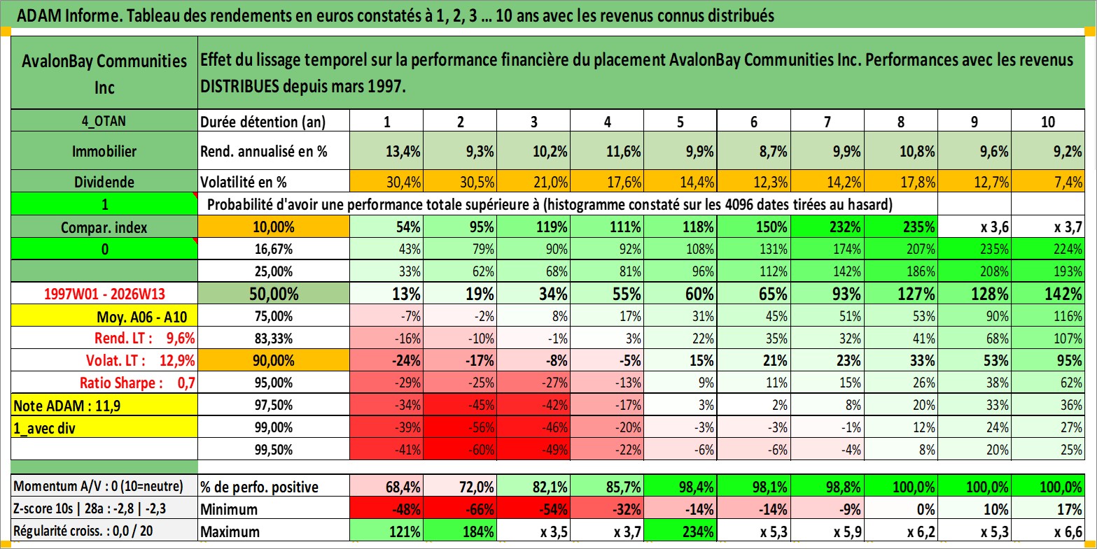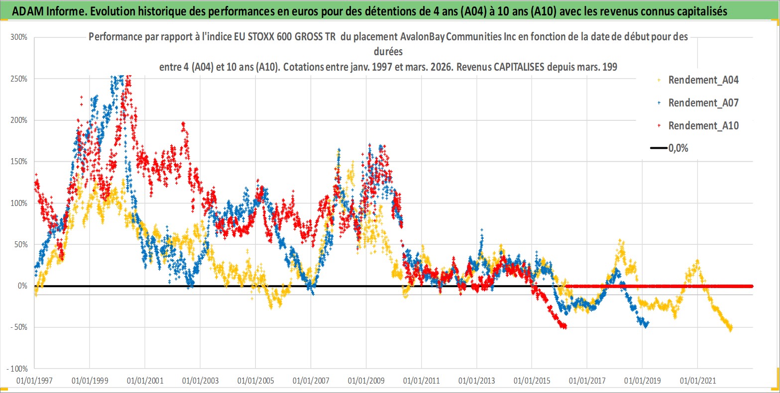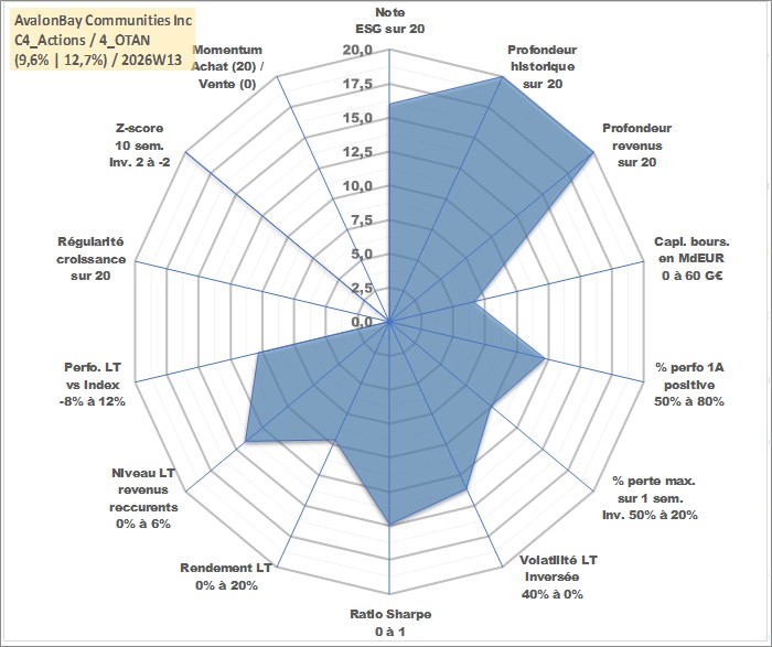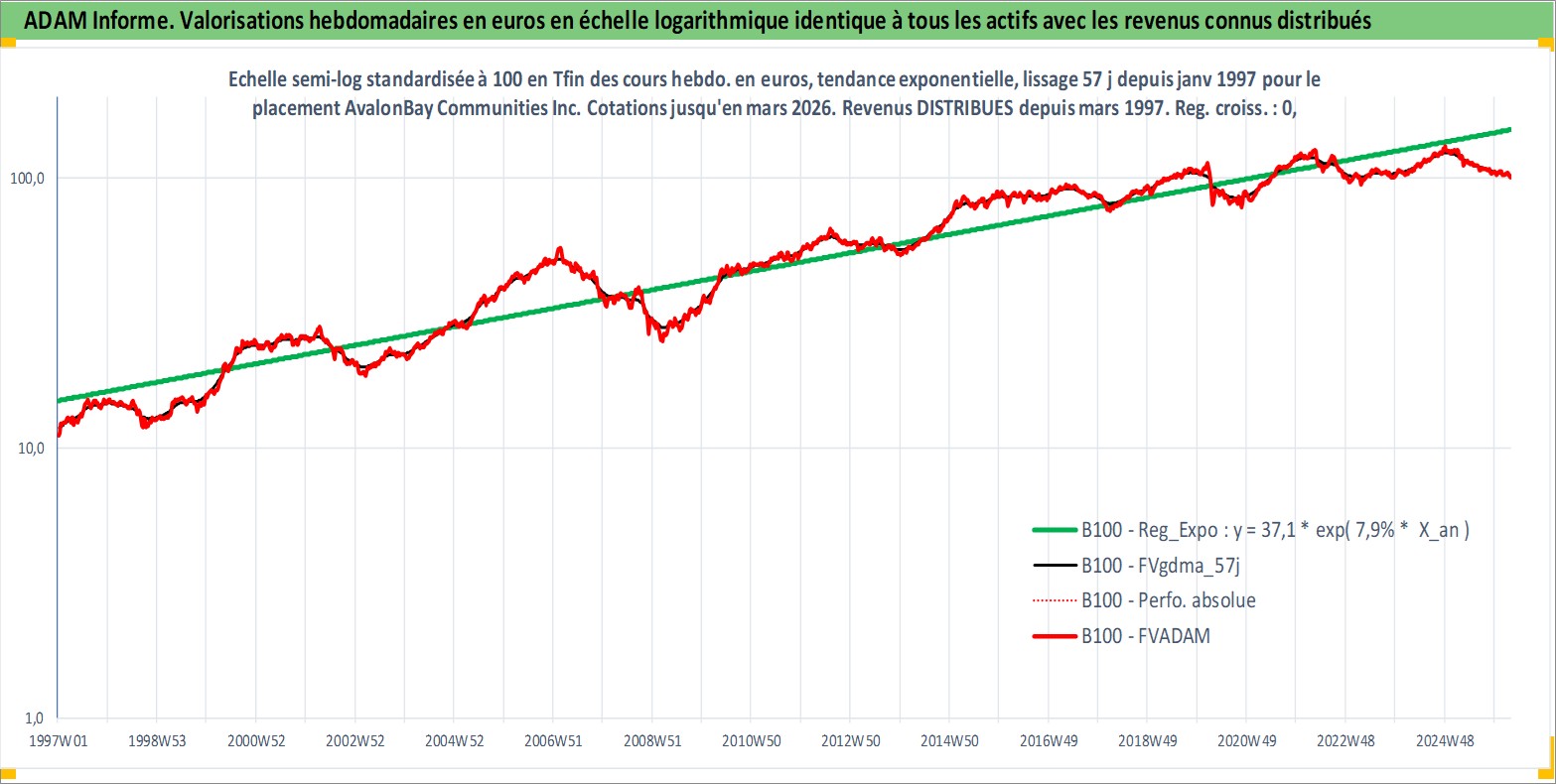 Site dédié aux investisseursPage dédiée sur site financeAnalyse des valorisations hebdomadaires de l'action AvalonBay Communities Inc. Cet actif est cote en USD. Les valorisations sont en contrevaleur EURO et couvrent les semaines 1997W01 a 2026W13. Les revenus de cet actif financier sont pris en compte depuis la semaine 1997W13. La note globale ESG de cet actif est estimee a 16.0 (apres rebasage entre 0 et 20).