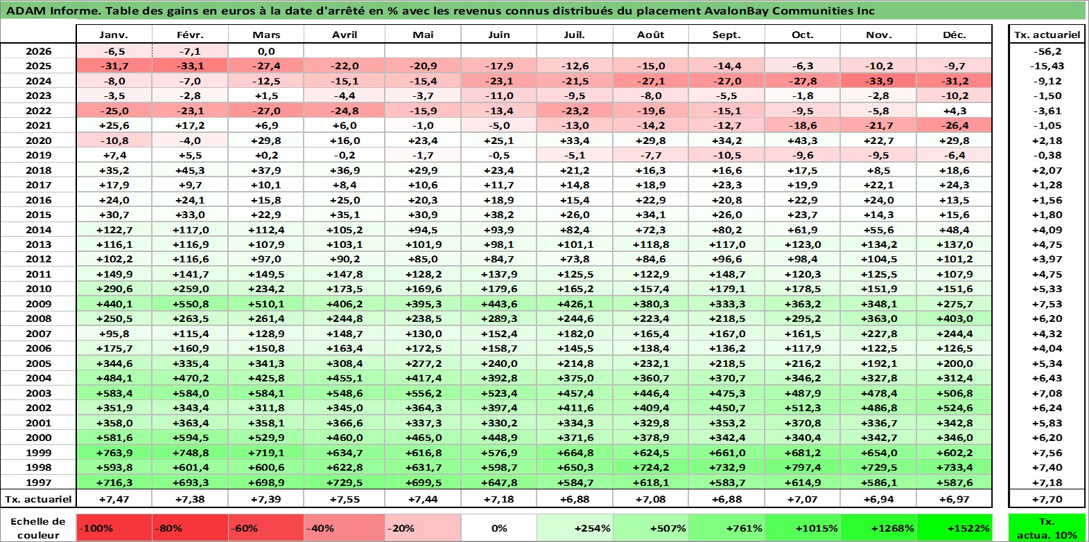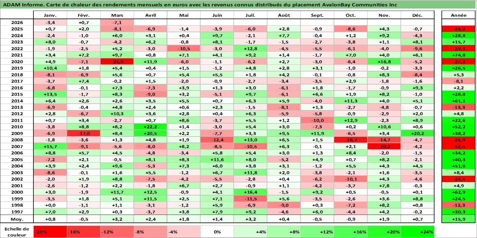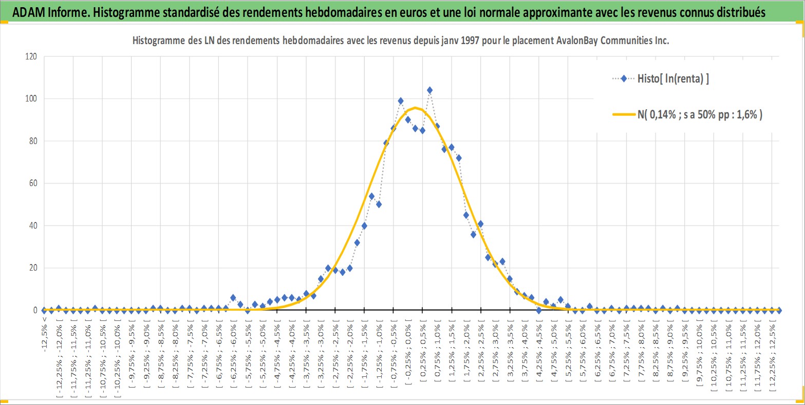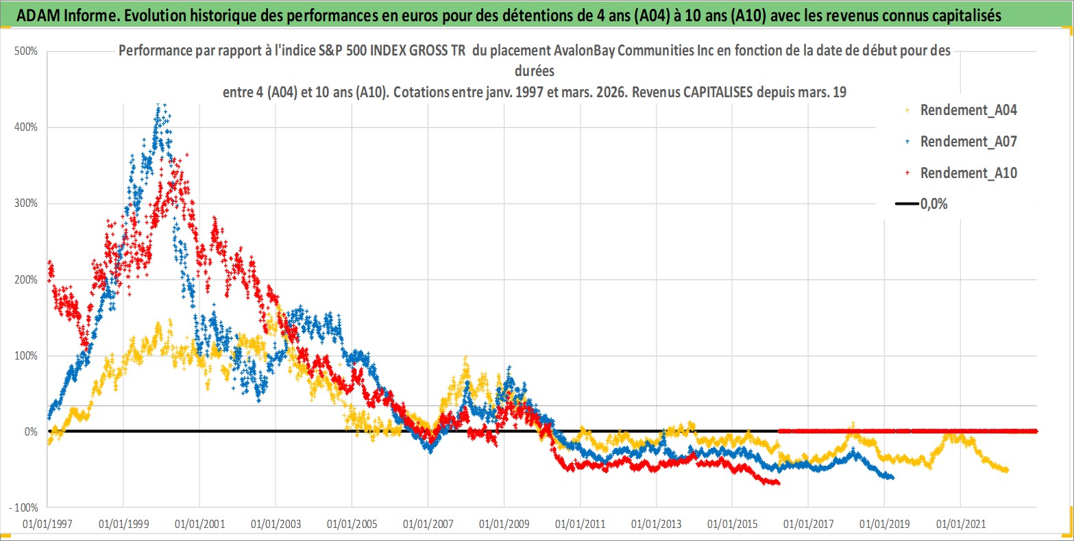 Site dédié aux investisseursPage dédiée sur site financeAnalyse des valorisations hebdomadaires de l'action AvalonBay Communities Inc. Cet actif est cote en USD. Les valorisations sont en contrevaleur EURO et couvrent les semaines 1997W01 a 2026W13. Les revenus de cet actif financier sont pris en compte depuis la semaine 1997W13. La note globale ESG de cet actif est estimee a 16.0 (apres rebasage entre 0 et 20).