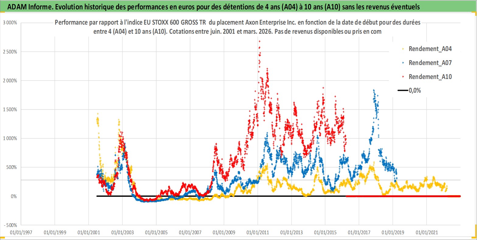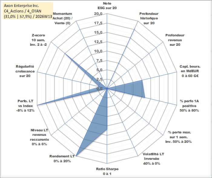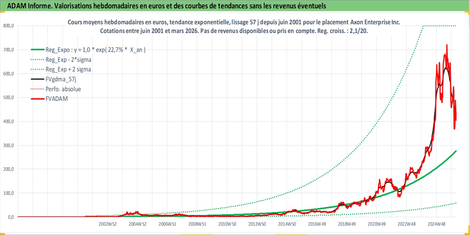 Site dédié aux investisseursPage dédiée sur site financeAnalyse des valorisations hebdomadaires de l'action Axon Enterprise Inc.. Cet actif est cote en USD. Les valorisations sont en contrevaleur EURO et couvrent les semaines 2001W25 a 2026W13. Les revenus de cet actif financier ne sont pas connus car non existants ou non disponibles sur le site Yahoo Finance. La note ESG de cet actif n'est pas connue.