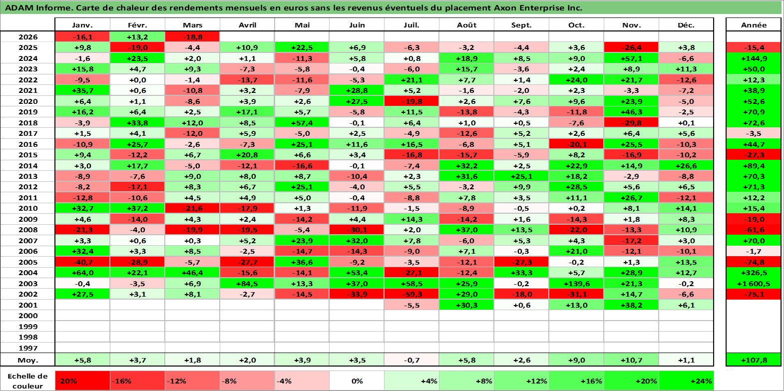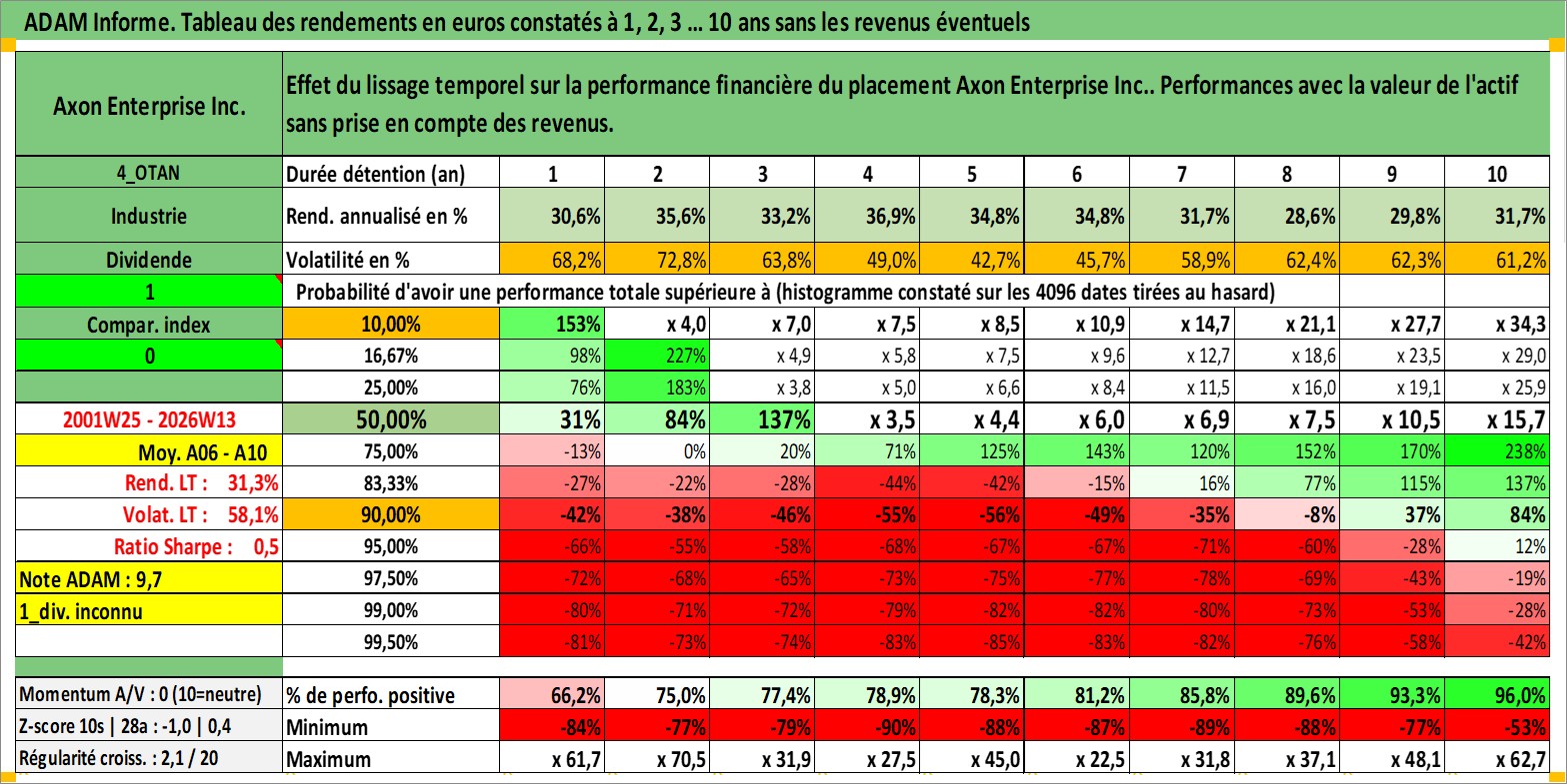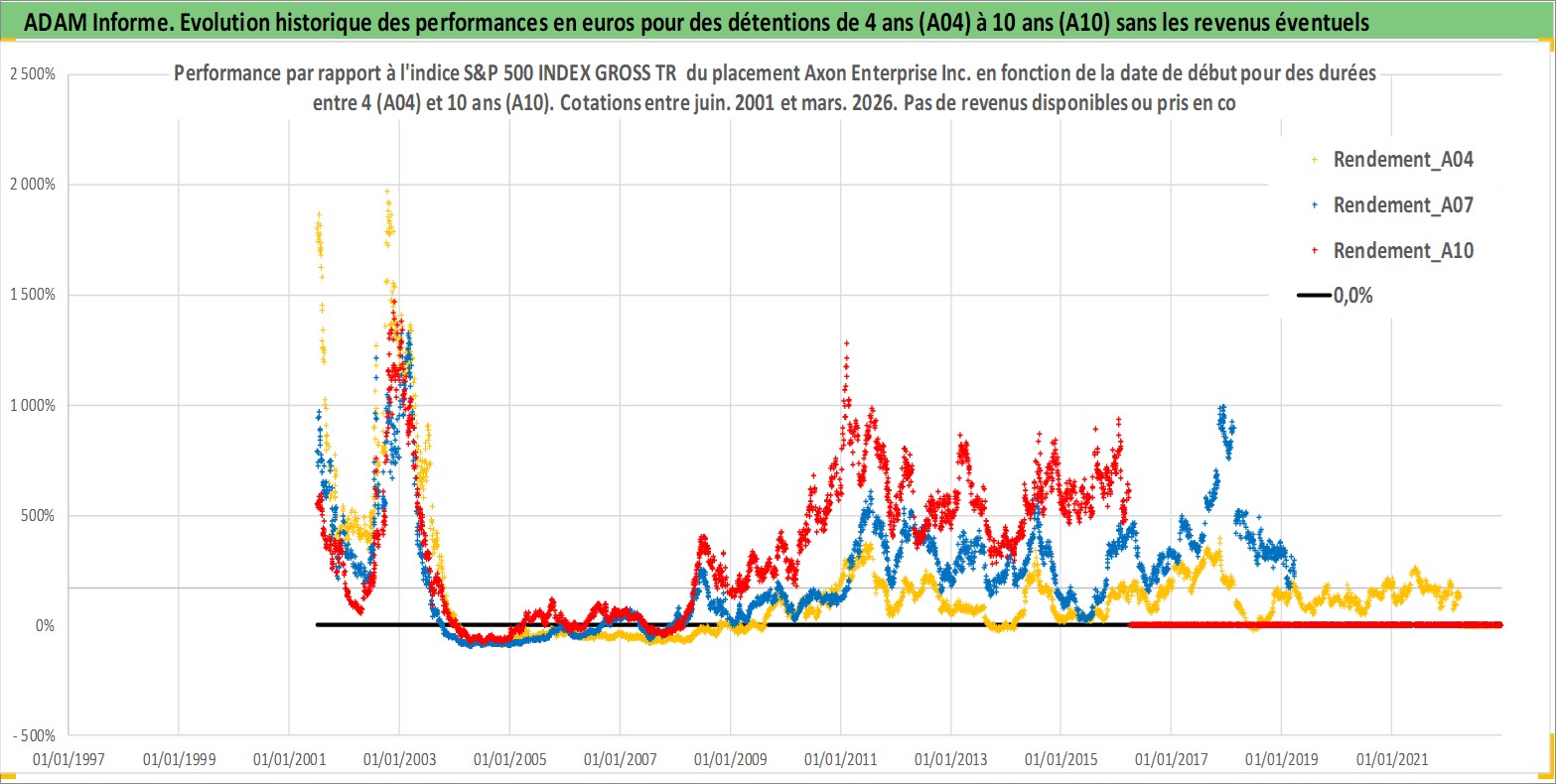 Site dédié aux investisseursPage dédiée sur site financeAnalyse des valorisations hebdomadaires de l'action Axon Enterprise Inc.. Cet actif est cote en USD. Les valorisations sont en contrevaleur EURO et couvrent les semaines 2001W25 a 2026W13. Les revenus de cet actif financier ne sont pas connus car non existants ou non disponibles sur le site Yahoo Finance. La note ESG de cet actif n'est pas connue.