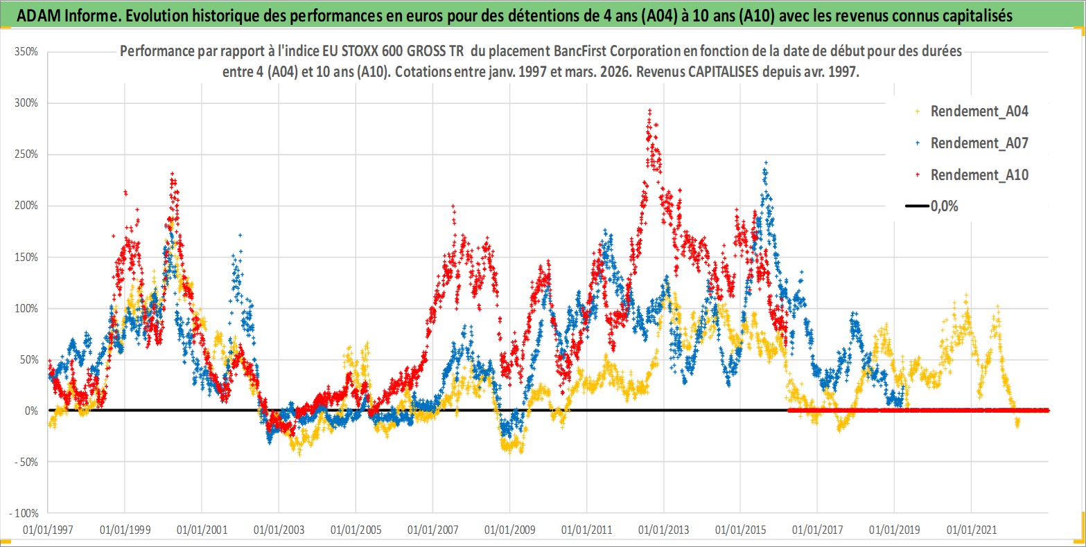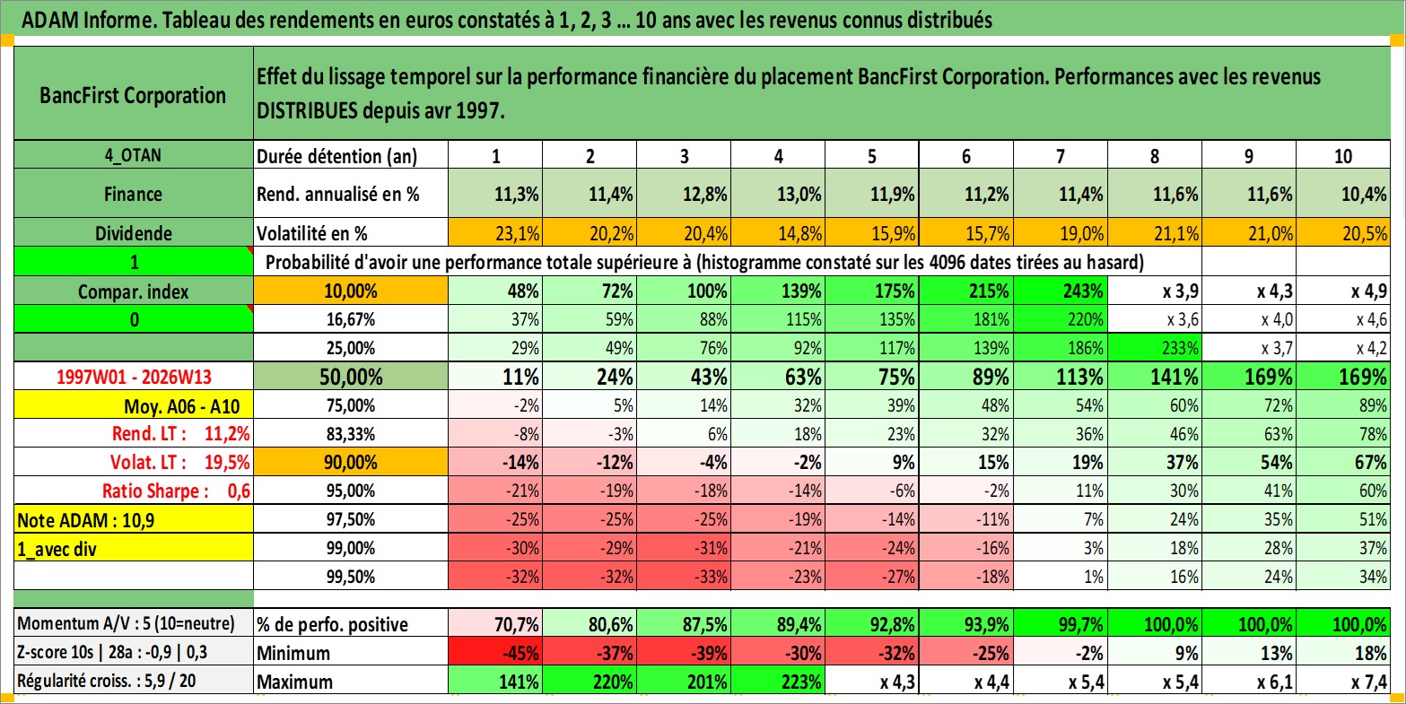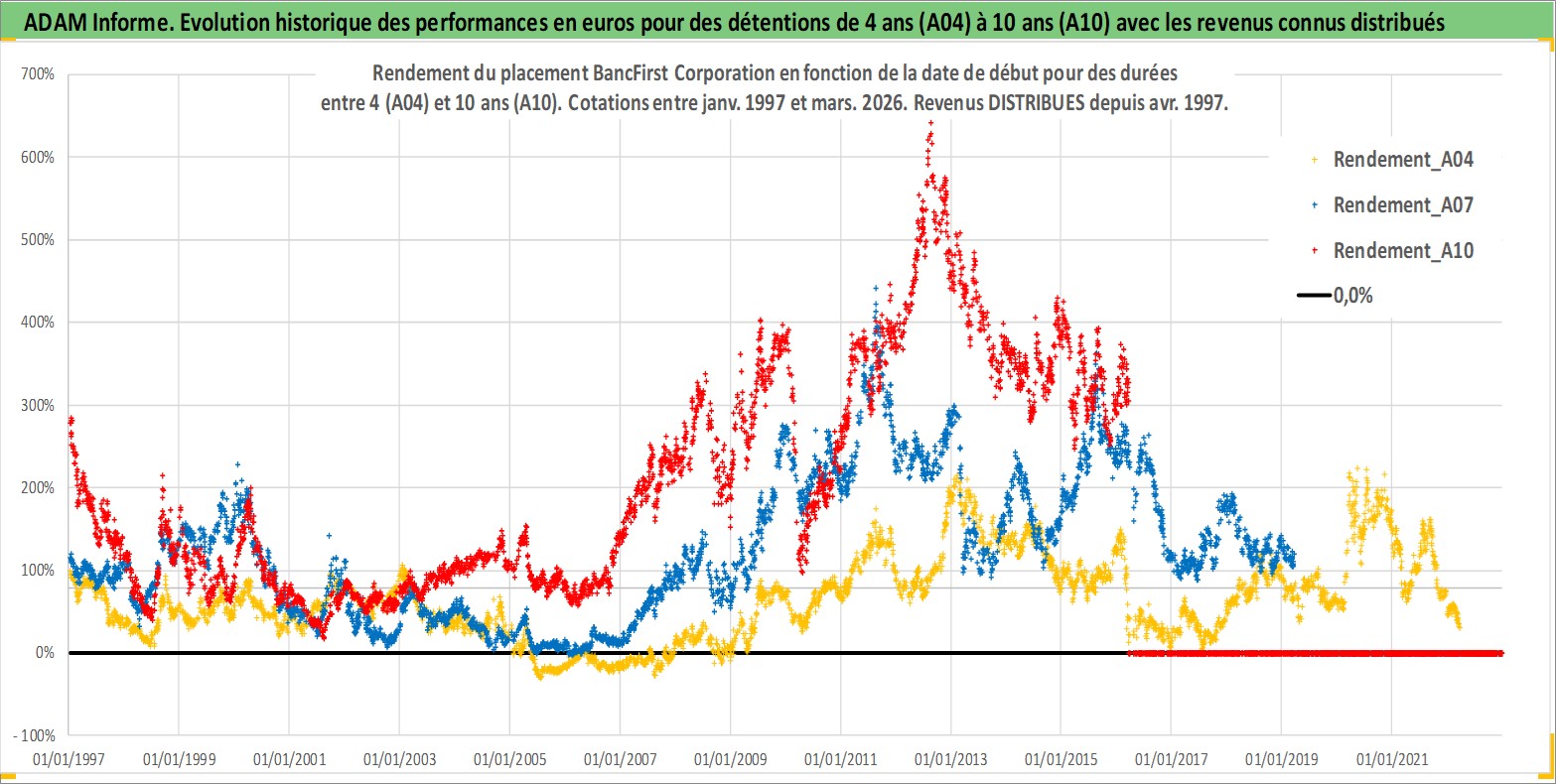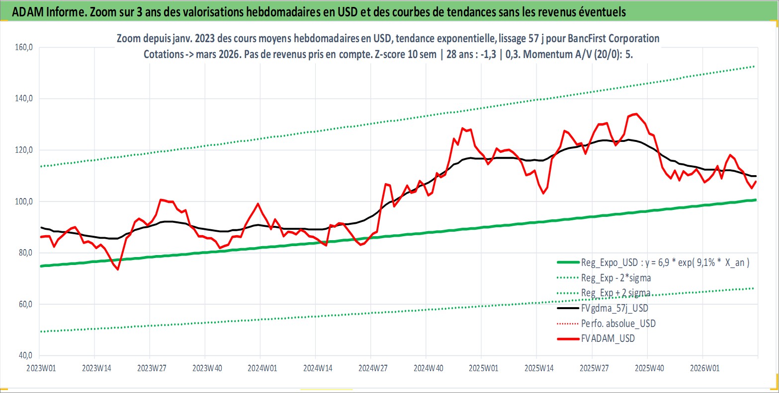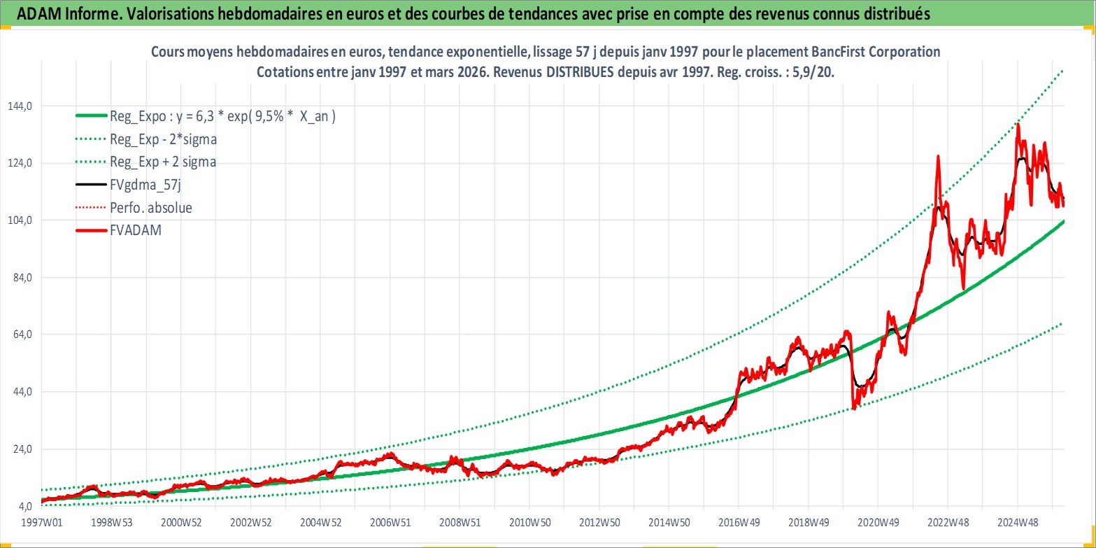 Site dédié aux investisseursPage dédiée sur site financeAnalyse des valorisations hebdomadaires de l'action BancFirst Corporation. Cet actif est cote en USD. Les valorisations sont en contrevaleur EURO et couvrent les semaines 1997W01 a 2026W13. Les revenus de cet actif financier sont pris en compte depuis la semaine 1997W16. La note ESG de cet actif n'est pas connue.
