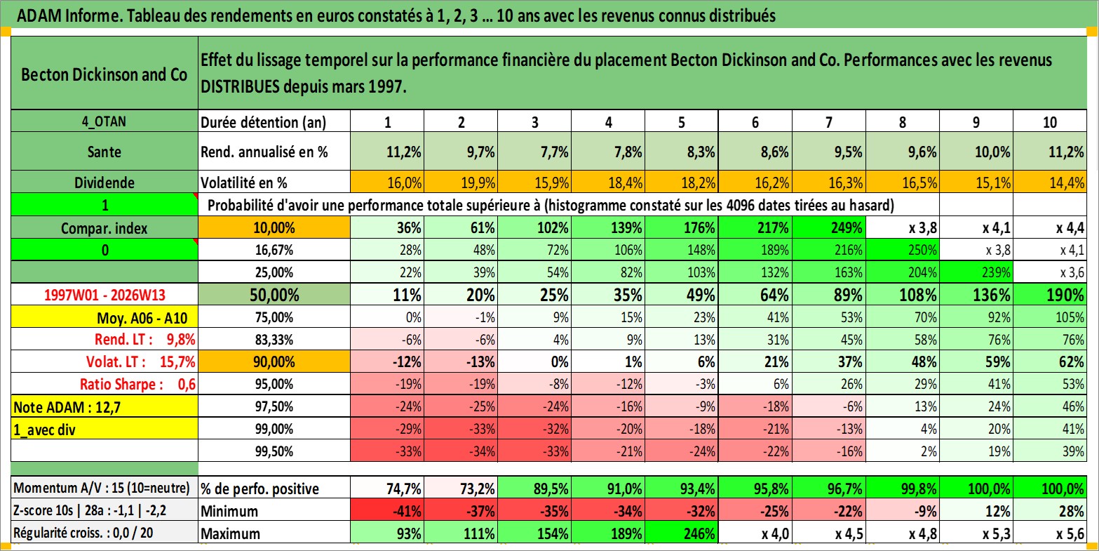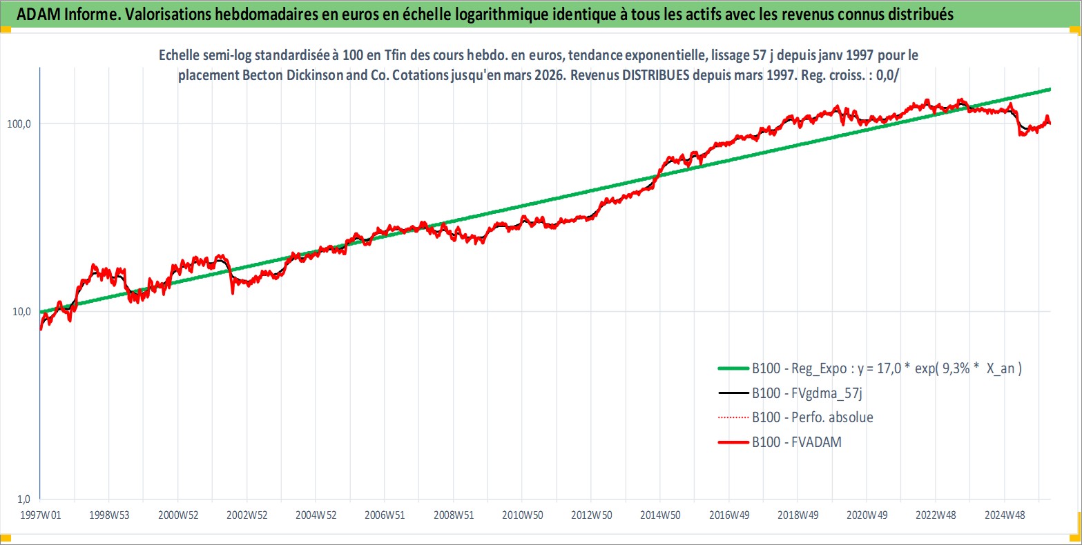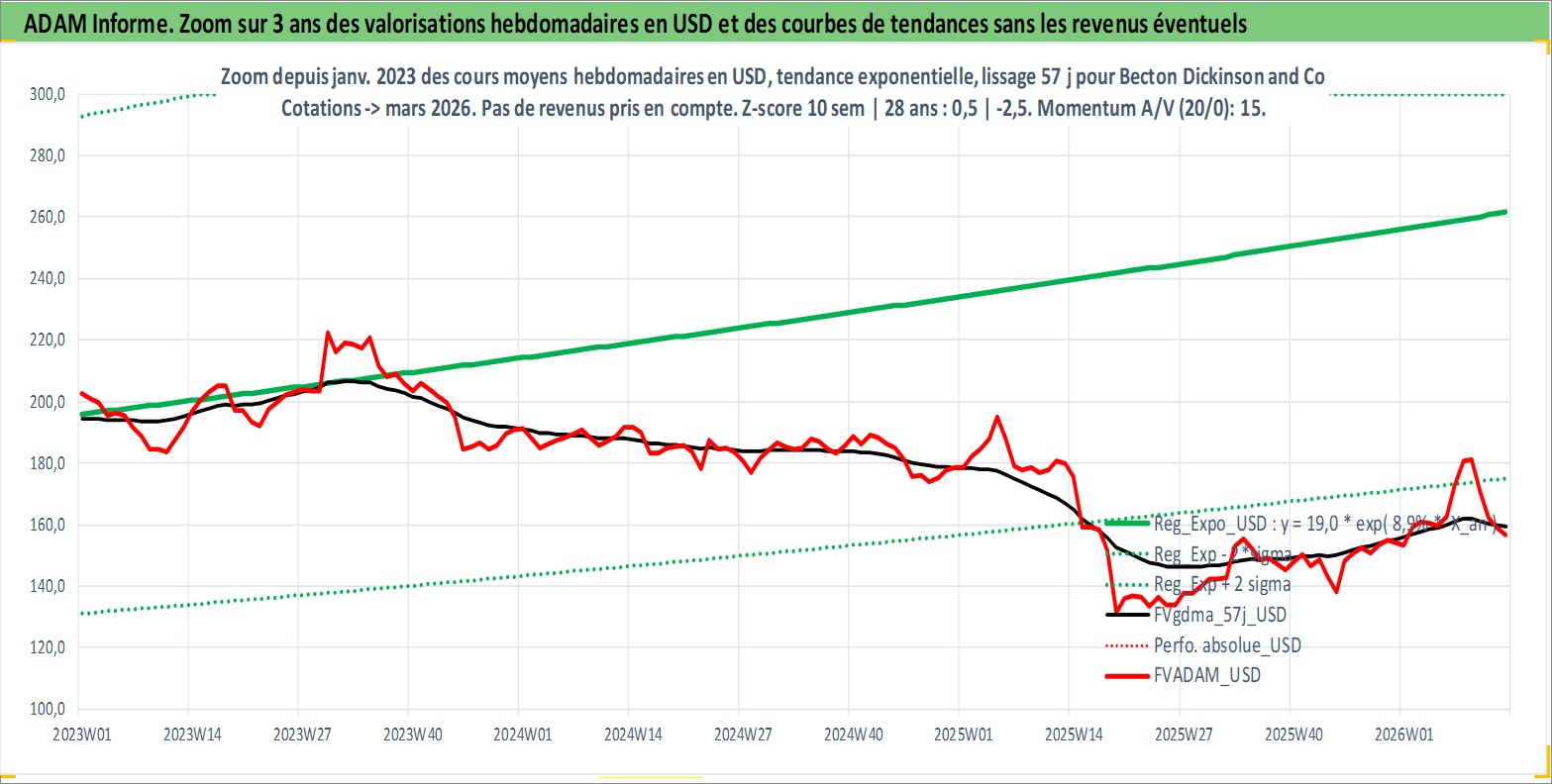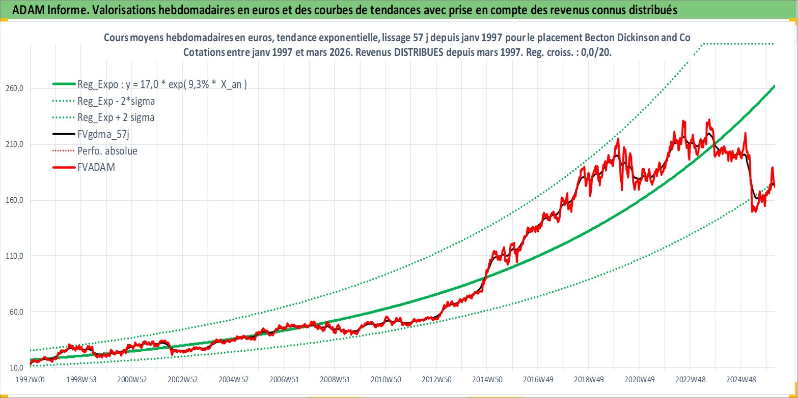 Site dédié aux investisseursPage dédiée sur site financeAnalyse des valorisations hebdomadaires de l'action Becton Dickinson and Co. Cet actif est cote en USD. Les valorisations sont en contrevaleur EURO et couvrent les semaines 1997W01 a 2026W13. Les revenus de cet actif financier sont pris en compte depuis la semaine 1997W10. La note globale ESG de cet actif est estimee a 7.0 (apres rebasage entre 0 et 20).
