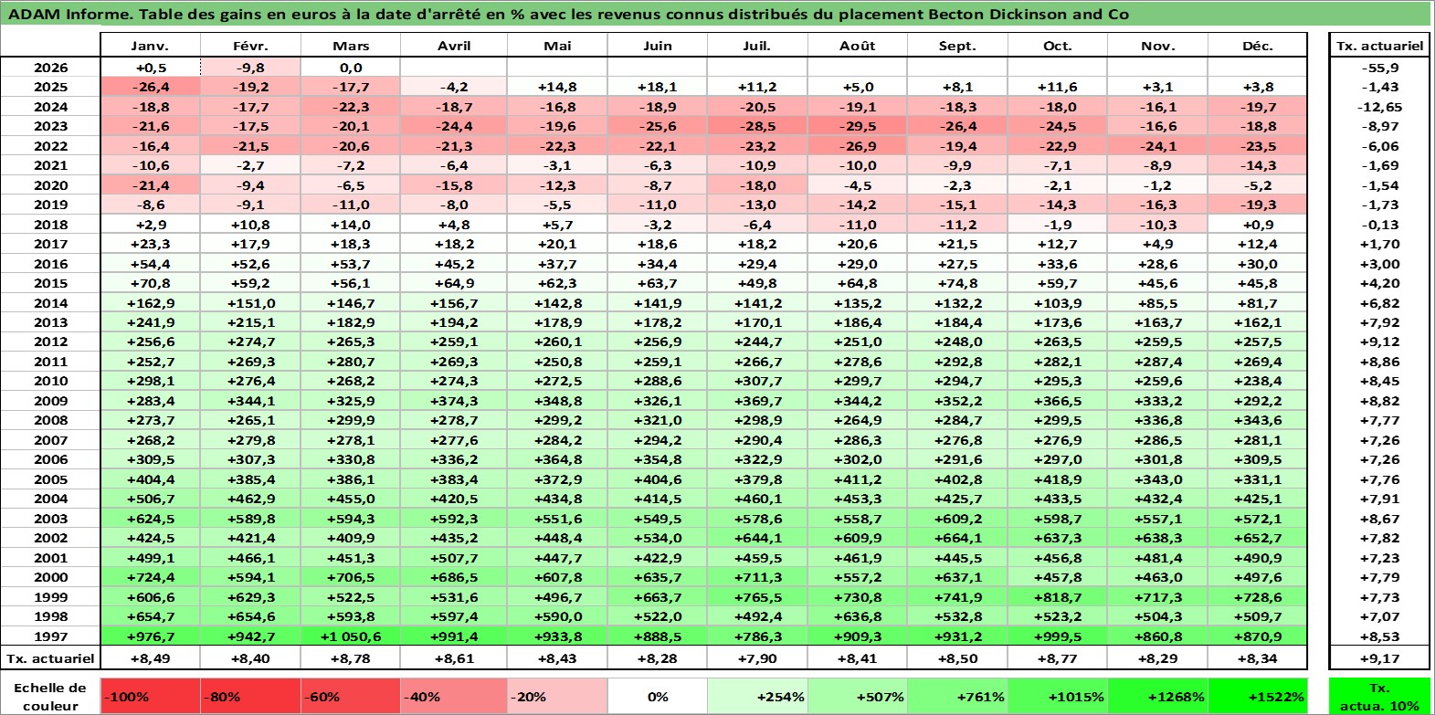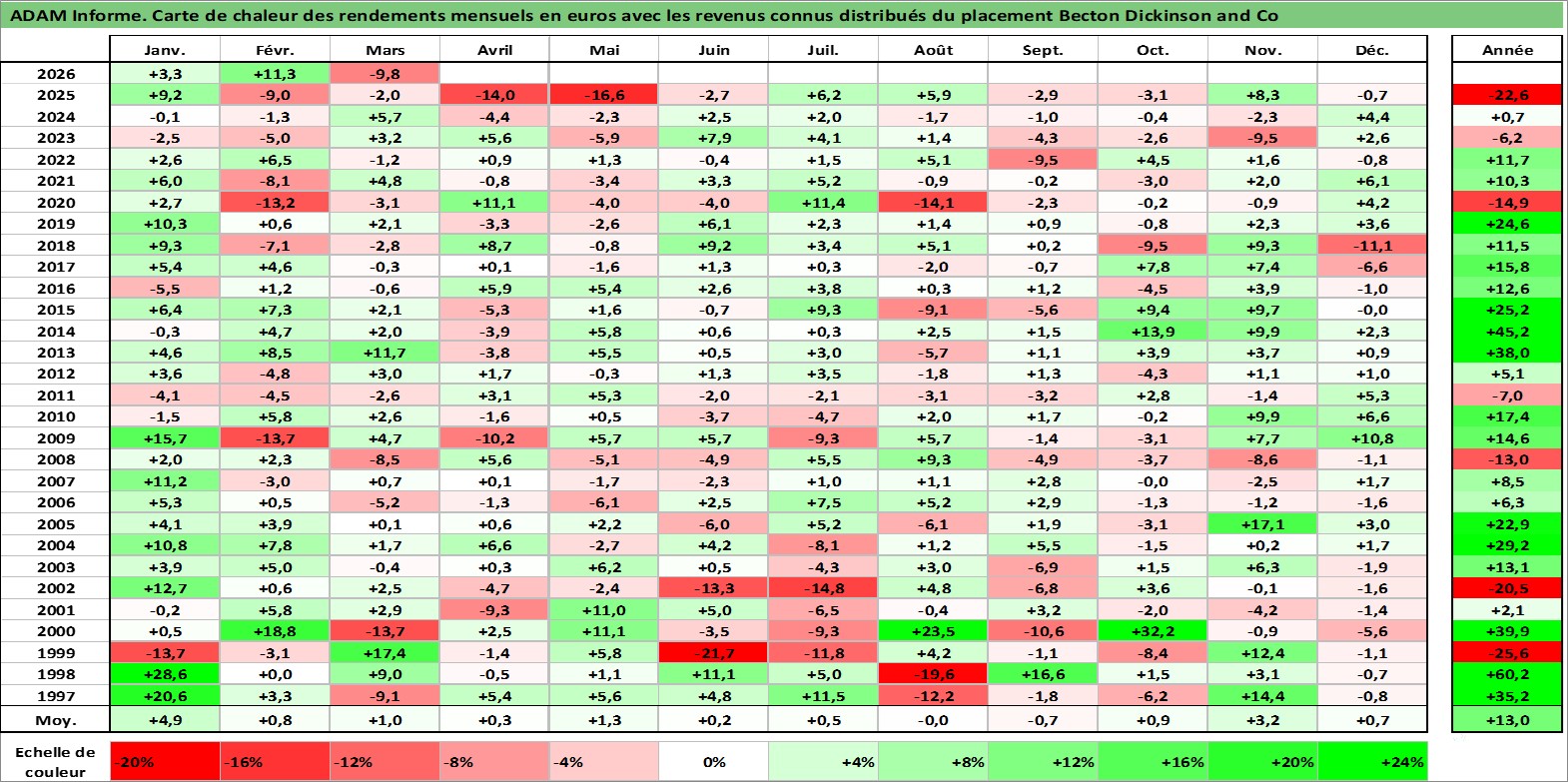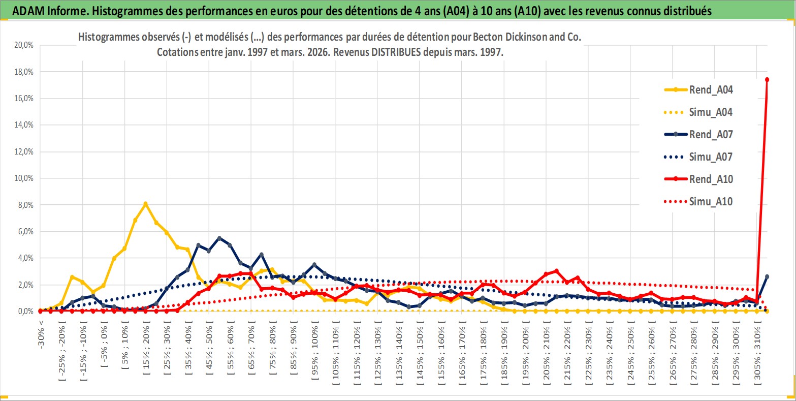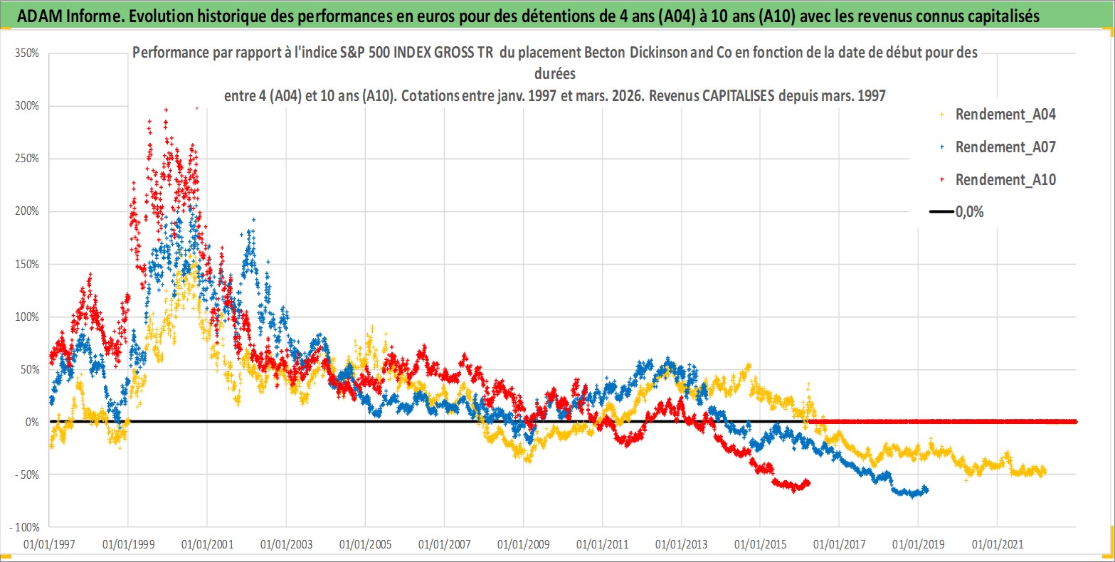 Site dédié aux investisseursPage dédiée sur site financeAnalyse des valorisations hebdomadaires de l'action Becton Dickinson and Co. Cet actif est cote en USD. Les valorisations sont en contrevaleur EURO et couvrent les semaines 1997W01 a 2026W13. Les revenus de cet actif financier sont pris en compte depuis la semaine 1997W10. La note globale ESG de cet actif est estimee a 7.0 (apres rebasage entre 0 et 20).