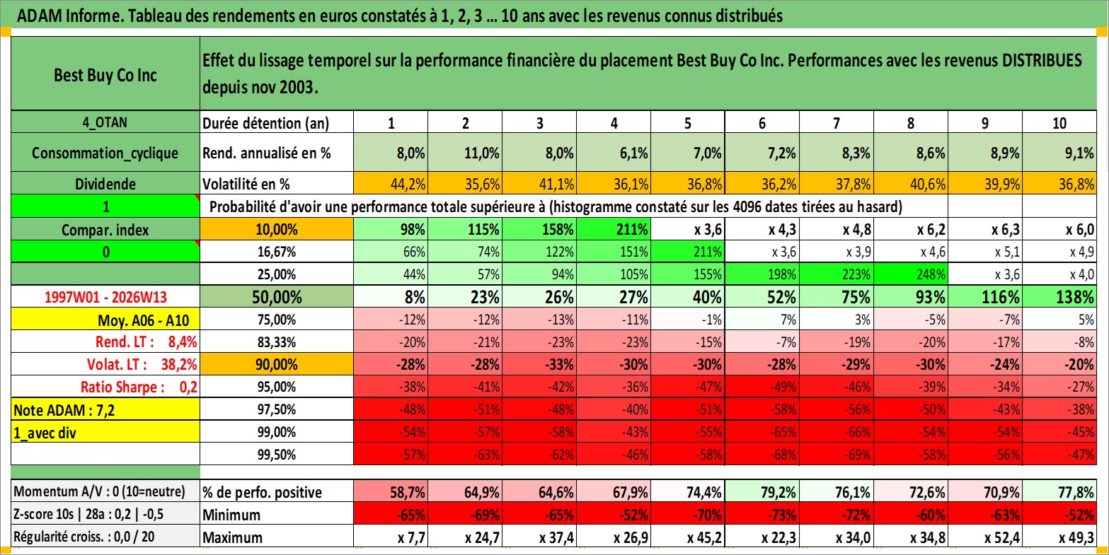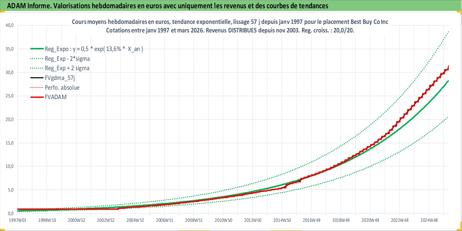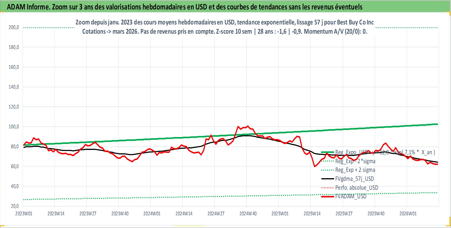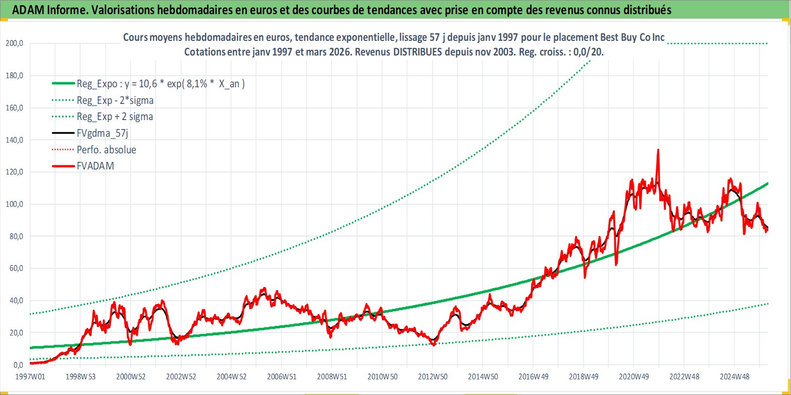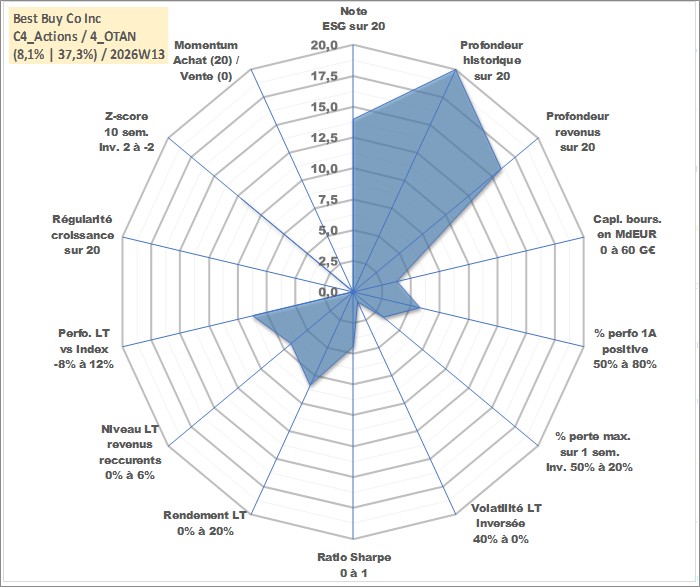 Site dédié aux investisseursPage dédiée sur site financeAnalyse des valorisations hebdomadaires de l'action Best Buy Co Inc. Cet actif est cote en USD. Les valorisations sont en contrevaleur EURO et couvrent les semaines 1997W01 a 2026W13. Les revenus de cet actif financier sont pris en compte depuis la semaine 2003W46. La note globale ESG de cet actif est estimee a 14.0 (apres rebasage entre 0 et 20).