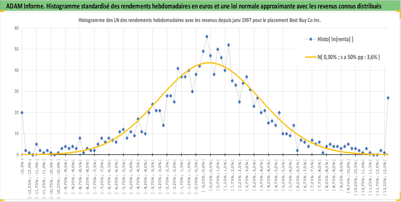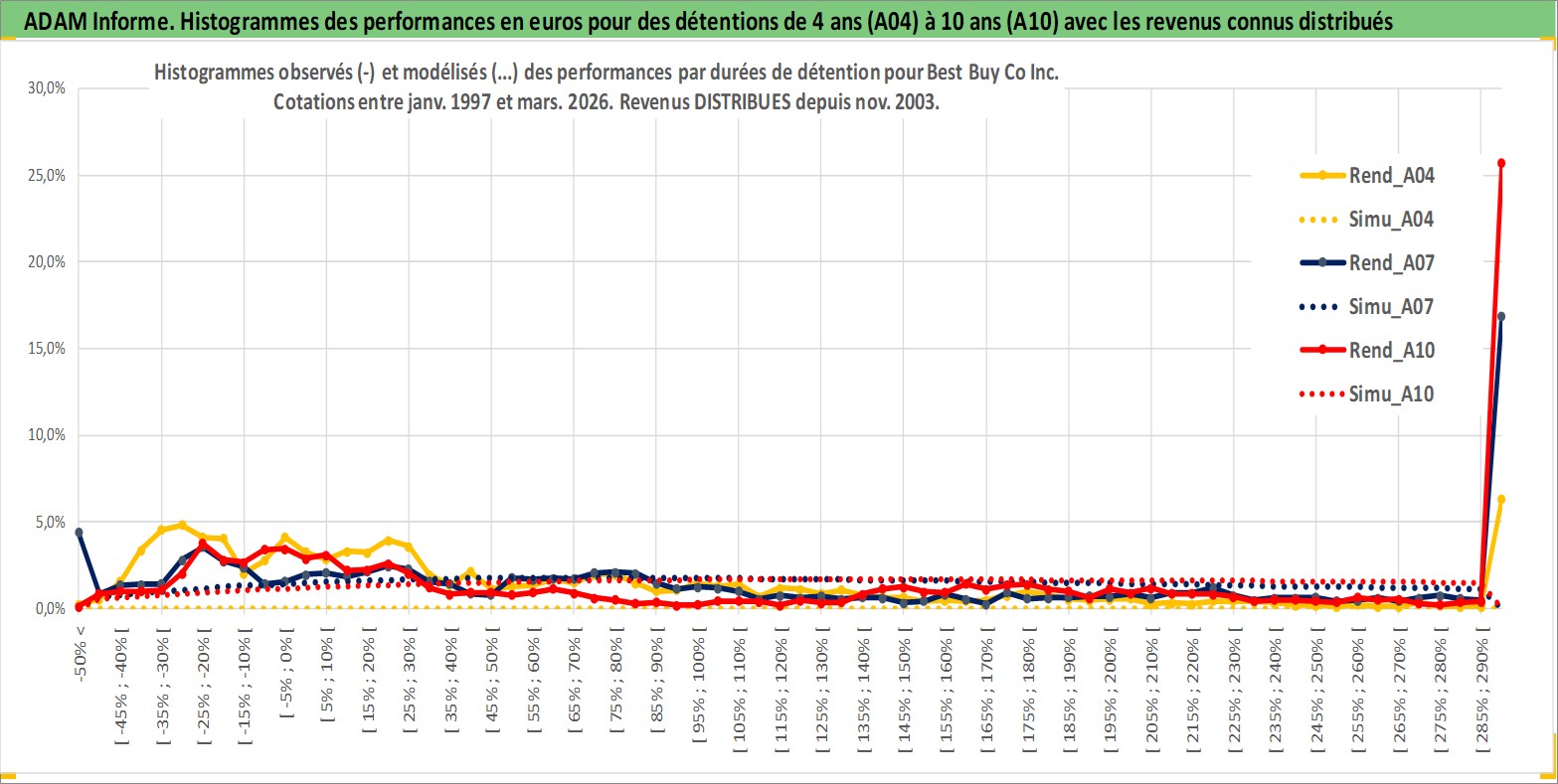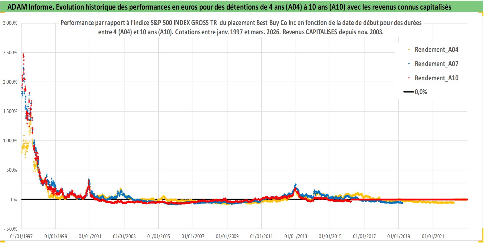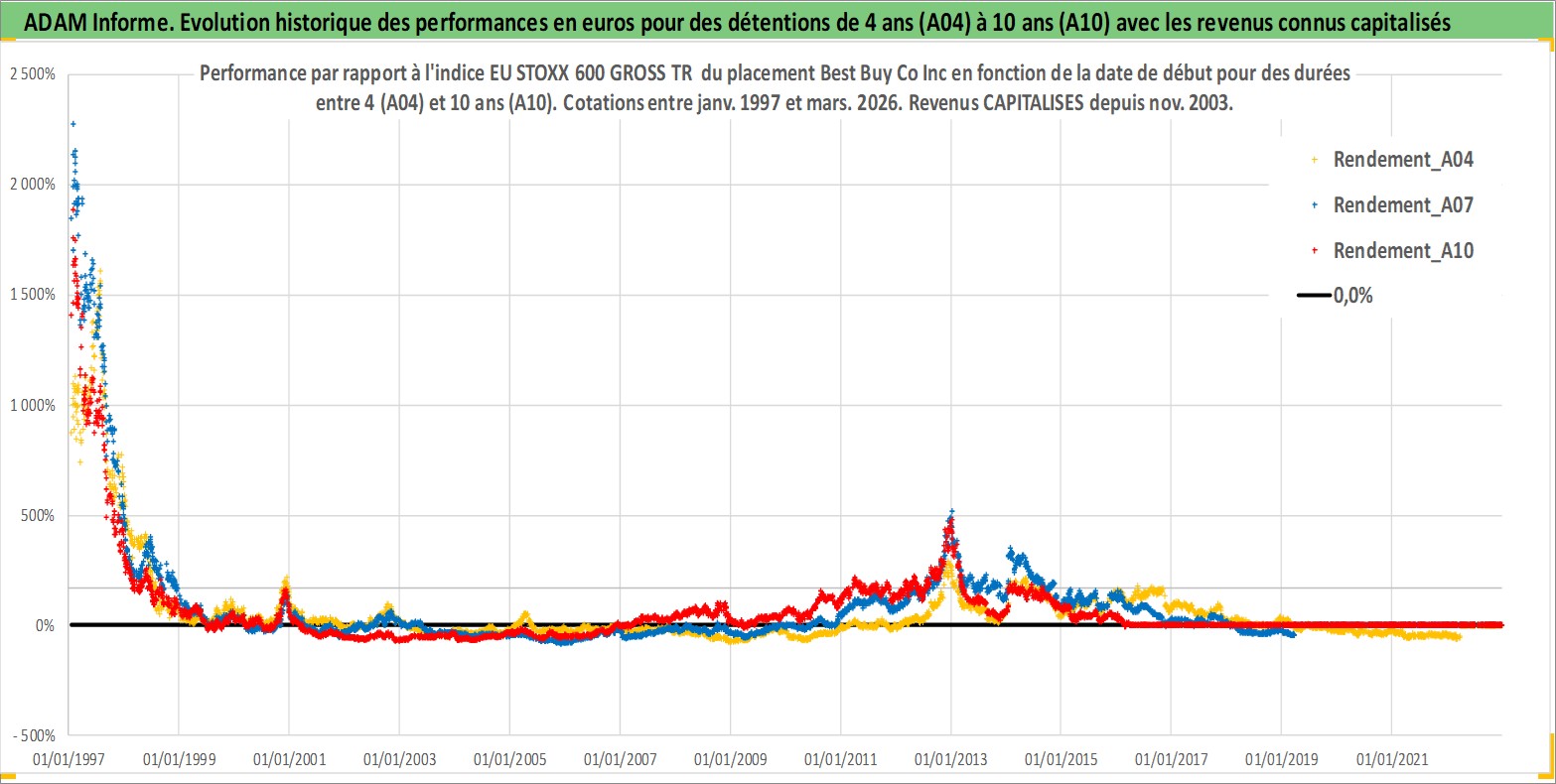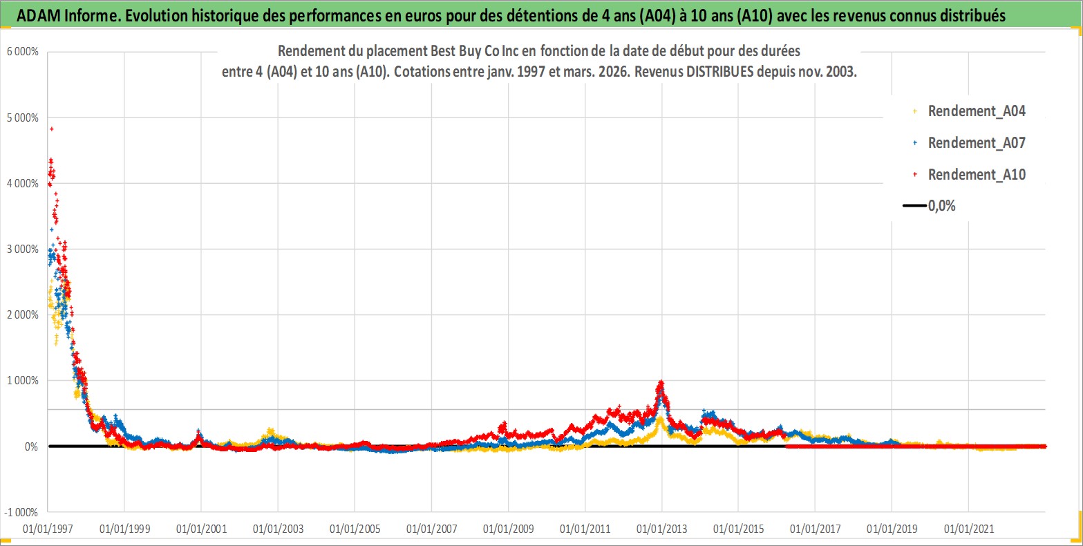 Site dédié aux investisseursPage dédiée sur site financeAnalyse des valorisations hebdomadaires de l'action Best Buy Co Inc. Cet actif est cote en USD. Les valorisations sont en contrevaleur EURO et couvrent les semaines 1997W01 a 2026W13. Les revenus de cet actif financier sont pris en compte depuis la semaine 2003W46. La note globale ESG de cet actif est estimee a 14.0 (apres rebasage entre 0 et 20).