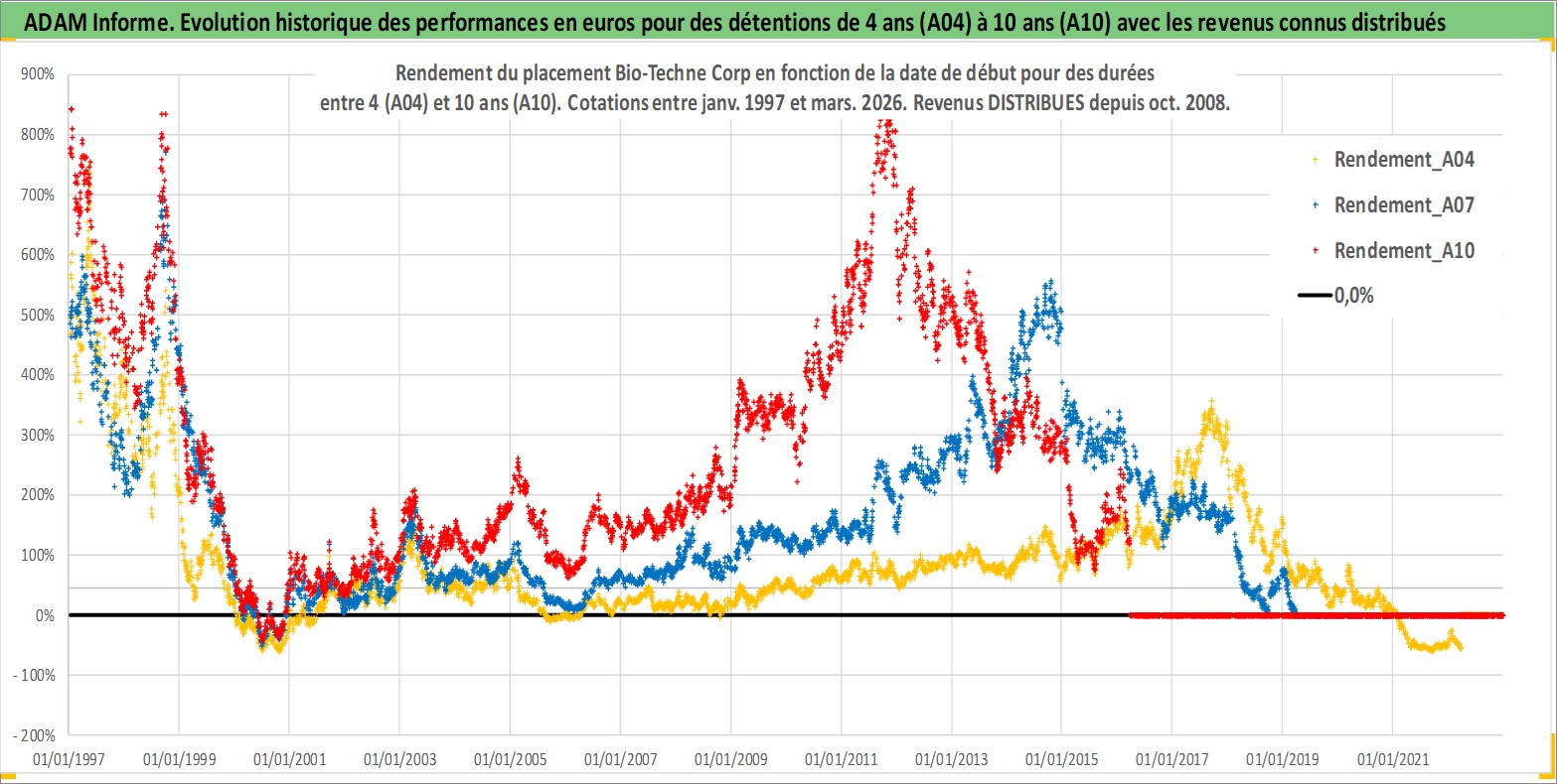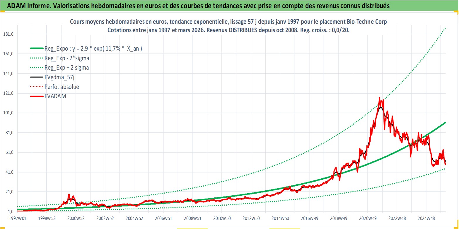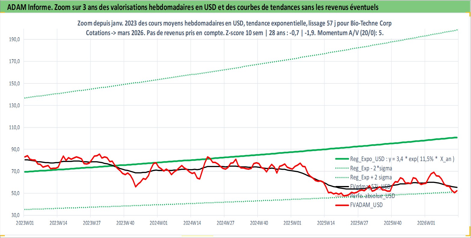 Site dédié aux investisseursPage dédiée sur site financeAnalyse des valorisations hebdomadaires de l'action Bio-Techne Corp. Cet actif est cote en USD. Les valorisations sont en contrevaleur EURO et couvrent les semaines 1997W01 a 2026W13. Les revenus de cet actif financier sont pris en compte depuis la semaine 2008W44. La note ESG de cet actif n'est pas connue.