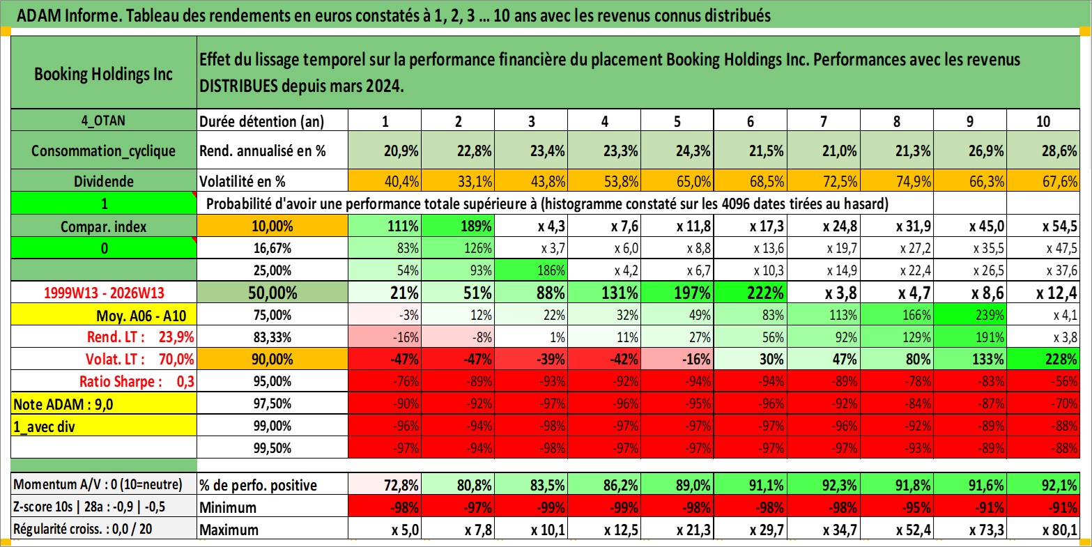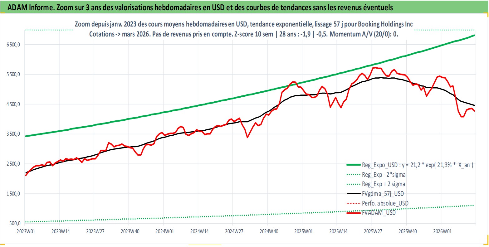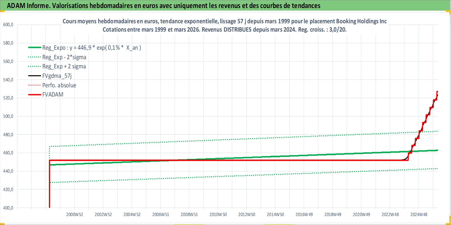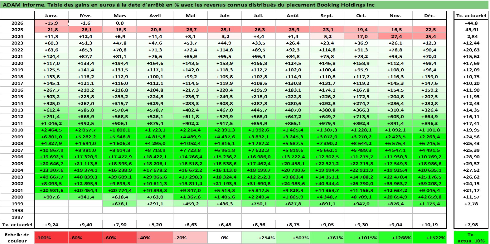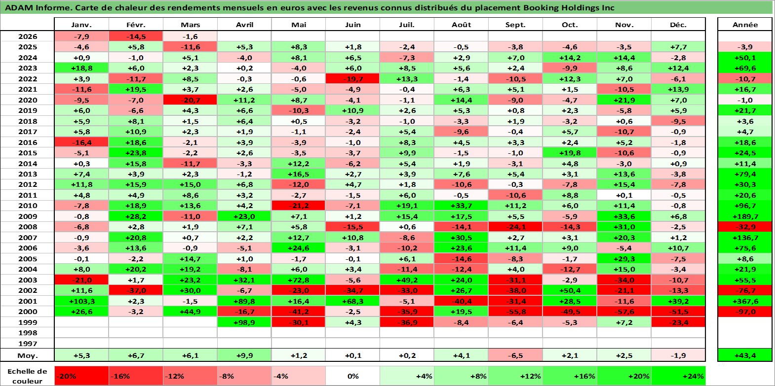 Site dédié aux investisseursPage dédiée sur site financeAnalyse des valorisations hebdomadaires de l'action Booking Holdings Inc. Cet actif est cote en USD. Les valorisations sont en contrevaleur EURO et couvrent les semaines 1999W13 a 2026W13. Les revenus de cet actif financier sont pris en compte depuis la semaine 2024W10. La note globale ESG de cet actif est estimee a 9.0 (apres rebasage entre 0 et 20).