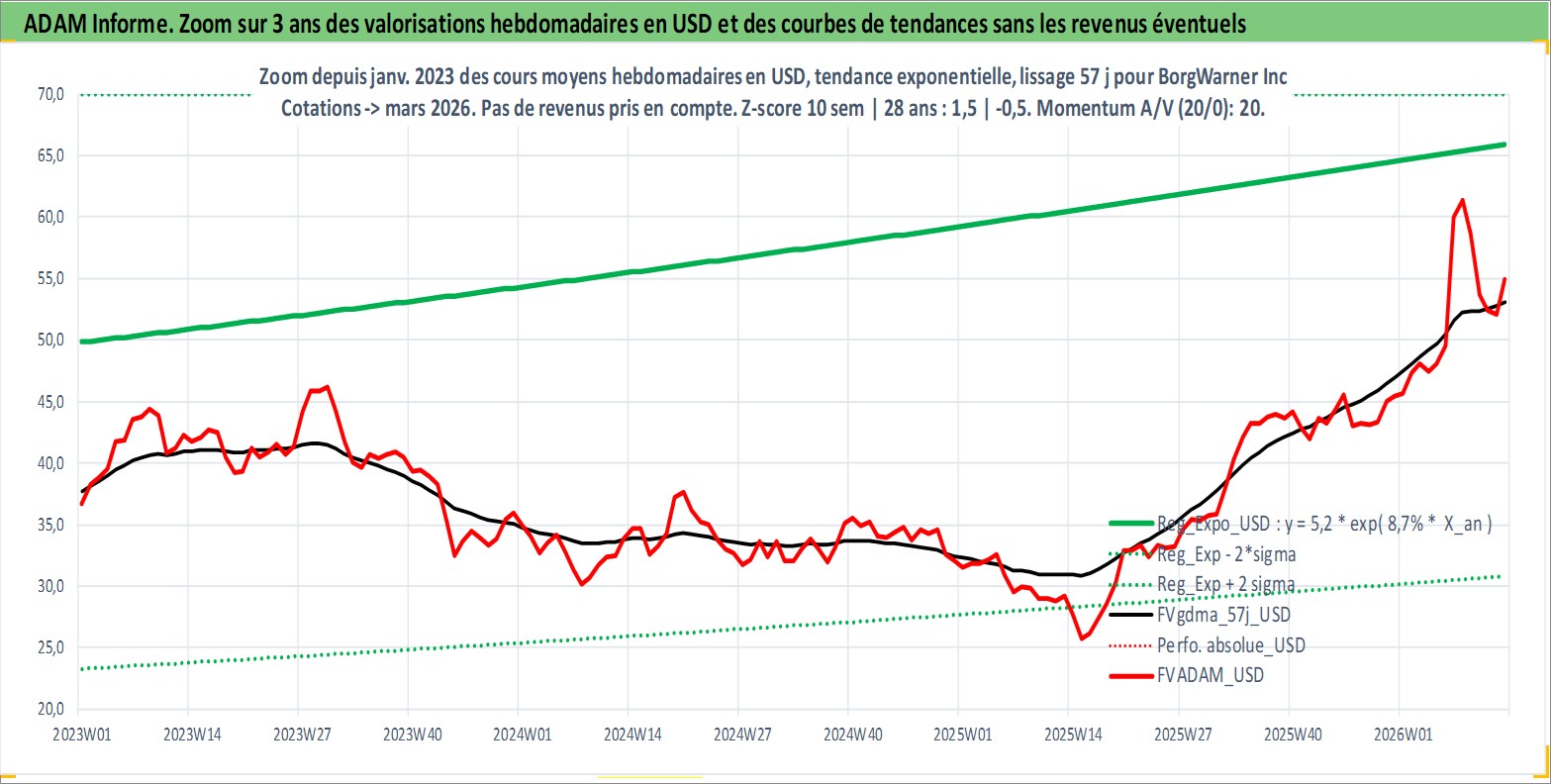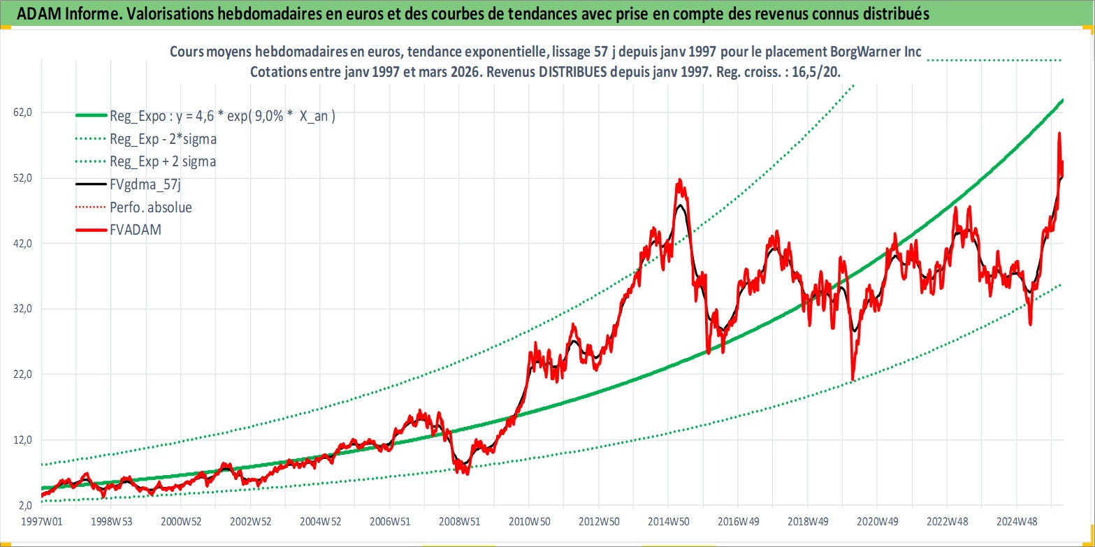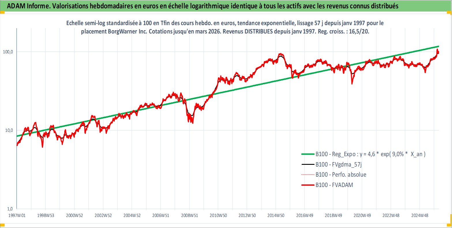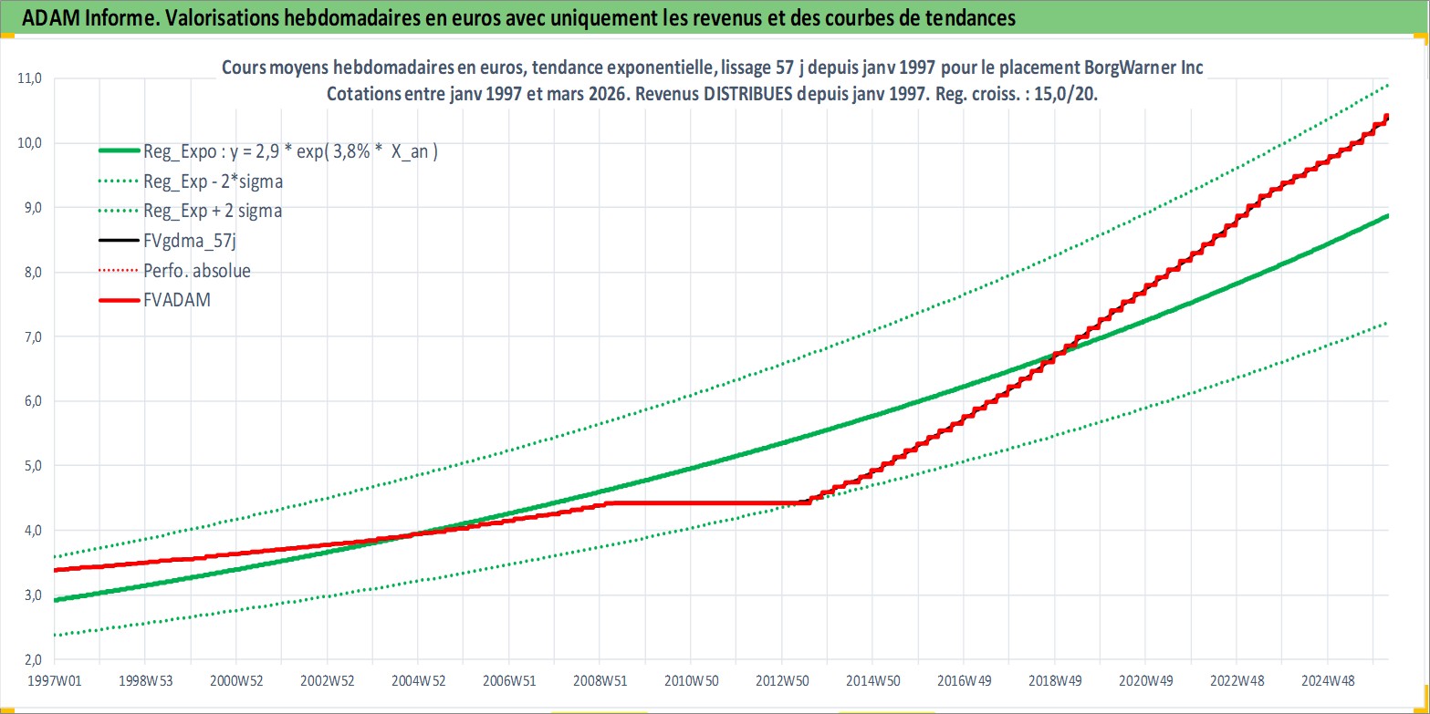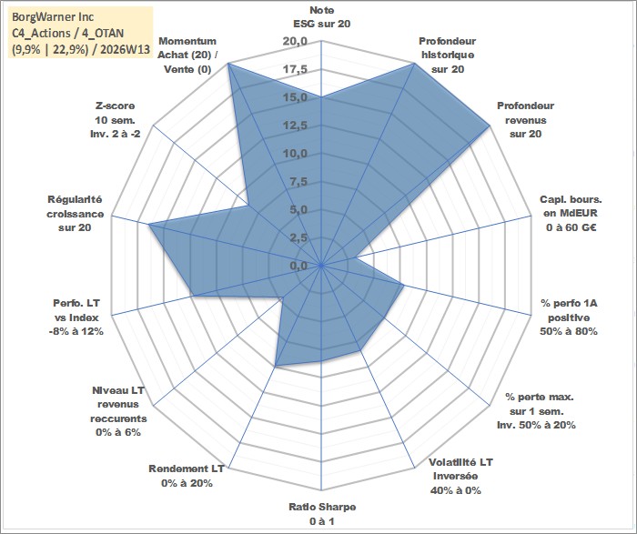 Site dédié aux investisseursPage dédiée sur site financeAnalyse des valorisations hebdomadaires de l'action BorgWarner Inc. Cet actif est cote en USD. Les valorisations sont en contrevaleur EURO et couvrent les semaines 1997W01 a 2026W13. Les revenus de cet actif financier sont pris en compte depuis la semaine 1997W05. La note globale ESG de cet actif est estimee a 15.0 (apres rebasage entre 0 et 20).