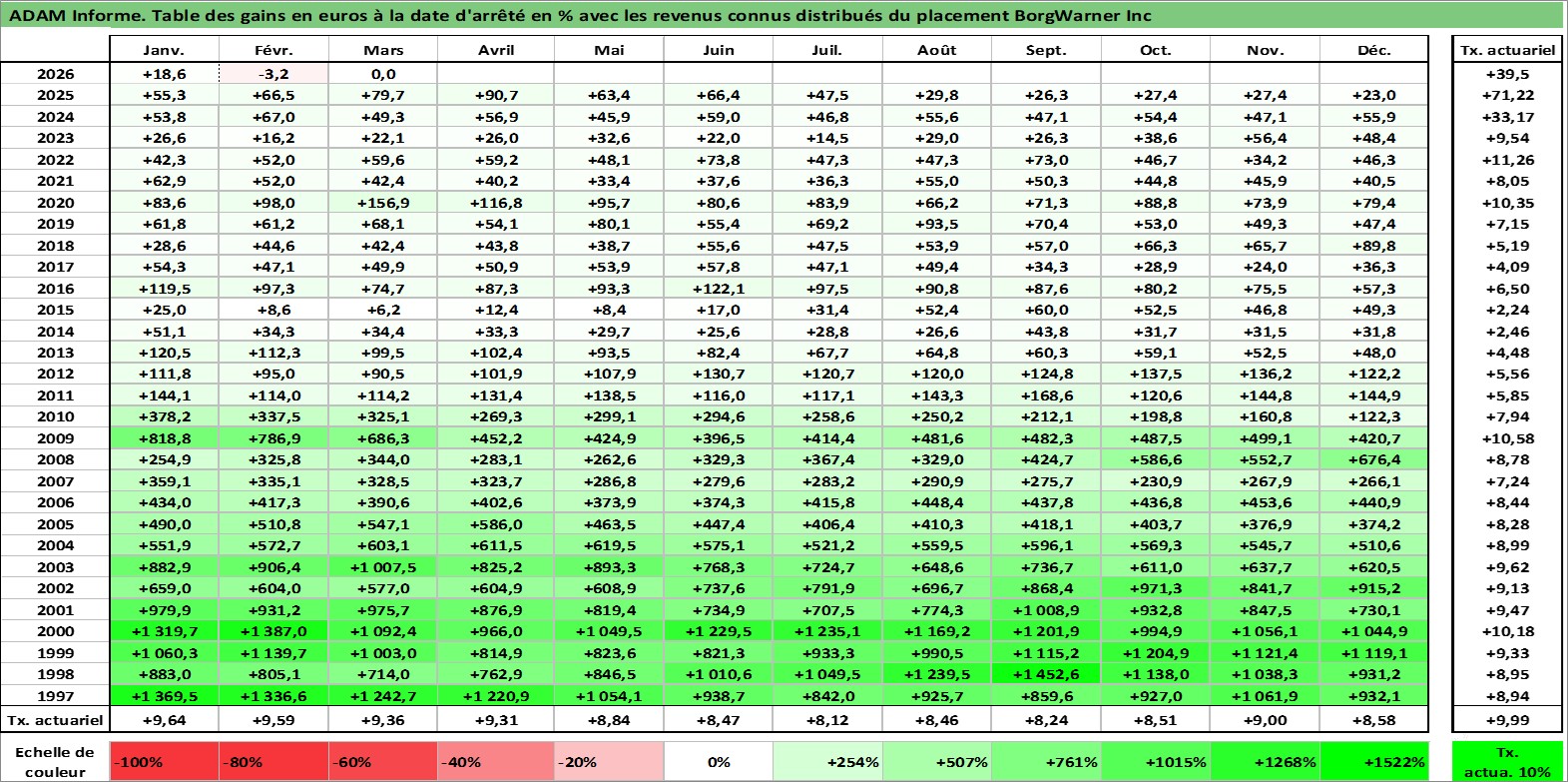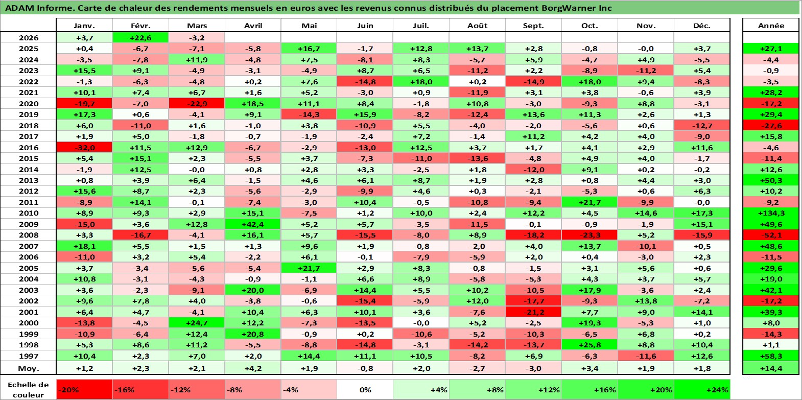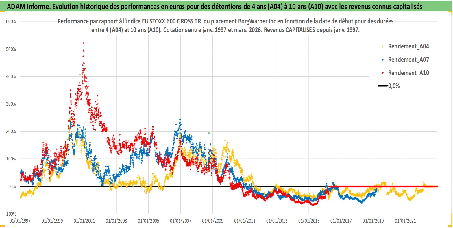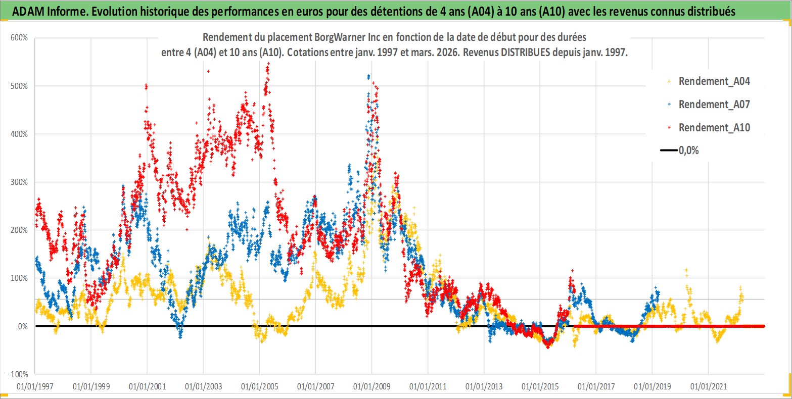 Site dédié aux investisseursPage dédiée sur site financeAnalyse des valorisations hebdomadaires de l'action BorgWarner Inc. Cet actif est cote en USD. Les valorisations sont en contrevaleur EURO et couvrent les semaines 1997W01 a 2026W13. Les revenus de cet actif financier sont pris en compte depuis la semaine 1997W05. La note globale ESG de cet actif est estimee a 15.0 (apres rebasage entre 0 et 20).