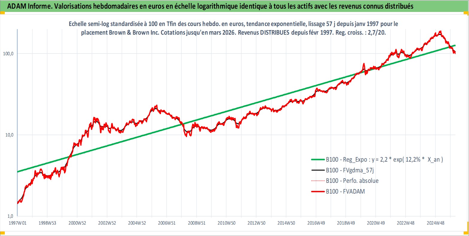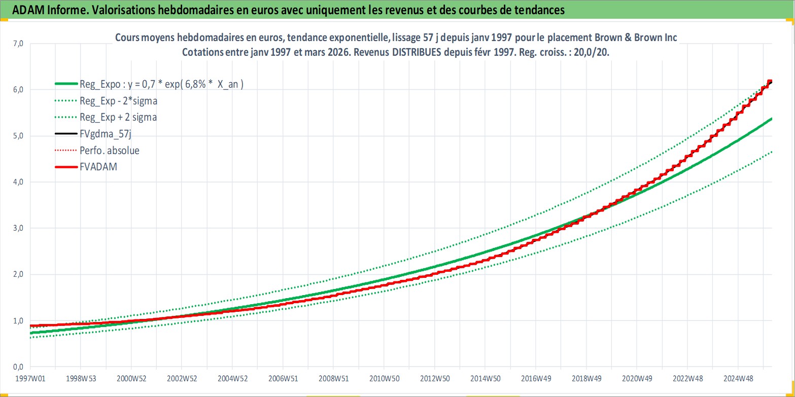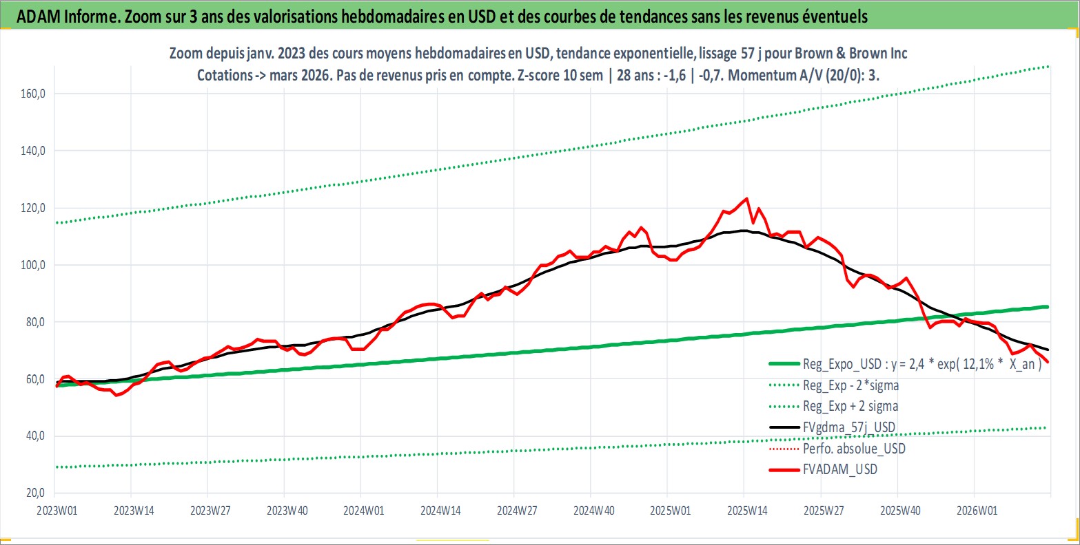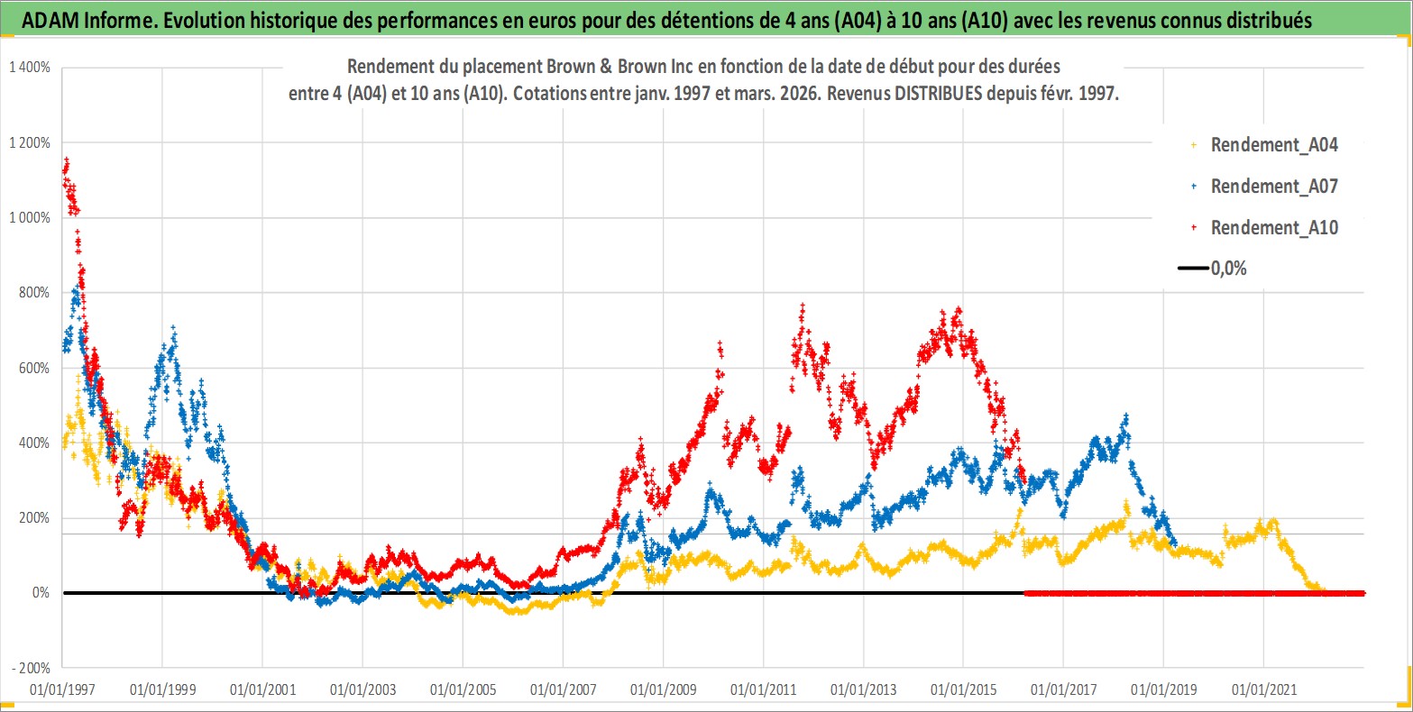 Site dédié aux investisseursPage dédiée sur site financeAnalyse des valorisations hebdomadaires de l'action Brown & Brown Inc. Cet actif est cote en USD. Les valorisations sont en contrevaleur EURO et couvrent les semaines 1997W01 a 2026W13. Les revenus de cet actif financier sont pris en compte depuis la semaine 1997W07. La note globale ESG de cet actif est estimee a 10.0 (apres rebasage entre 0 et 20).