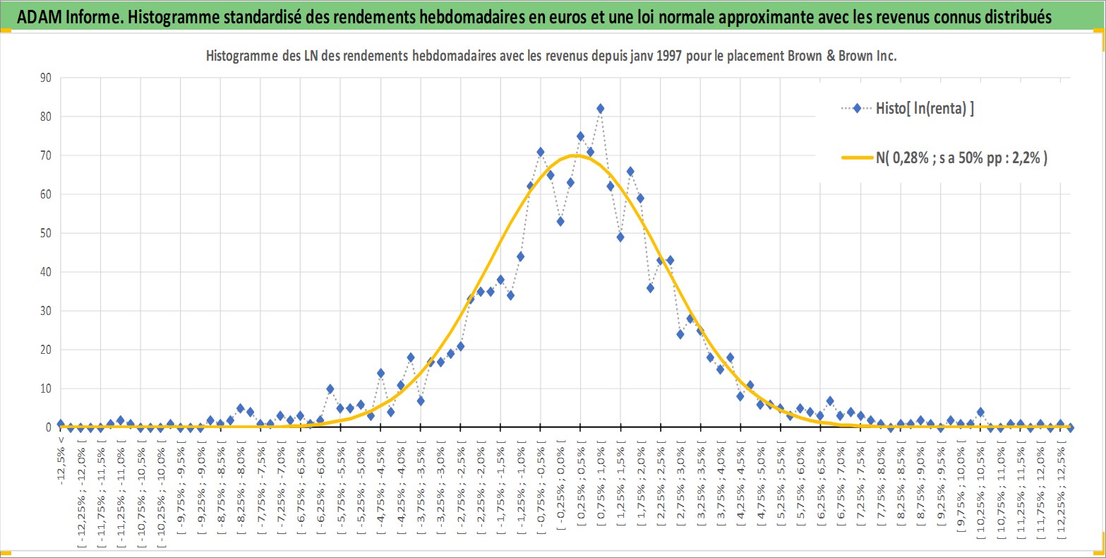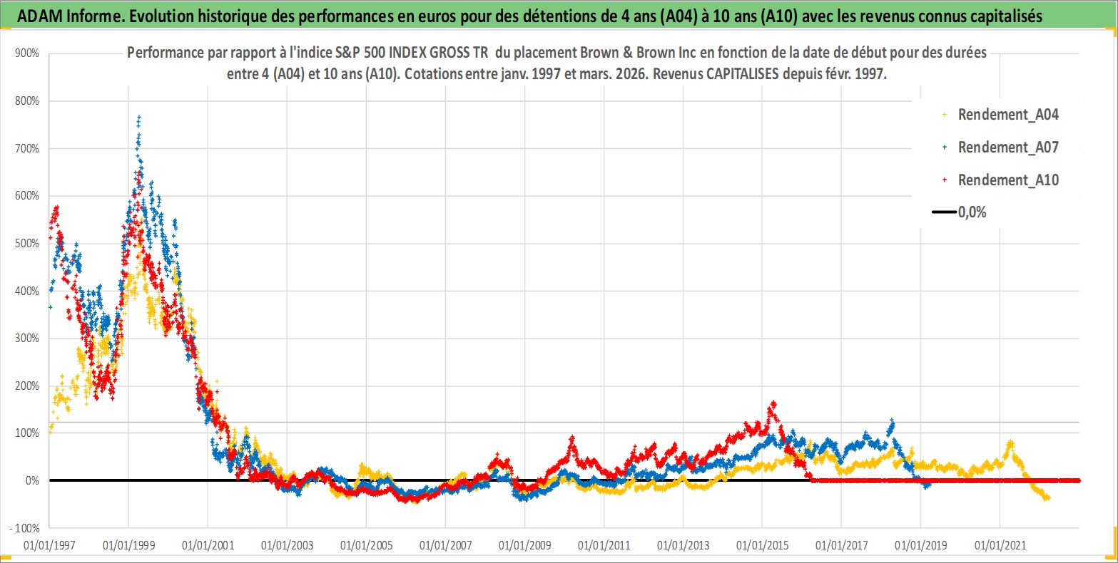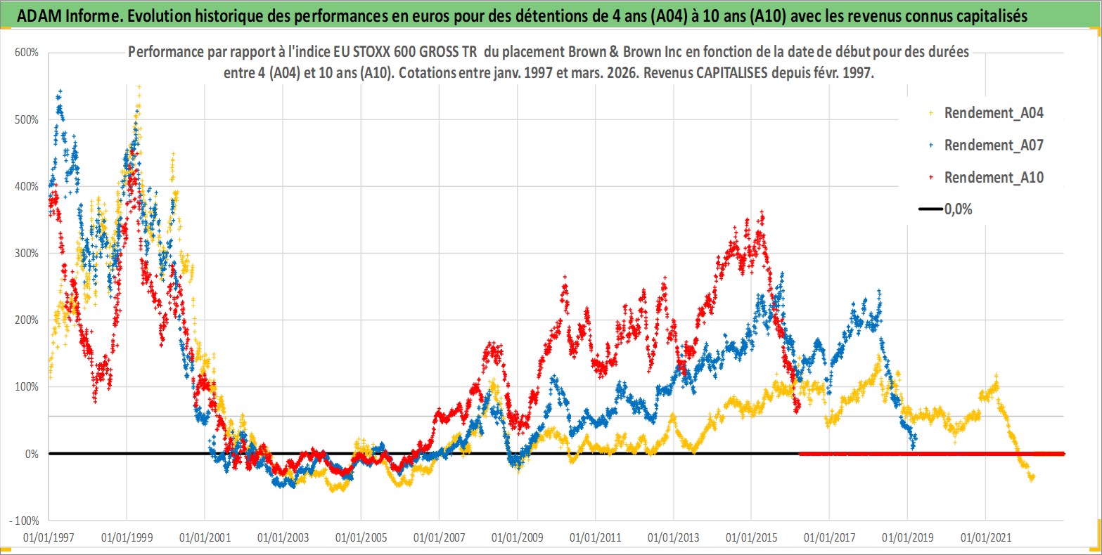 Site dédié aux investisseursPage dédiée sur site financeAnalyse des valorisations hebdomadaires de l'action Brown & Brown Inc. Cet actif est cote en USD. Les valorisations sont en contrevaleur EURO et couvrent les semaines 1997W01 a 2026W13. Les revenus de cet actif financier sont pris en compte depuis la semaine 1997W07. La note globale ESG de cet actif est estimee a 10.0 (apres rebasage entre 0 et 20).