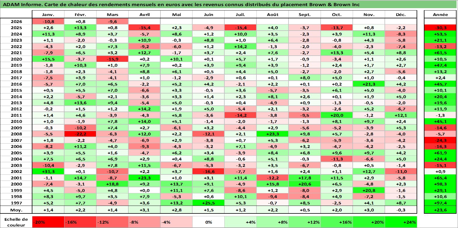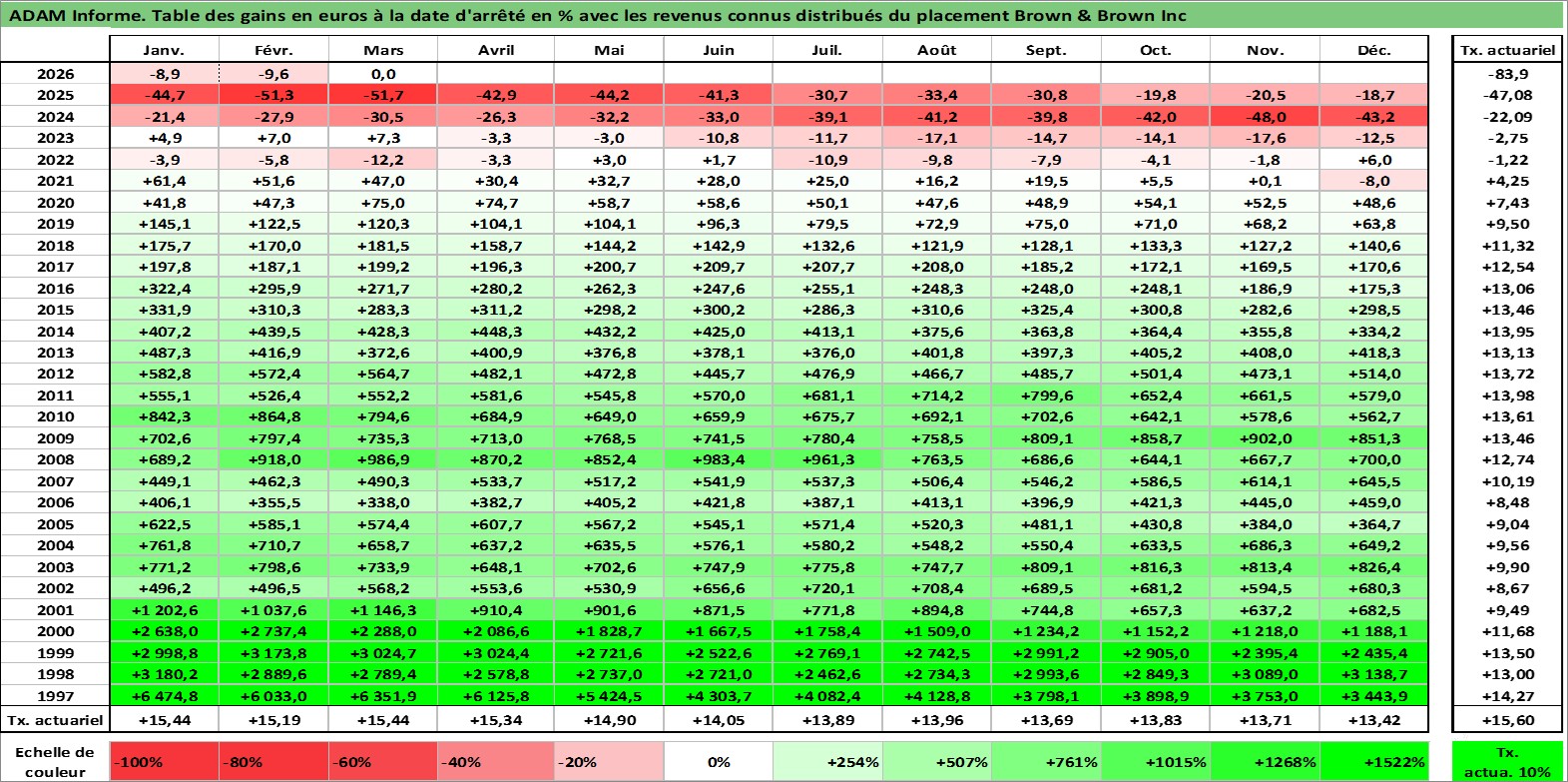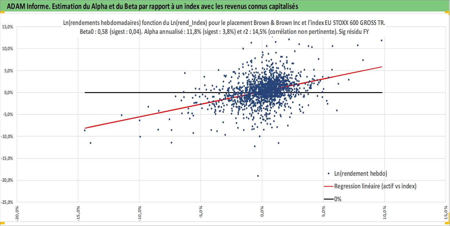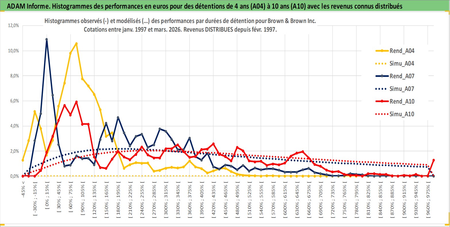 Site dédié aux investisseursPage dédiée sur site financeAnalyse des valorisations hebdomadaires de l'action Brown & Brown Inc. Cet actif est cote en USD. Les valorisations sont en contrevaleur EURO et couvrent les semaines 1997W01 a 2026W13. Les revenus de cet actif financier sont pris en compte depuis la semaine 1997W07. La note globale ESG de cet actif est estimee a 10.0 (apres rebasage entre 0 et 20).