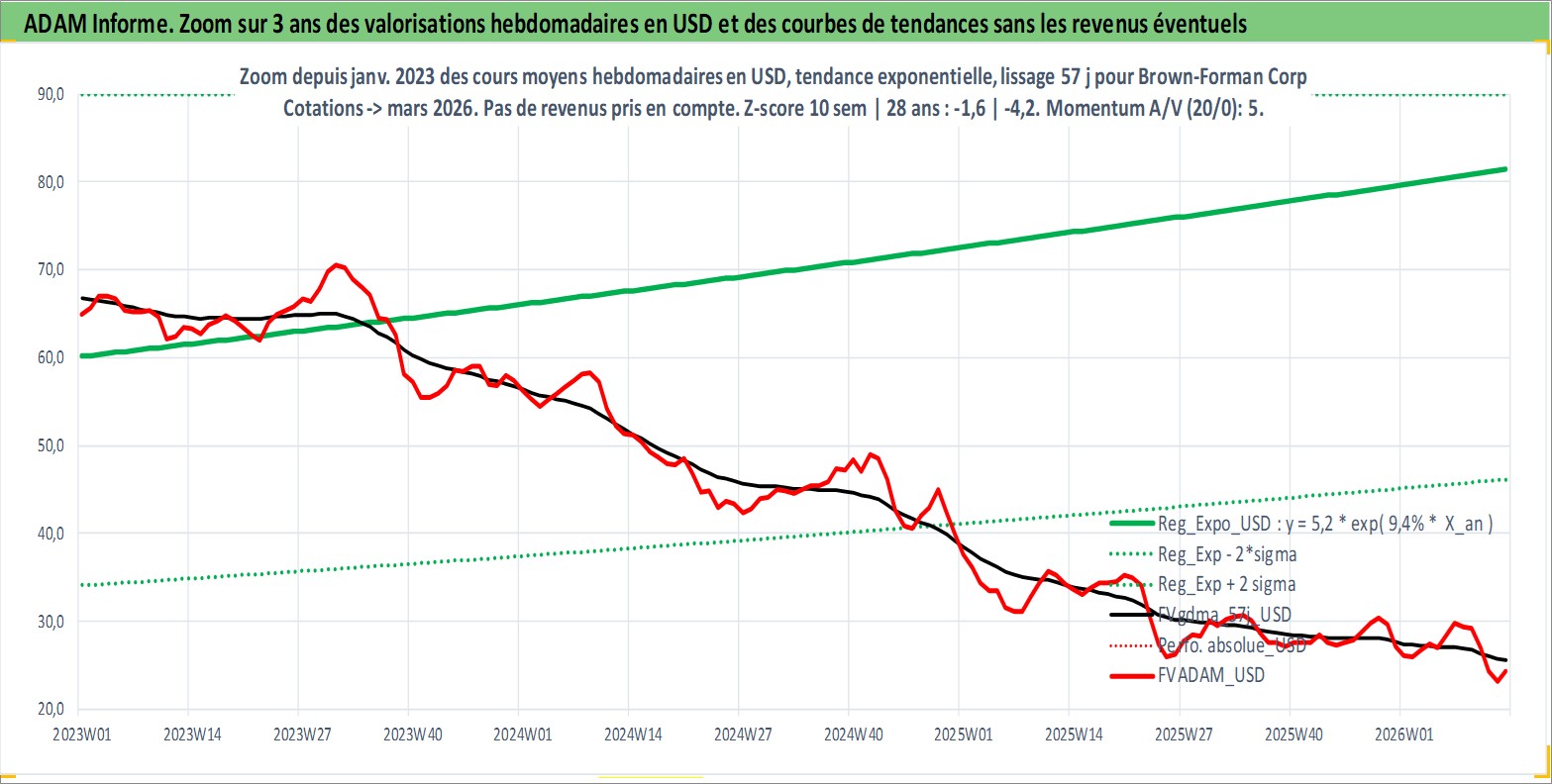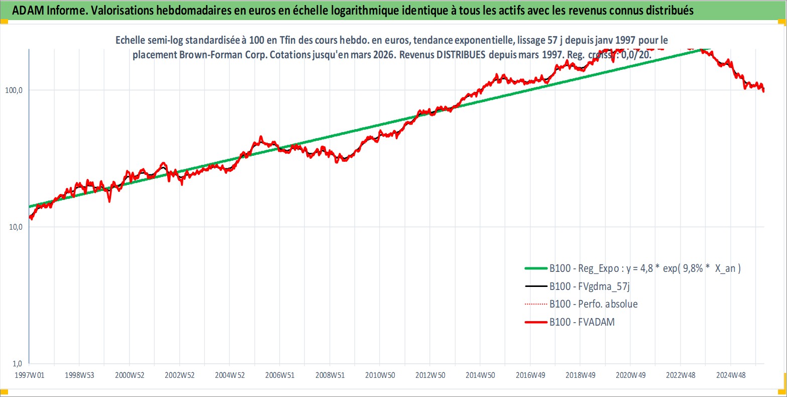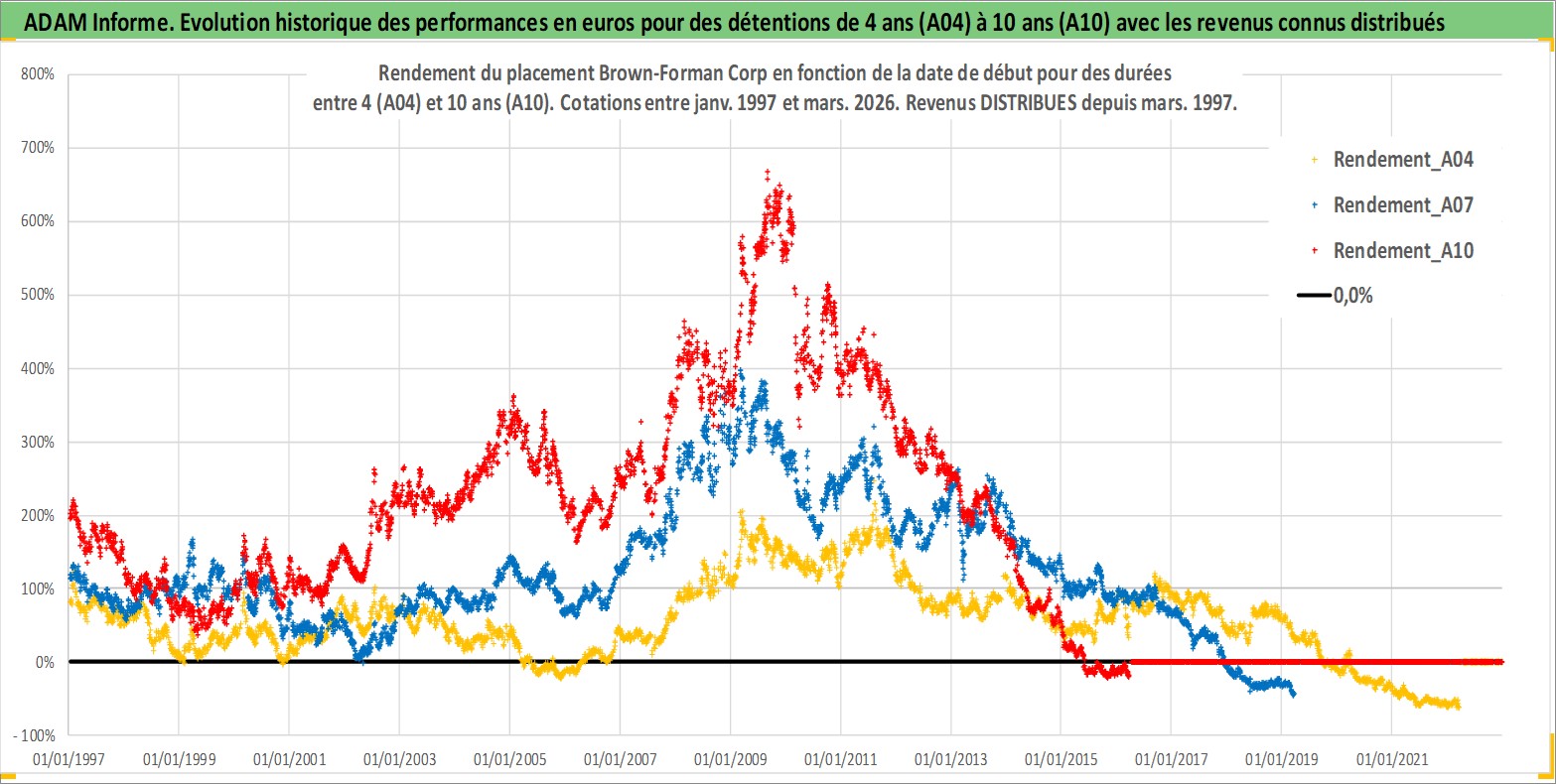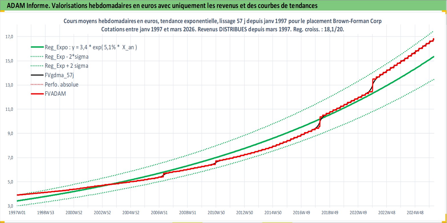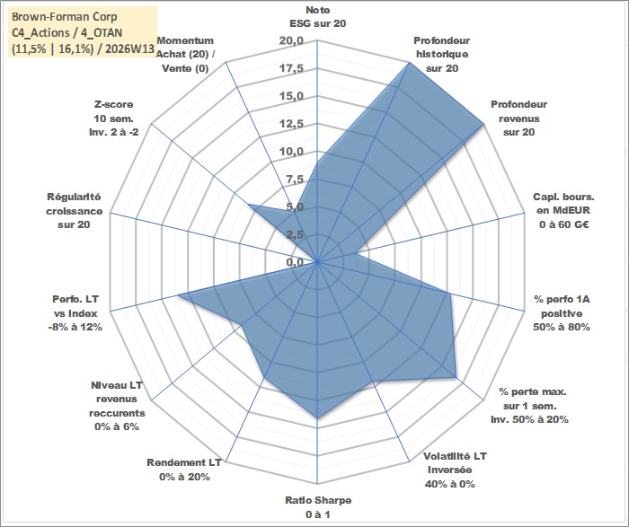 Site dédié aux investisseursPage dédiée sur site financeAnalyse des valorisations hebdomadaires de l'action Brown-Forman Corp. Cet actif est cote en USD. Les valorisations sont en contrevaleur EURO et couvrent les semaines 1997W01 a 2026W13. Les revenus de cet actif financier sont pris en compte depuis la semaine 1997W10. La note globale ESG de cet actif est estimee a 9.0 (apres rebasage entre 0 et 20).