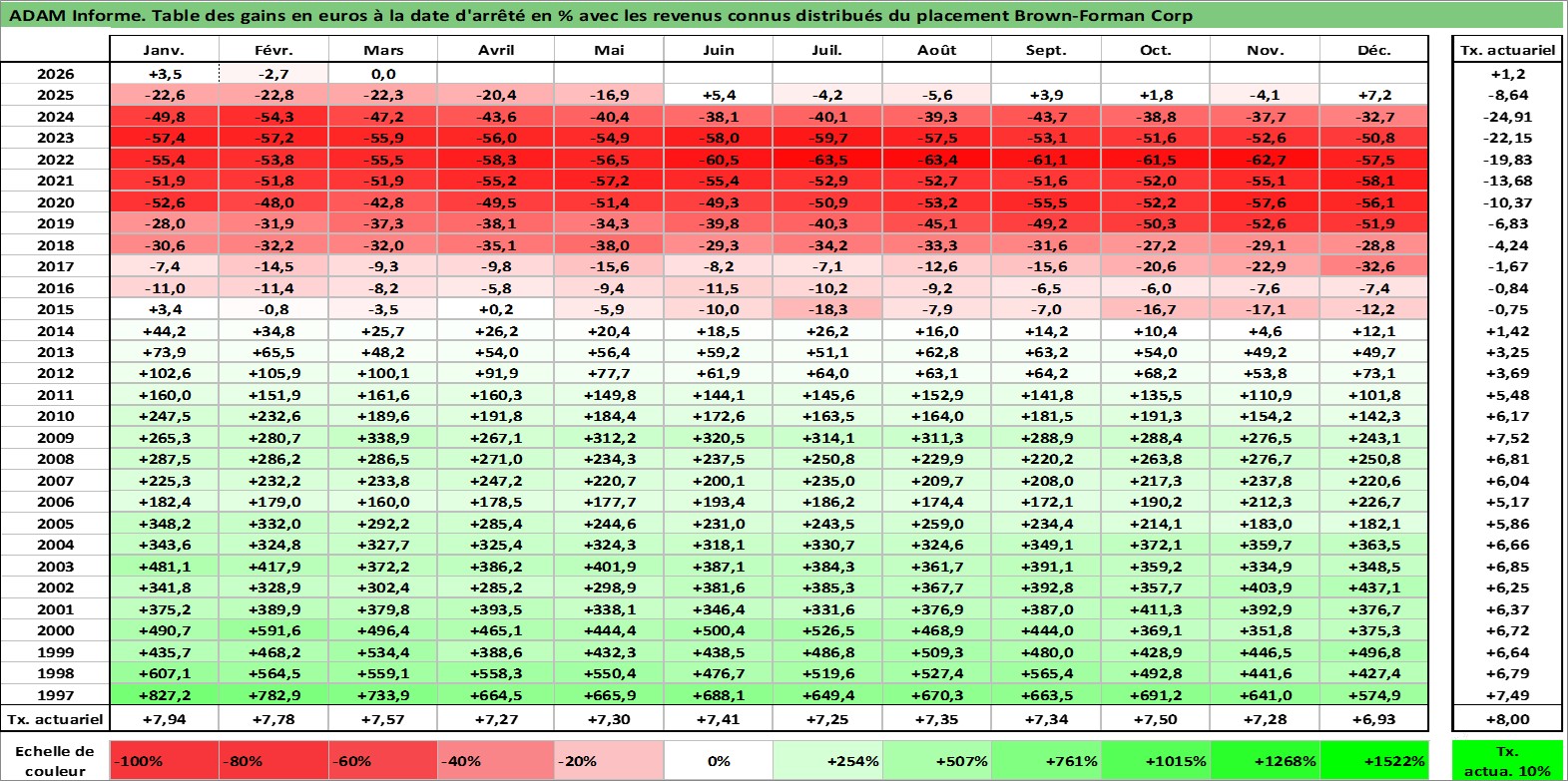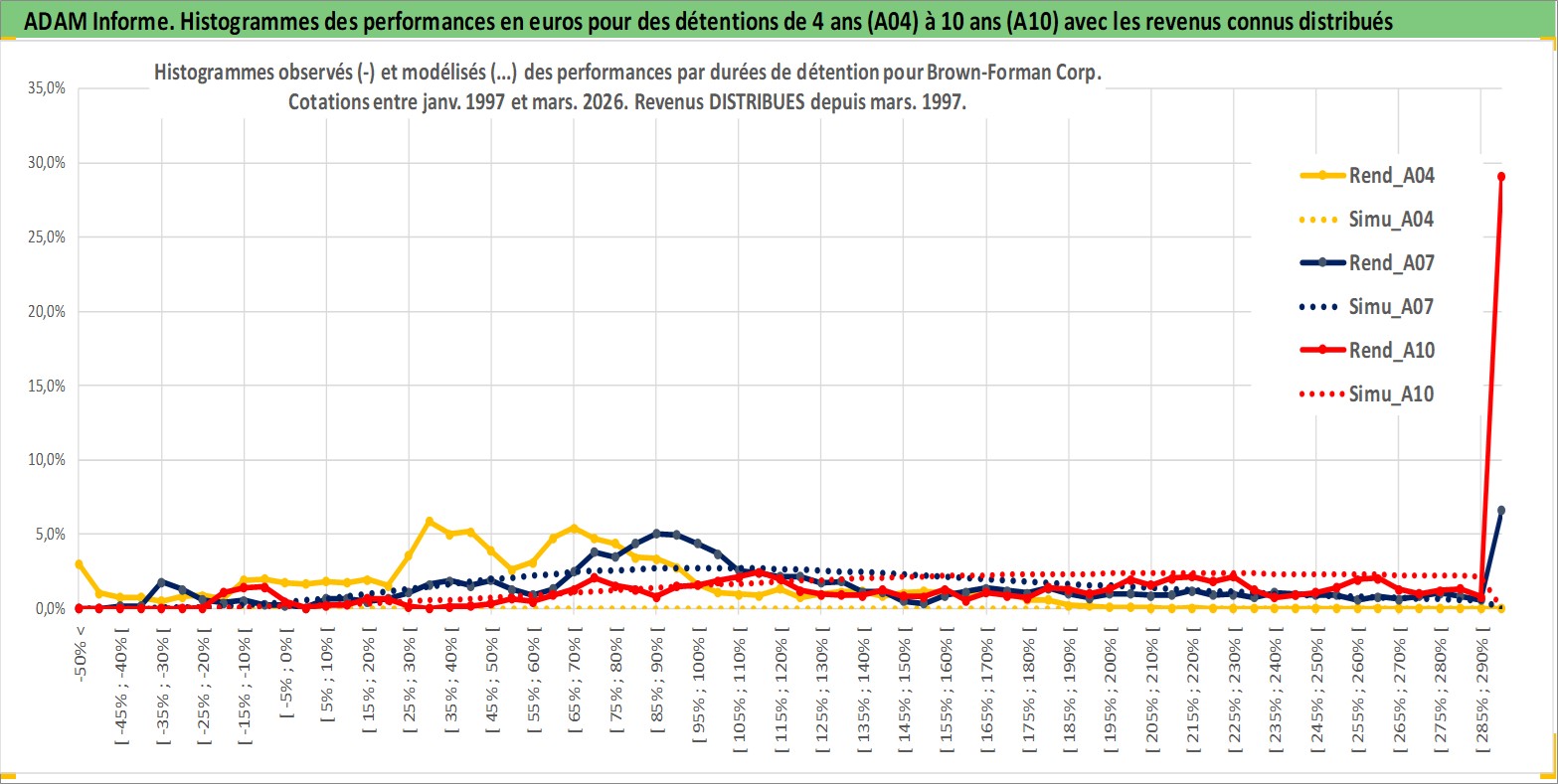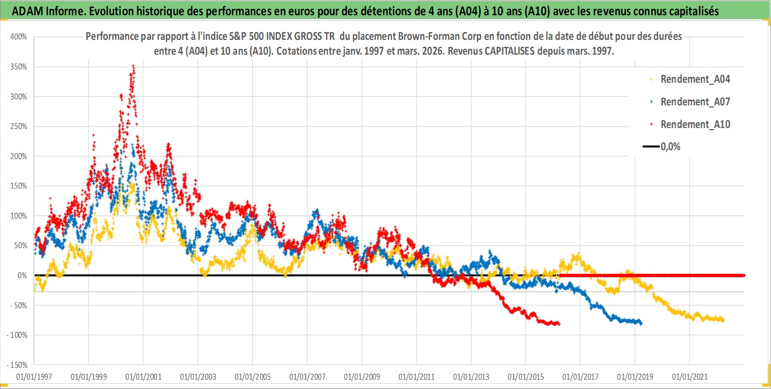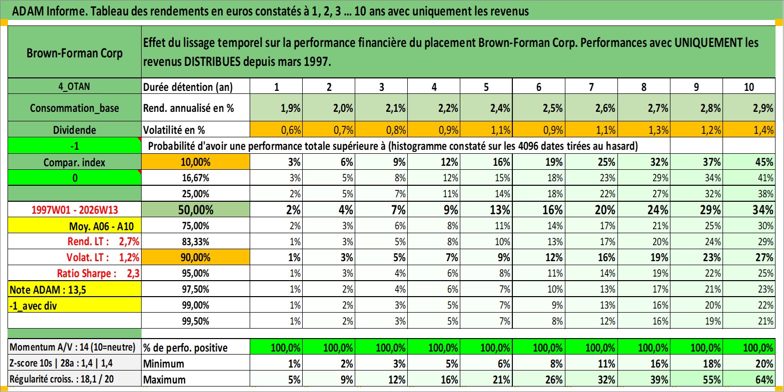 Site dédié aux investisseursPage dédiée sur site financeAnalyse des valorisations hebdomadaires de l'action Brown-Forman Corp. Cet actif est cote en USD. Les valorisations sont en contrevaleur EURO et couvrent les semaines 1997W01 a 2026W13. Les revenus de cet actif financier sont pris en compte depuis la semaine 1997W10. La note globale ESG de cet actif est estimee a 9.0 (apres rebasage entre 0 et 20).
